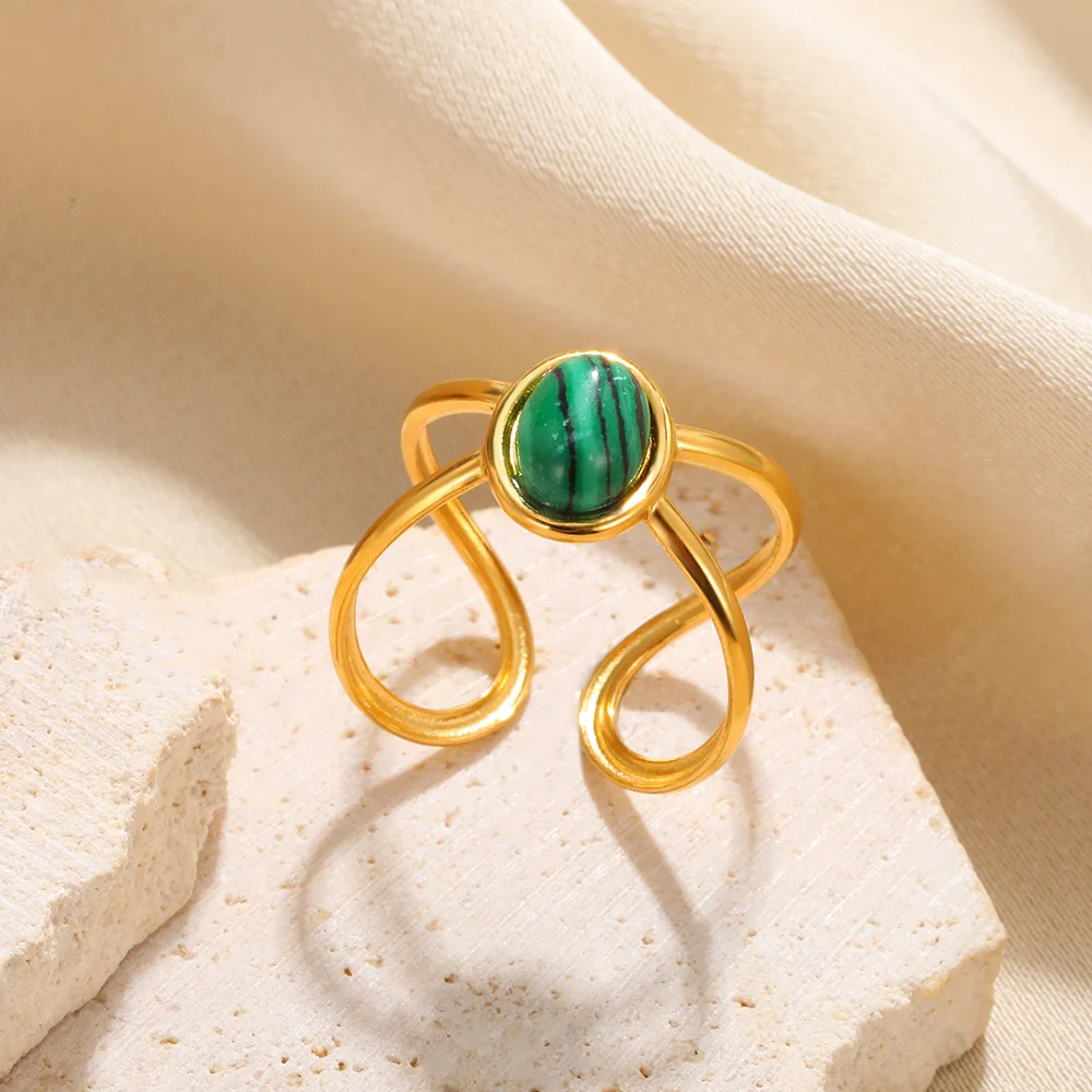 Leur design varie de la pièce simple à celle sculptée en forme de soleil. Leurs pierres malachite amènent une pointe de couleur qui les sublime.