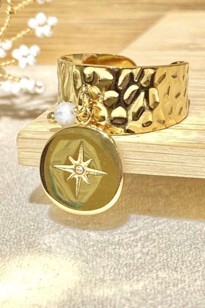 Une bague large en métal doré, martelé, décorée d’une étoile et d’une pierre blanche. Elle est élégante et confortable, parfaite pour compléter le style bohème de la femme qui sommeille en vous.