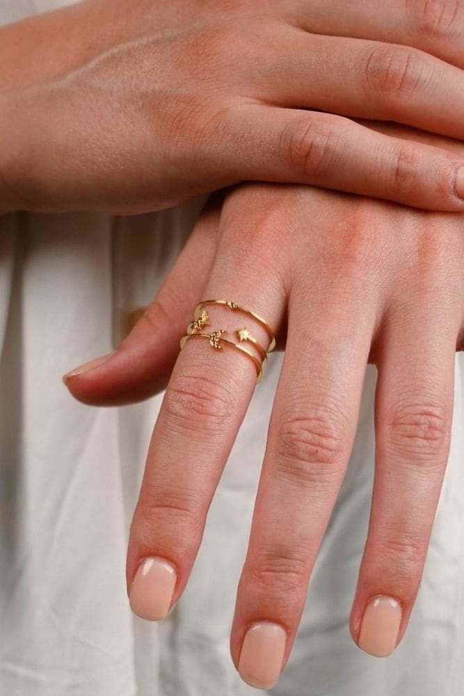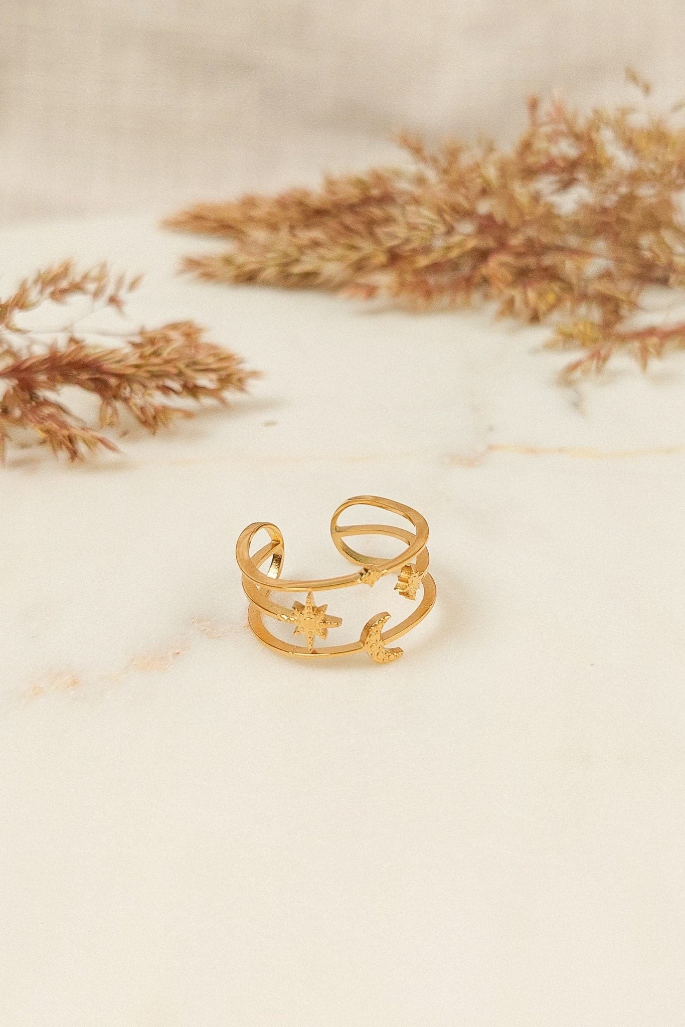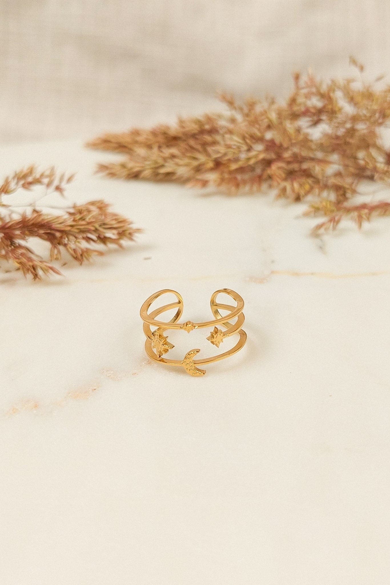 Ce bijou minimaliste offre un magnifique décor céleste autour du doigt. Son design est composé de trois rangs ornés d’une lune et d’étoiles, et est façonné pour être ajustable. Une bague fantaisie bohème qui ajoute une touche de magie à votre look.