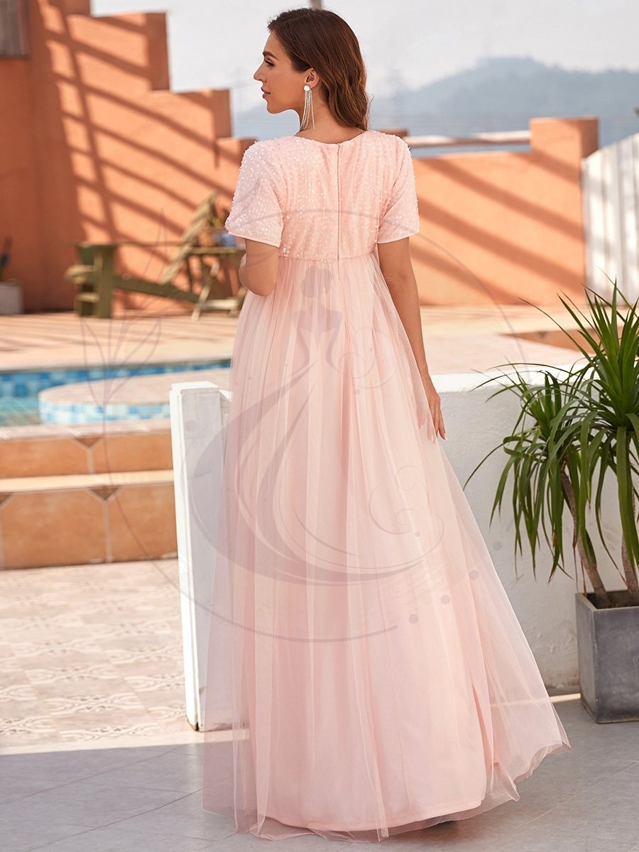 Optez pour cette magnifique robe de grossesse avec un décolleté en V et des manches courtes, idéale pour sublimer les silhouettes maternelles lors d’événements distingués. Parée de paillettes délicates sur le haut du vêtement et d’une ample jupe en tulle touchant le sol, elle offre le mélange parfait d’élégance et de confort. Cette pièce ajustée jusqu’à la mi-cuisse procure aisance et fluidité, accompagnant chaque mouvement de la future mère avec grâce.