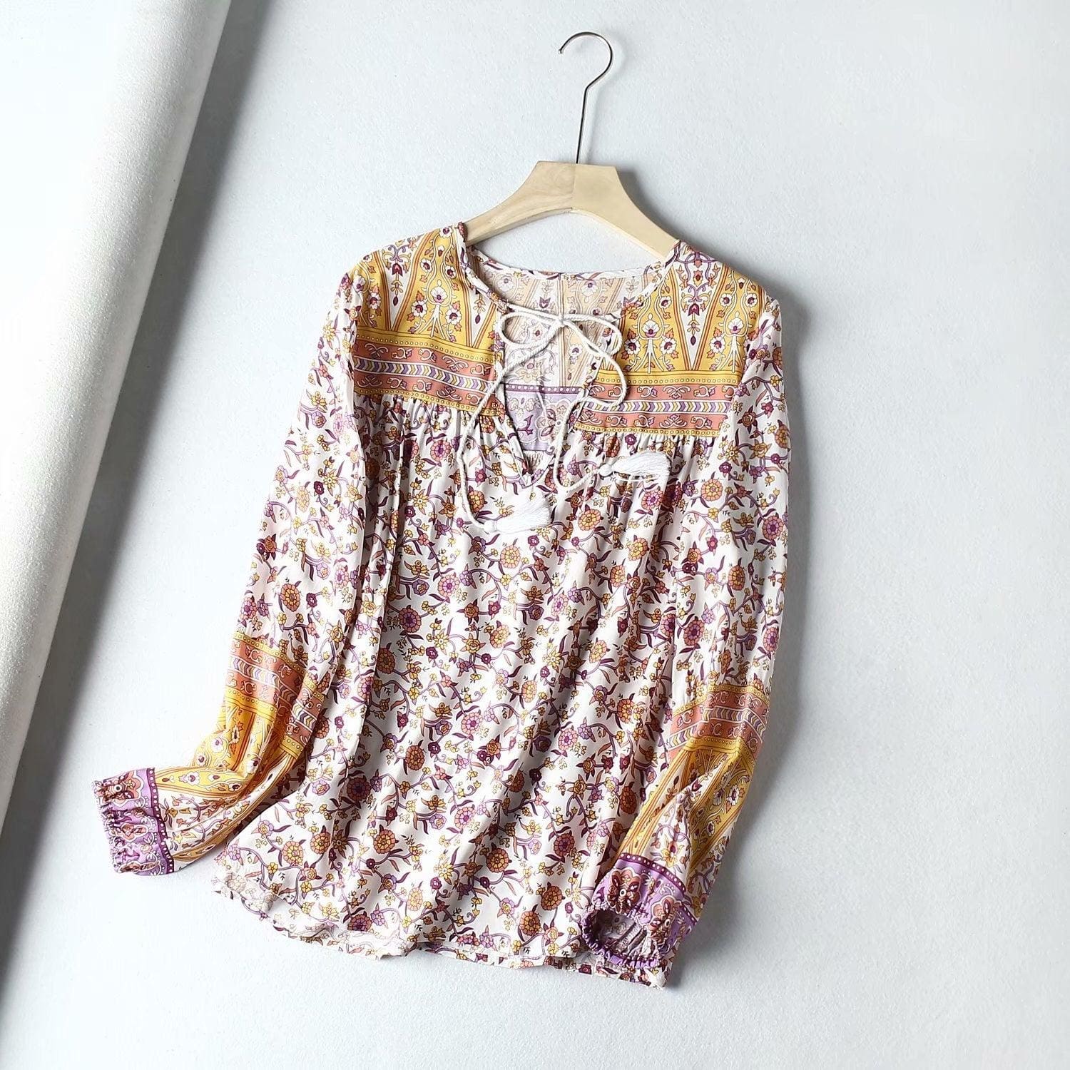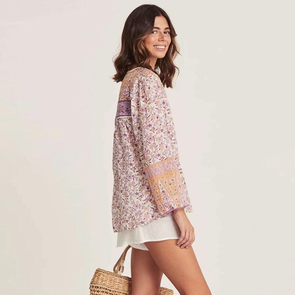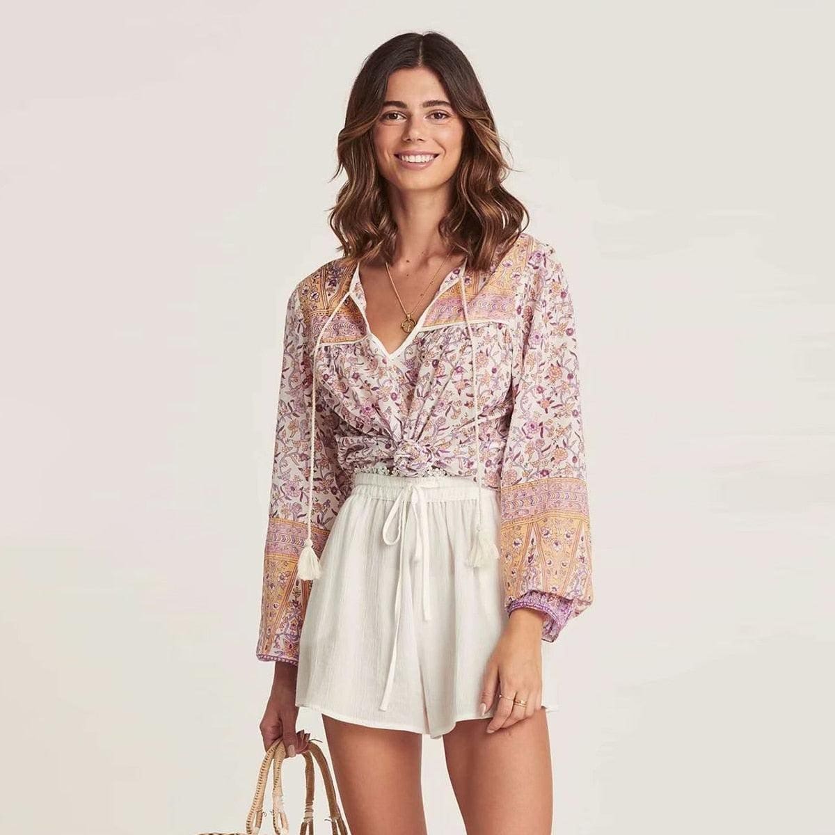 Blouse féminine dans un style bohème avec des manches longues. Dans des tons rosés et illuminée par un jaune aux épaules et à l’extrémité des manches, cette blouse en tissu cotonné à motifs floraux est élégante avec une jupe courte ou un short en jean. L’encolure en V est soulignée par un lien à pompons blanc.