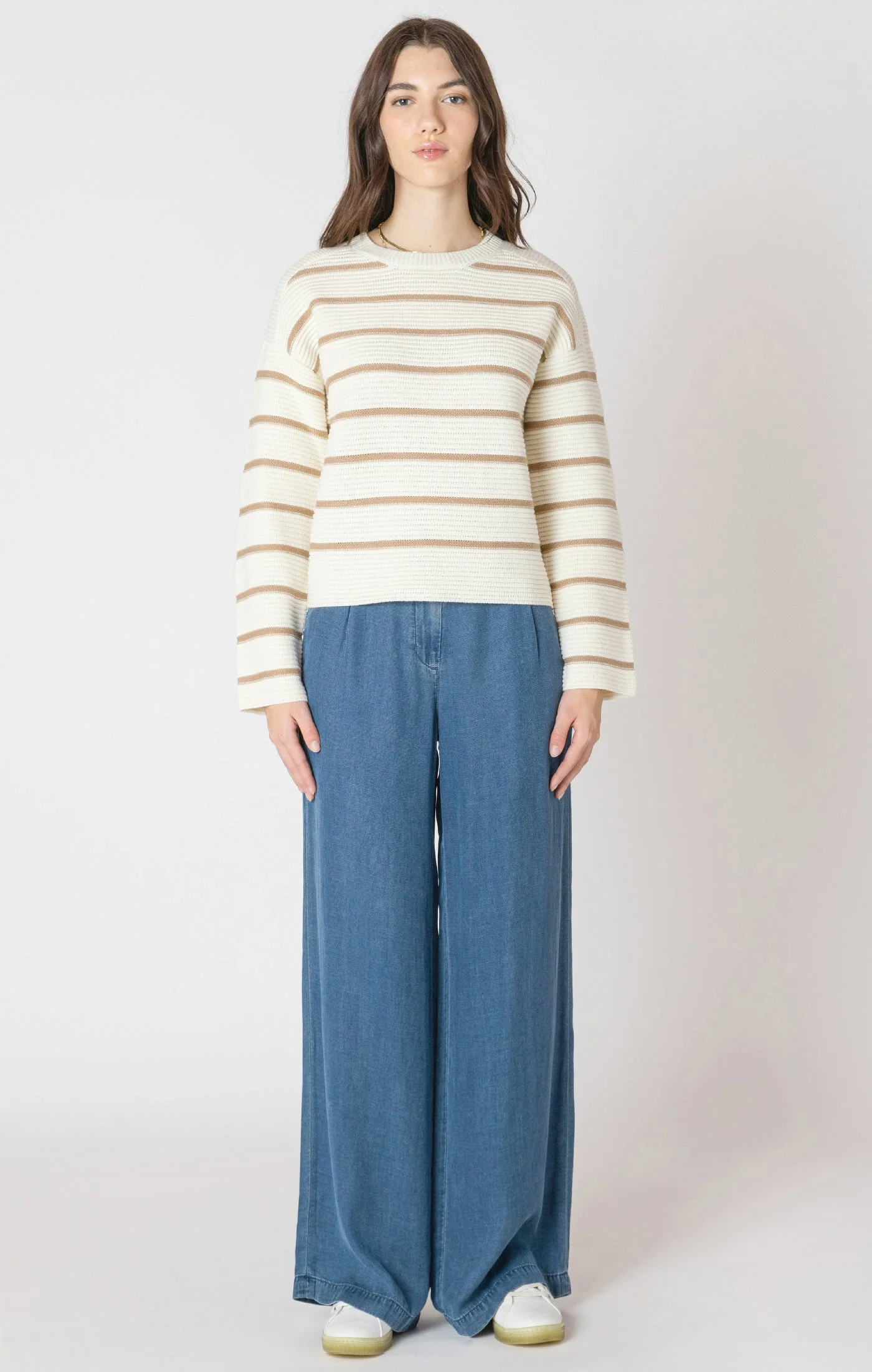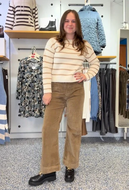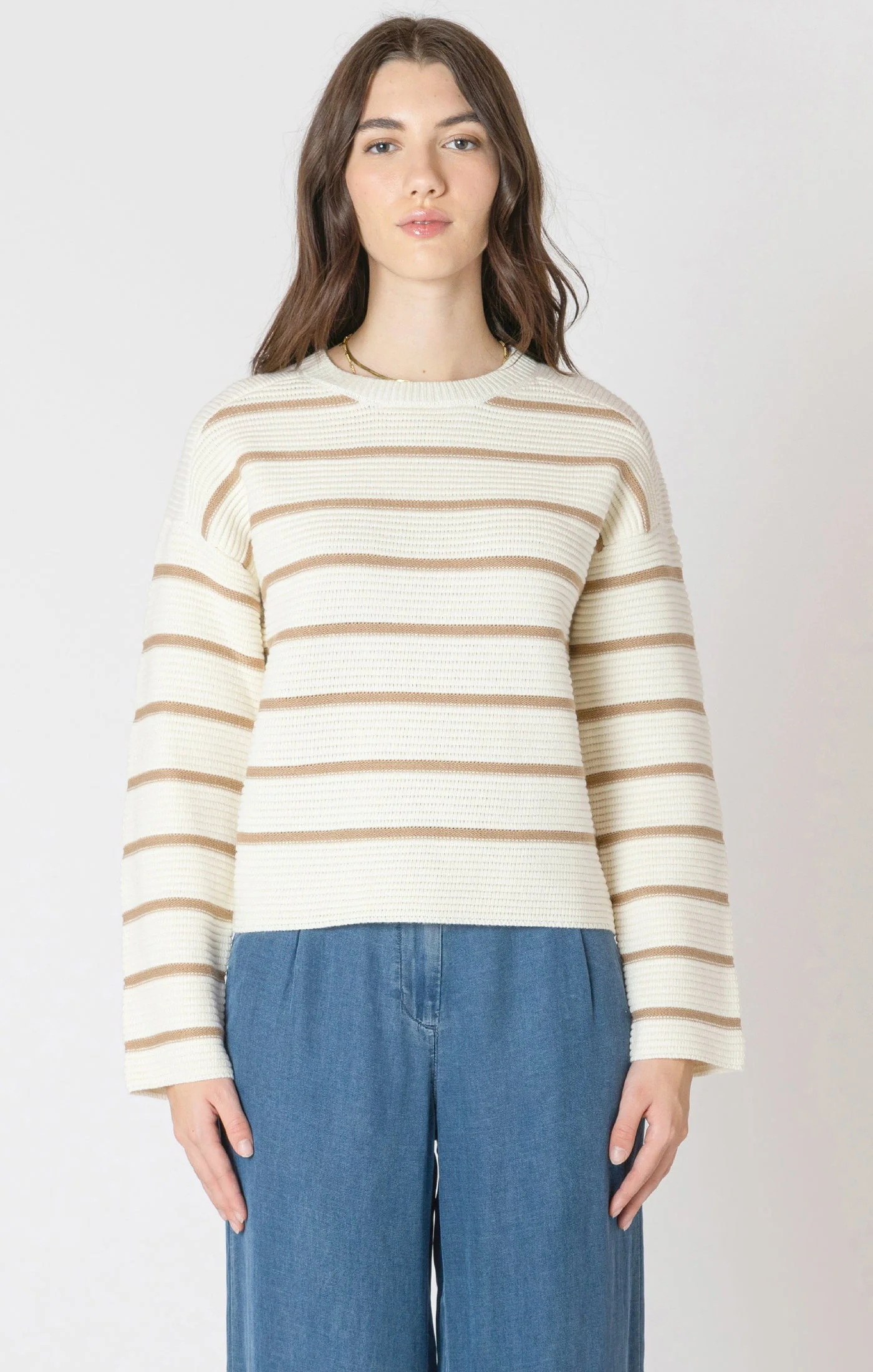 Ce chandail à col rond séduit par son tricot texturé doux et ses rayures beiges délicates sur un fond ivoire. Sa coupe classique et sa palette neutre en font une pièce facile à porter au quotidien, parfaite pour créer des looks doux et lumineux.