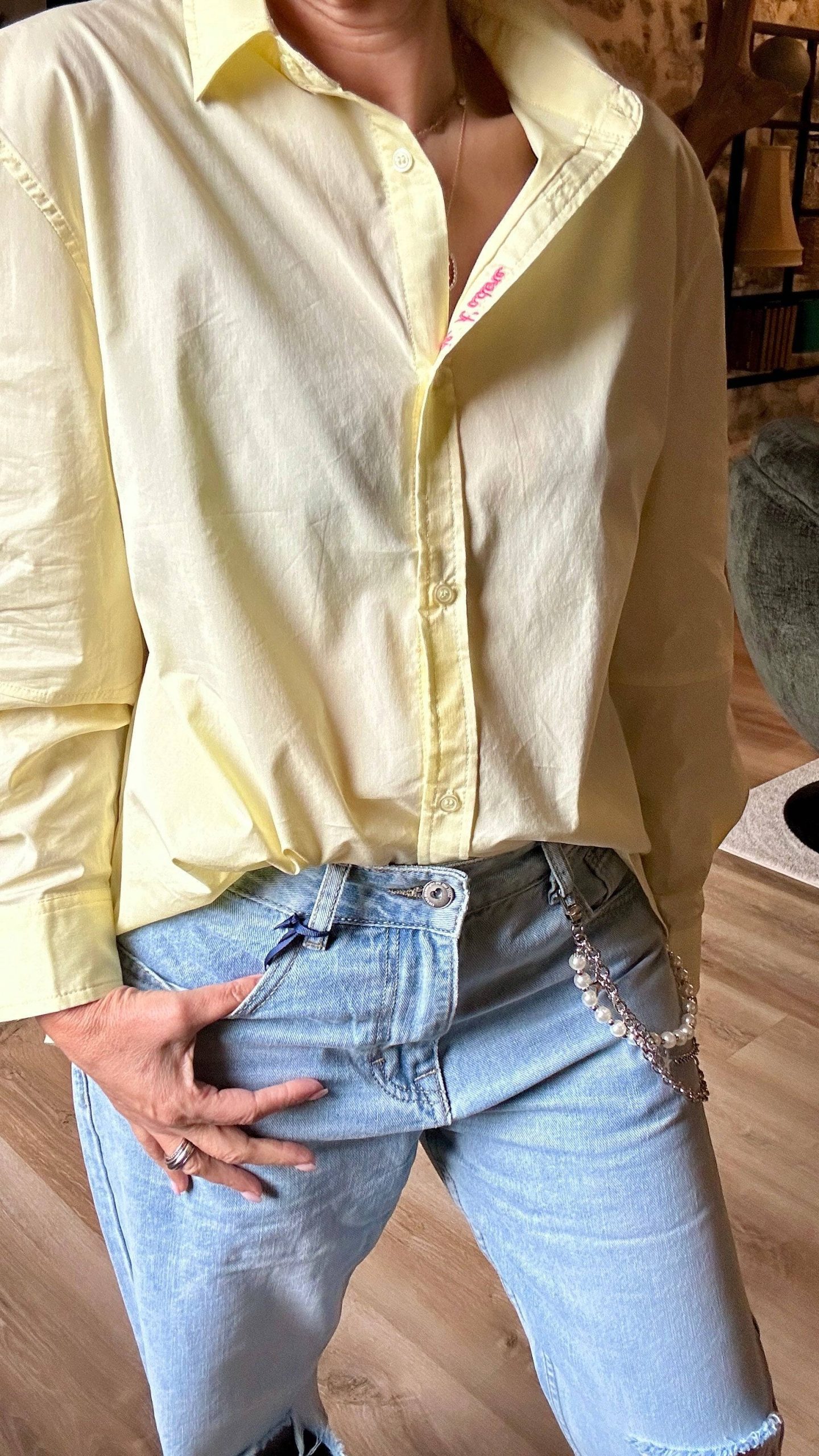 La chemise Émilie, conçue par la marque Adoré, se distingue par sa couleur jaune beurre, incontournable des collections printemps-été 2025. Avec sa coupe normale et son élégante broderie rose « Je t’adore » à l’intérieur du col, elle incarne le chic décontracté pour un look moderne et raffiné. Idéale pour un style casual ou habillé, elle s’associe parfaitement avec un jean ou un pantalon tailleur.