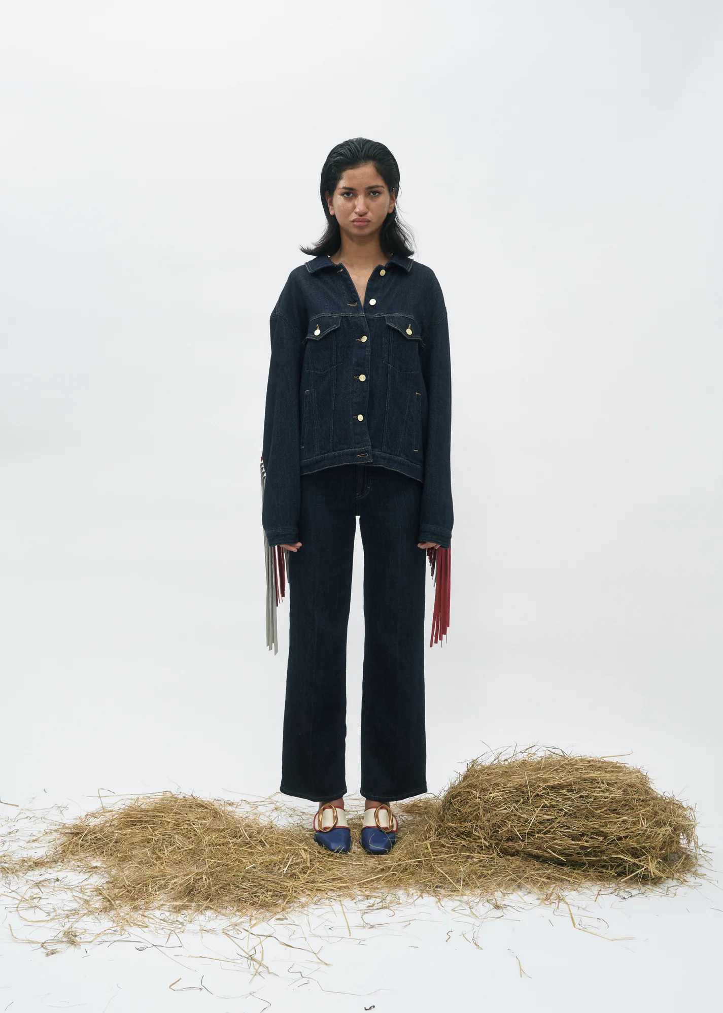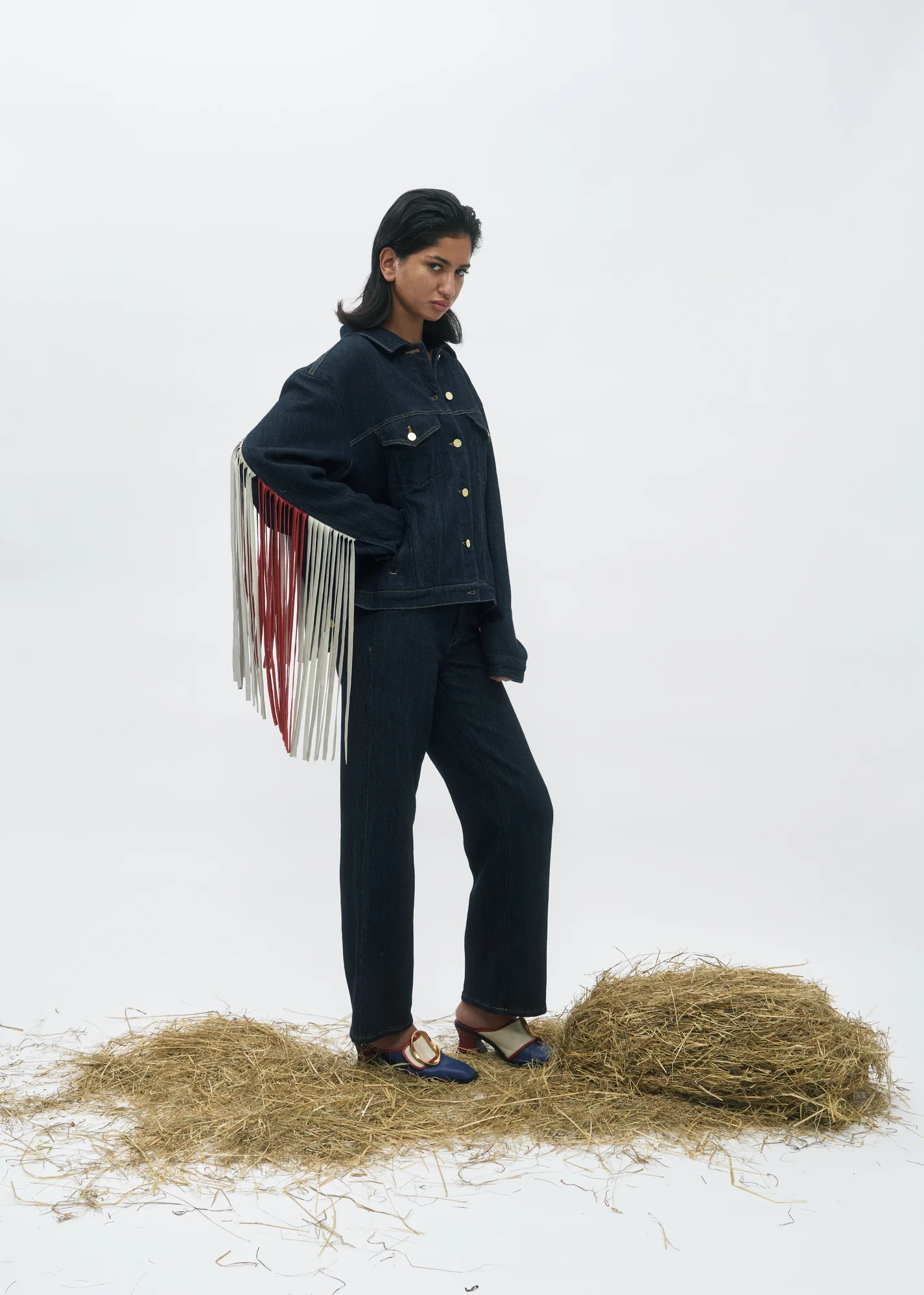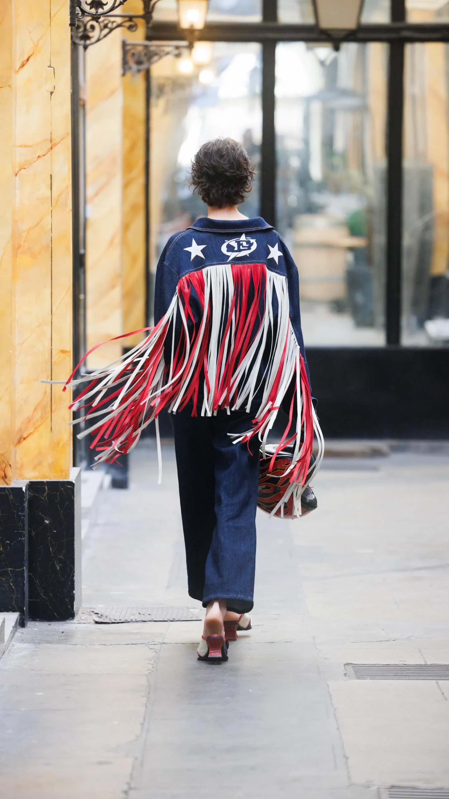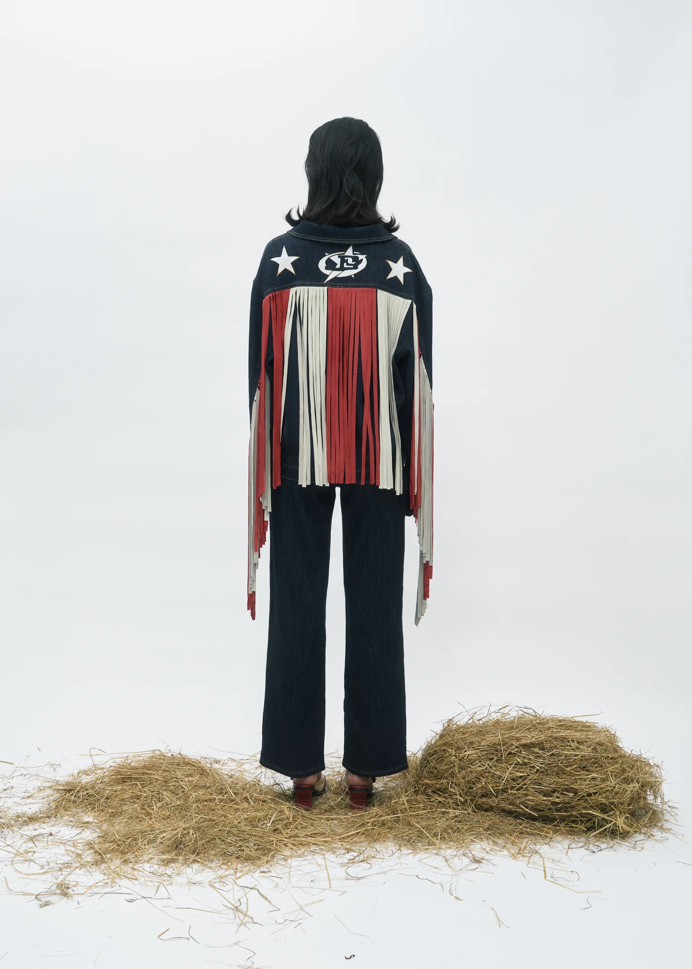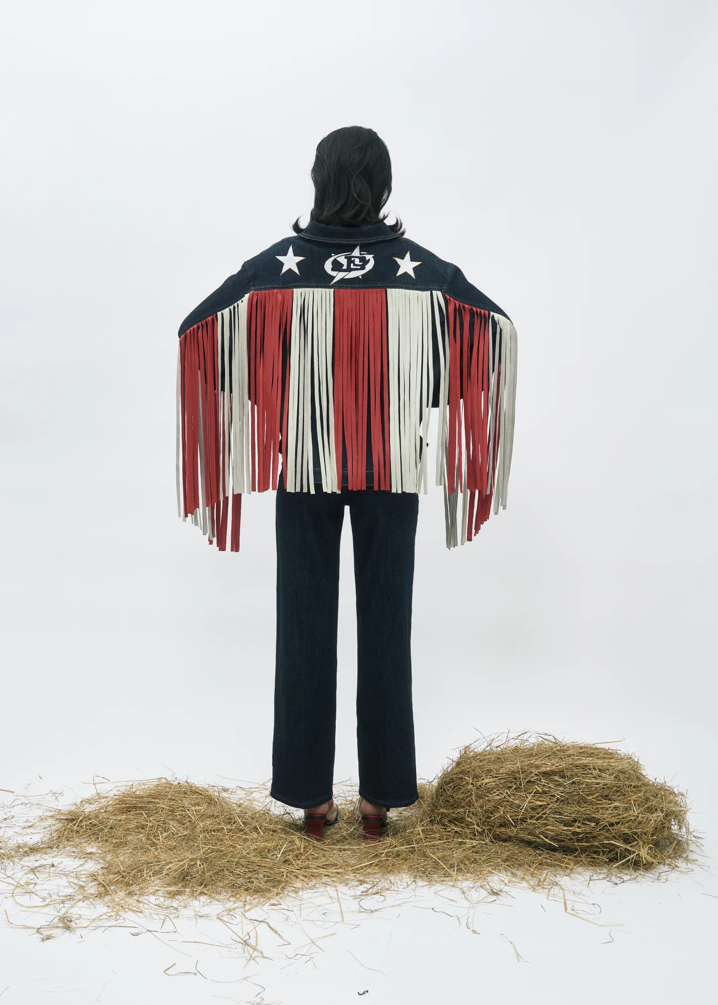 DRIFT JACKET, la veste en denim 3D Brody de Labdip, customisée par Maison J.Simone. Le dos se pare de longues franges bicolores et d’un imprimé étoilé signature, transformant une coupe intemporelle en pièce de rodéo urbain.