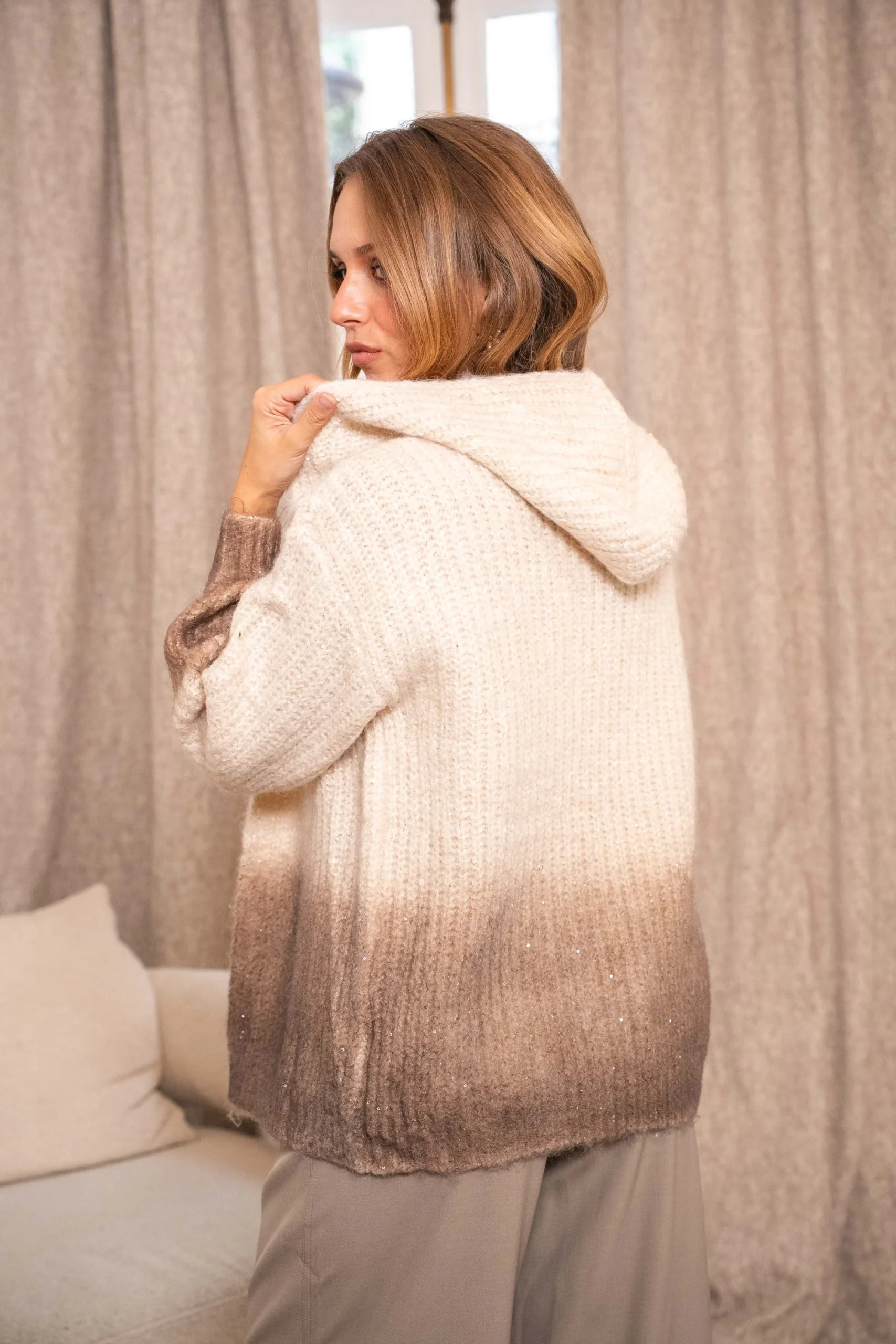 Ce gilet à capuche en maille se distingue par son dégradé moderne et ses touches de fils brillants. Doux et confortable, il est parfait pour réchauffer vos looks tout en ajoutant une note casual-chic. Une pièce cosy à superposer sans modération cet hiver.