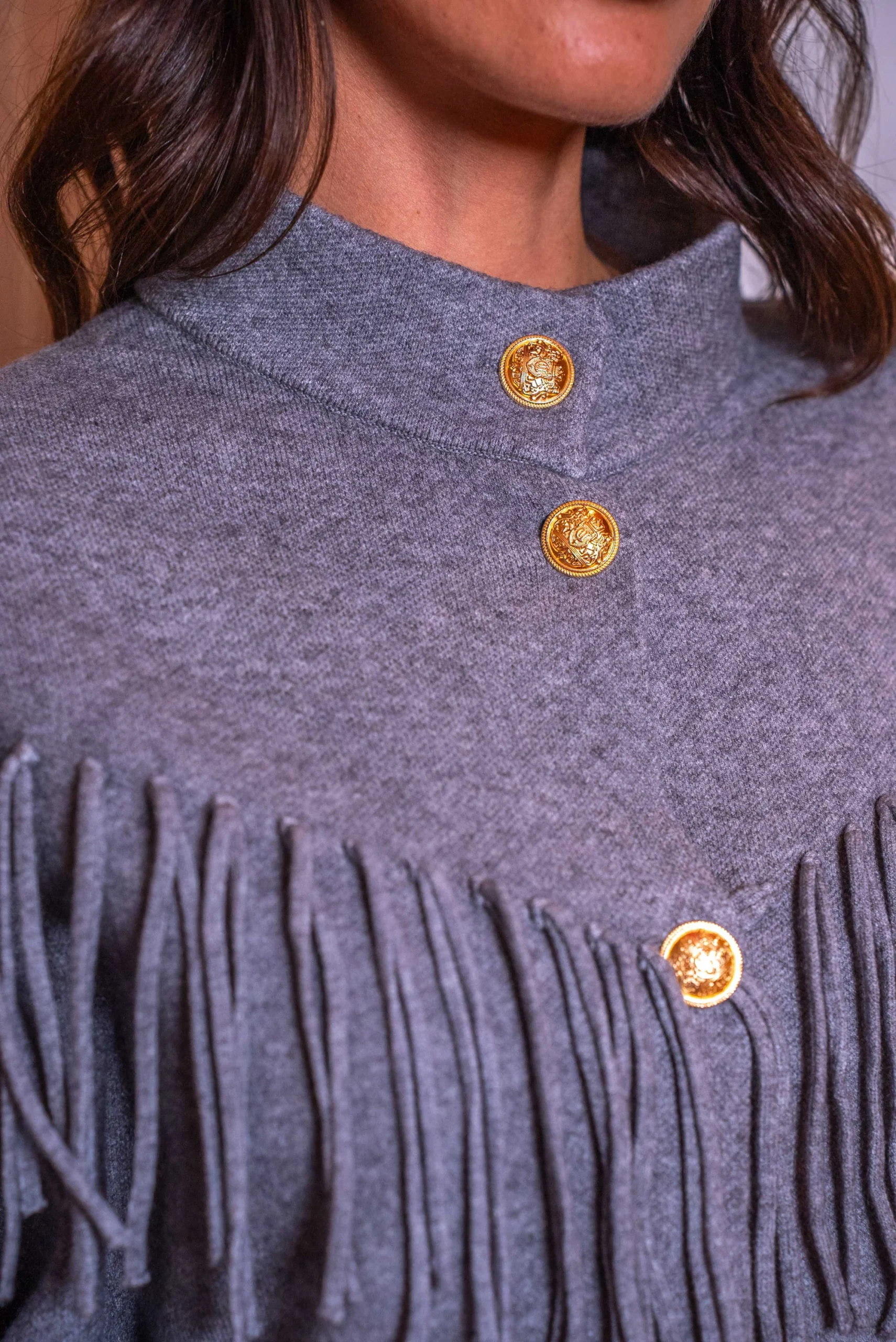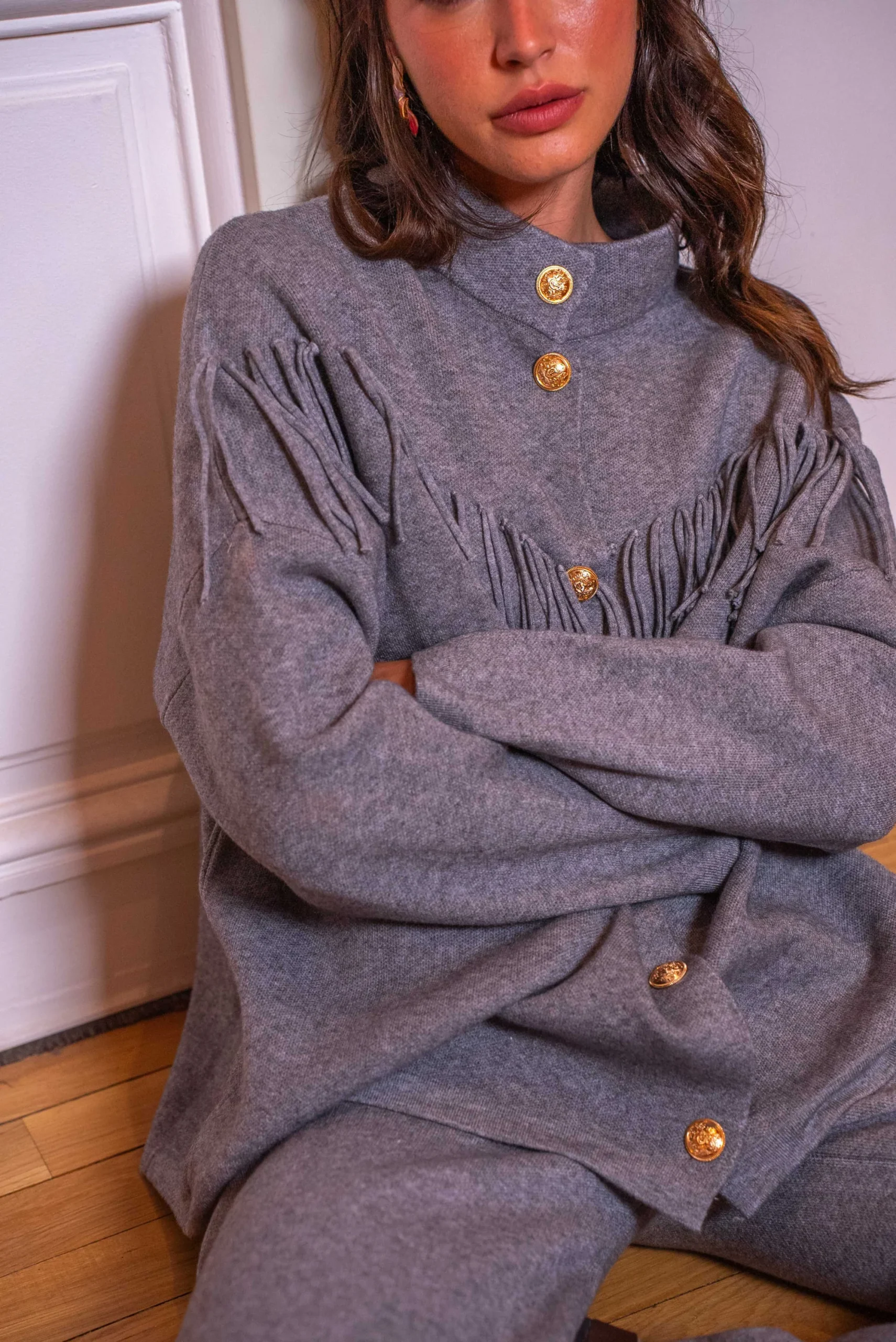 Gilet doux et confortable, mise en valeur par une ligne de franges sur la poitrine pour une touche moderne et originale. Les boutons dorés apportent une finition chic, parfaite pour un look raffiné et tendance.