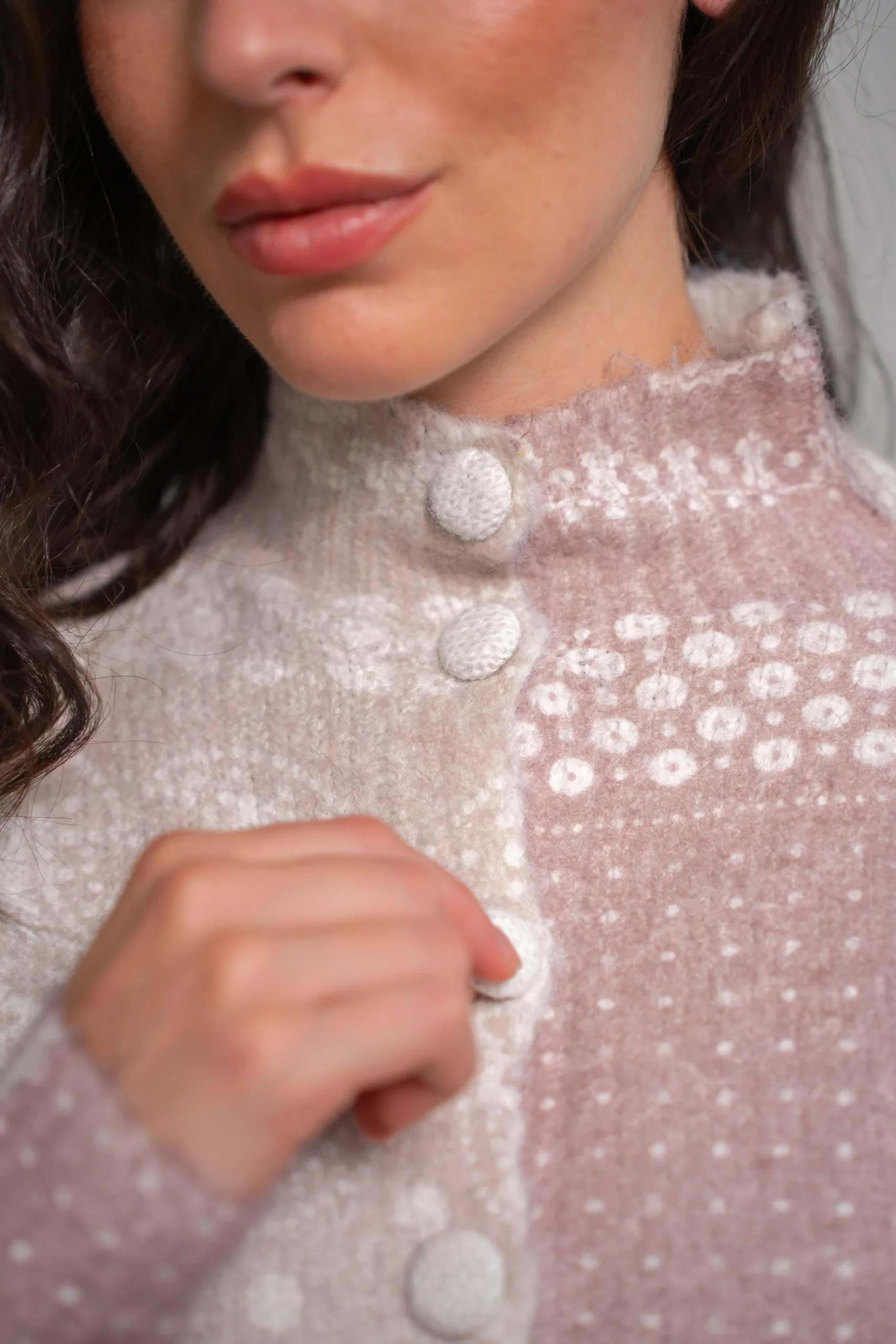 Ce cardigan en maille duveteuse séduit par son jeu de motifs façon patchwork bandana. Fermé par de jolis boutons recouverts de laine, il apporte une touche unique et féminine à vos tenues. Parfait à associer avec un jean pour un look casual chic.