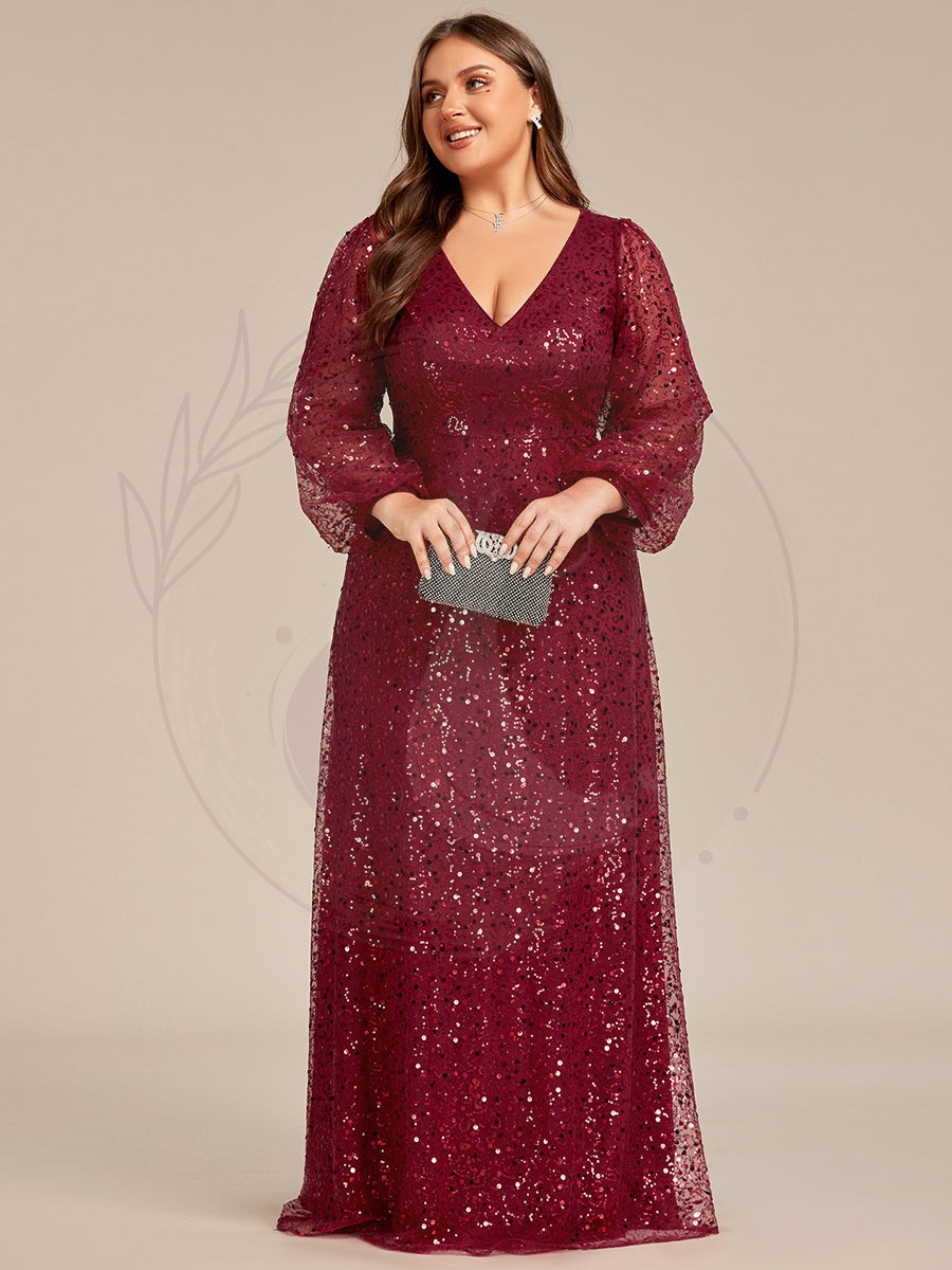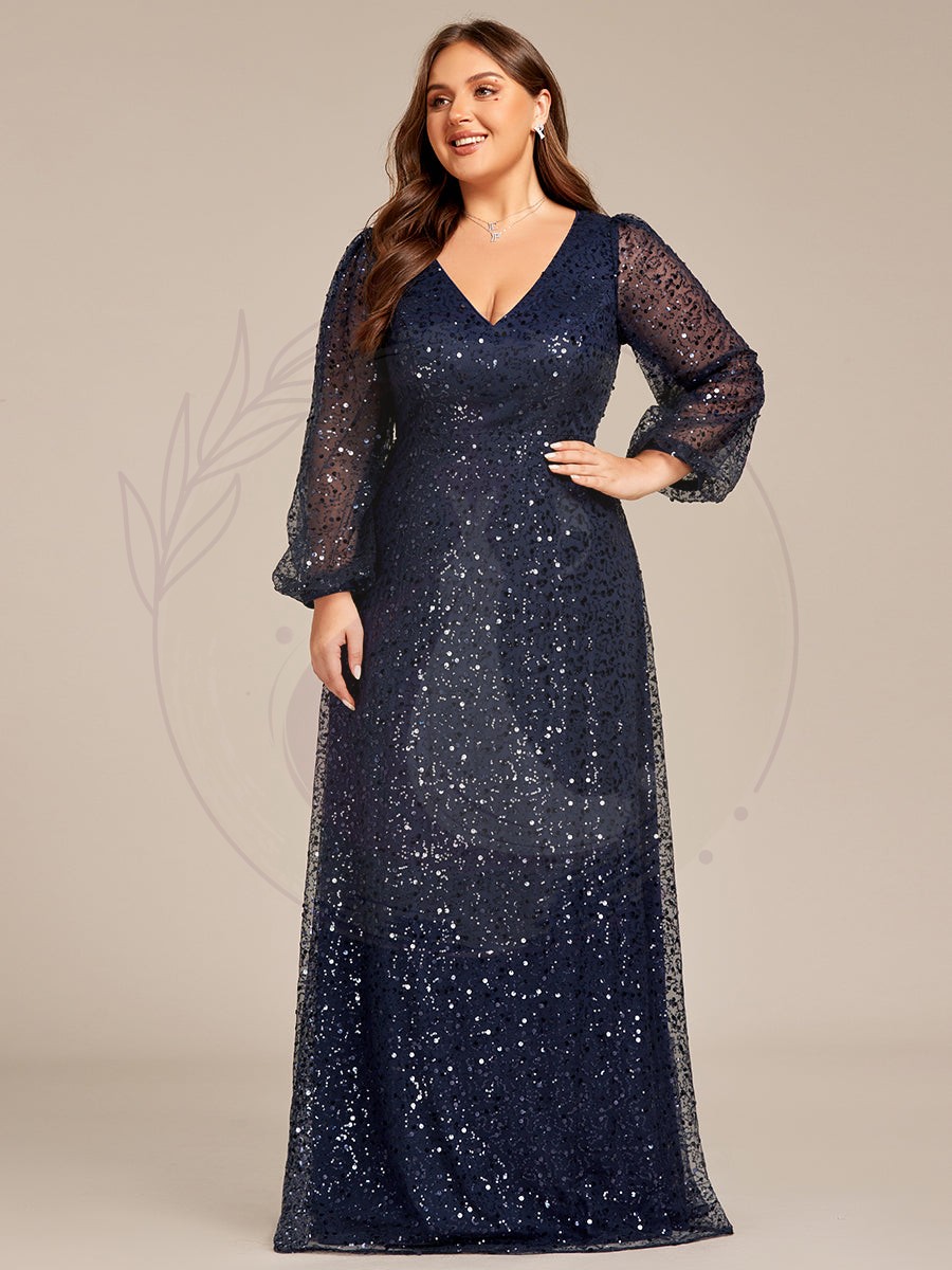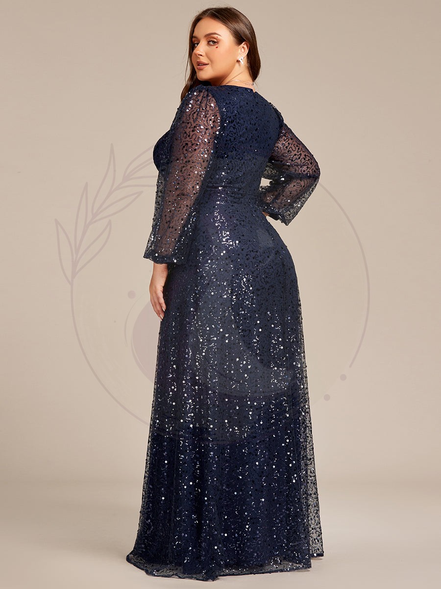 Grande taille Robe de soirée trapèze à paillettes col en V manches longues et paillettes