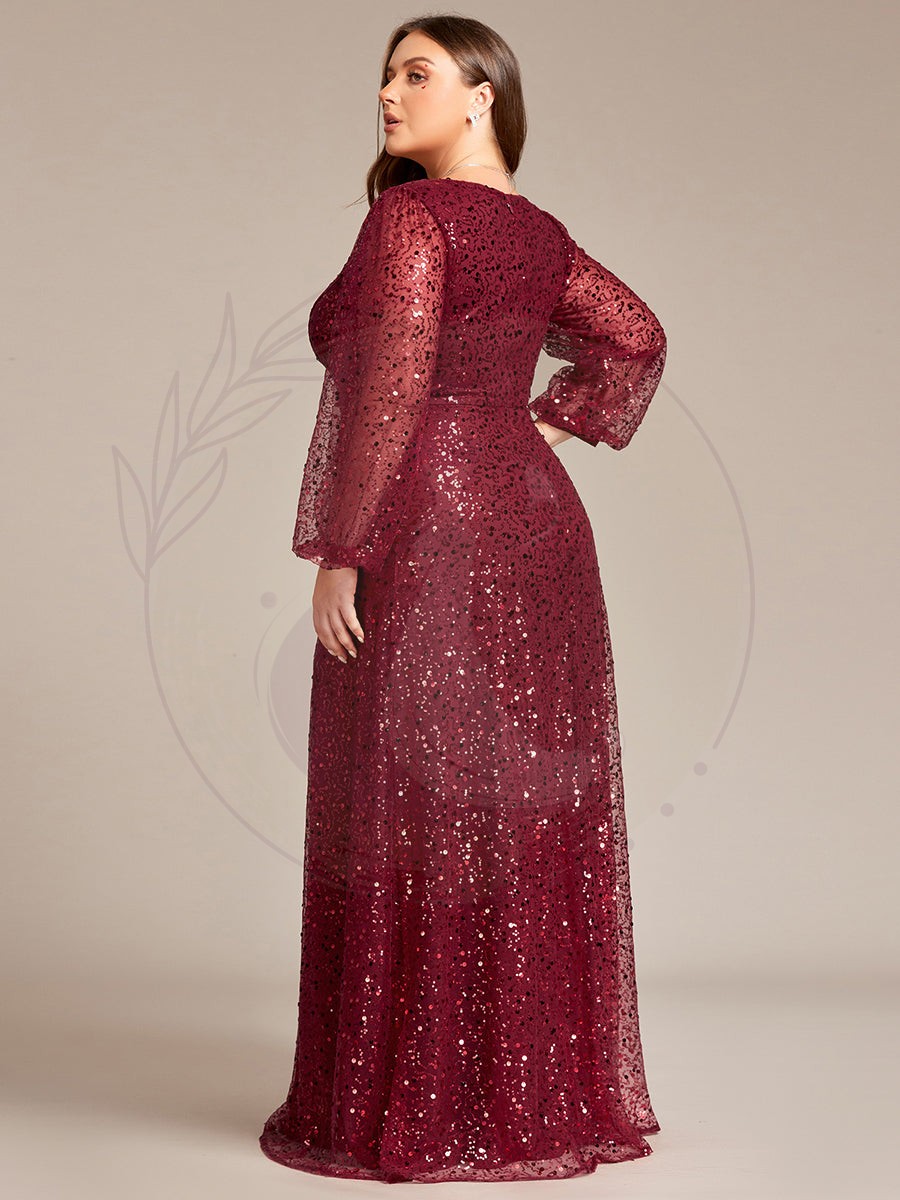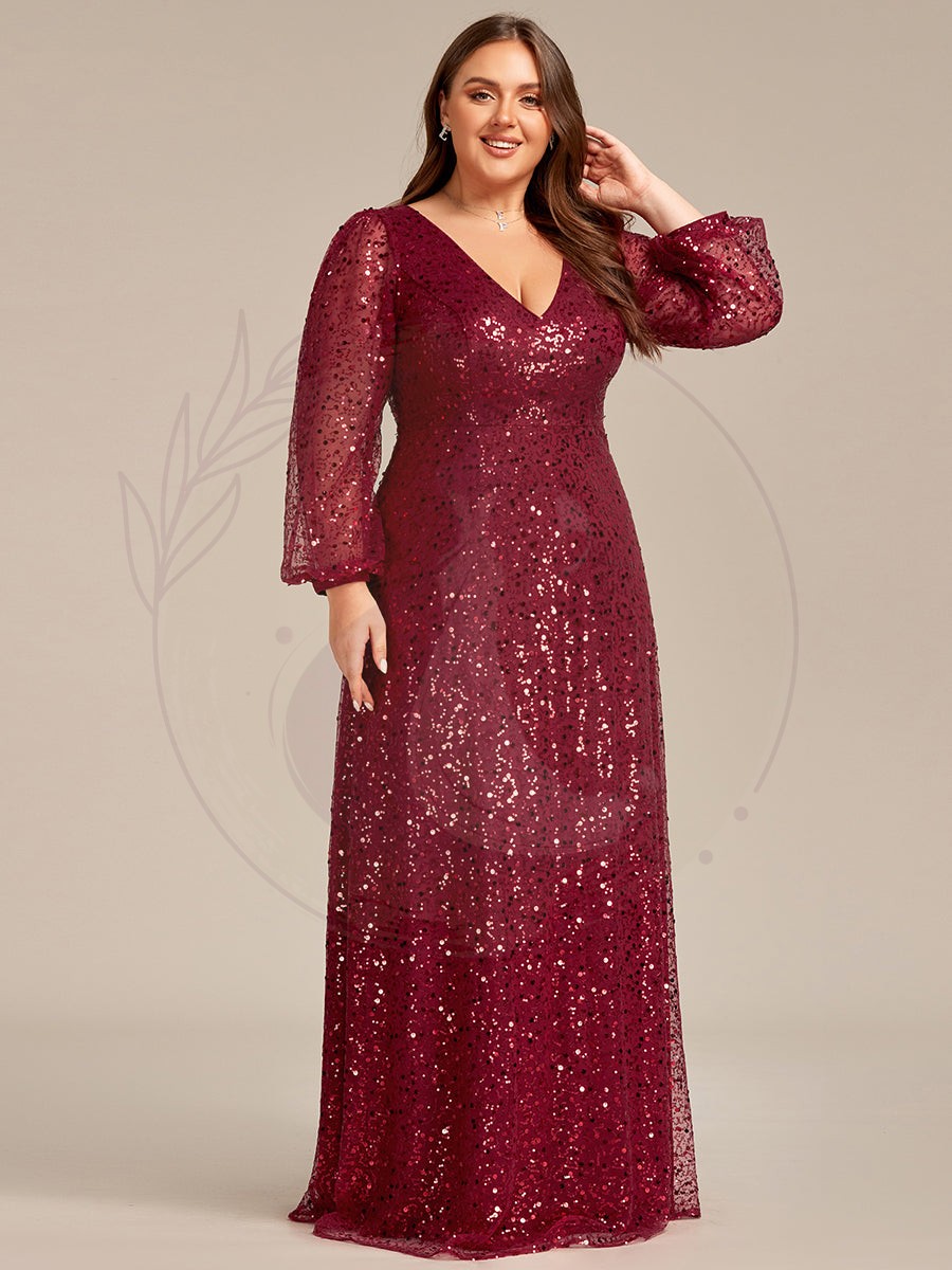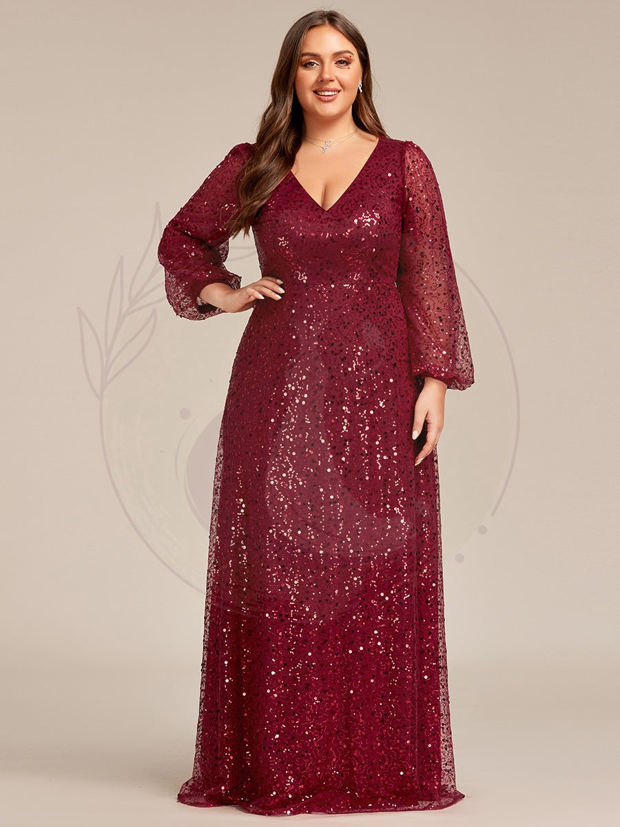 Grande taille Robe de soirée trapèze à paillettes col en V manches longues et paillettes