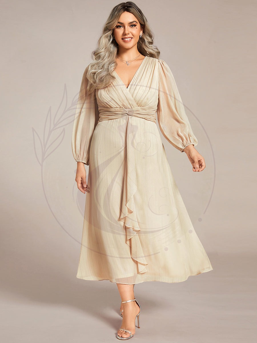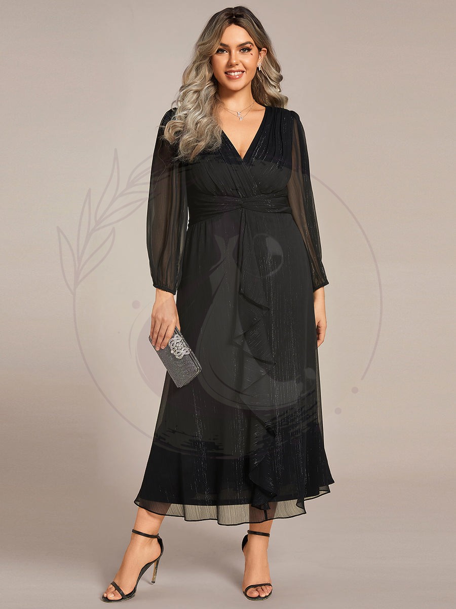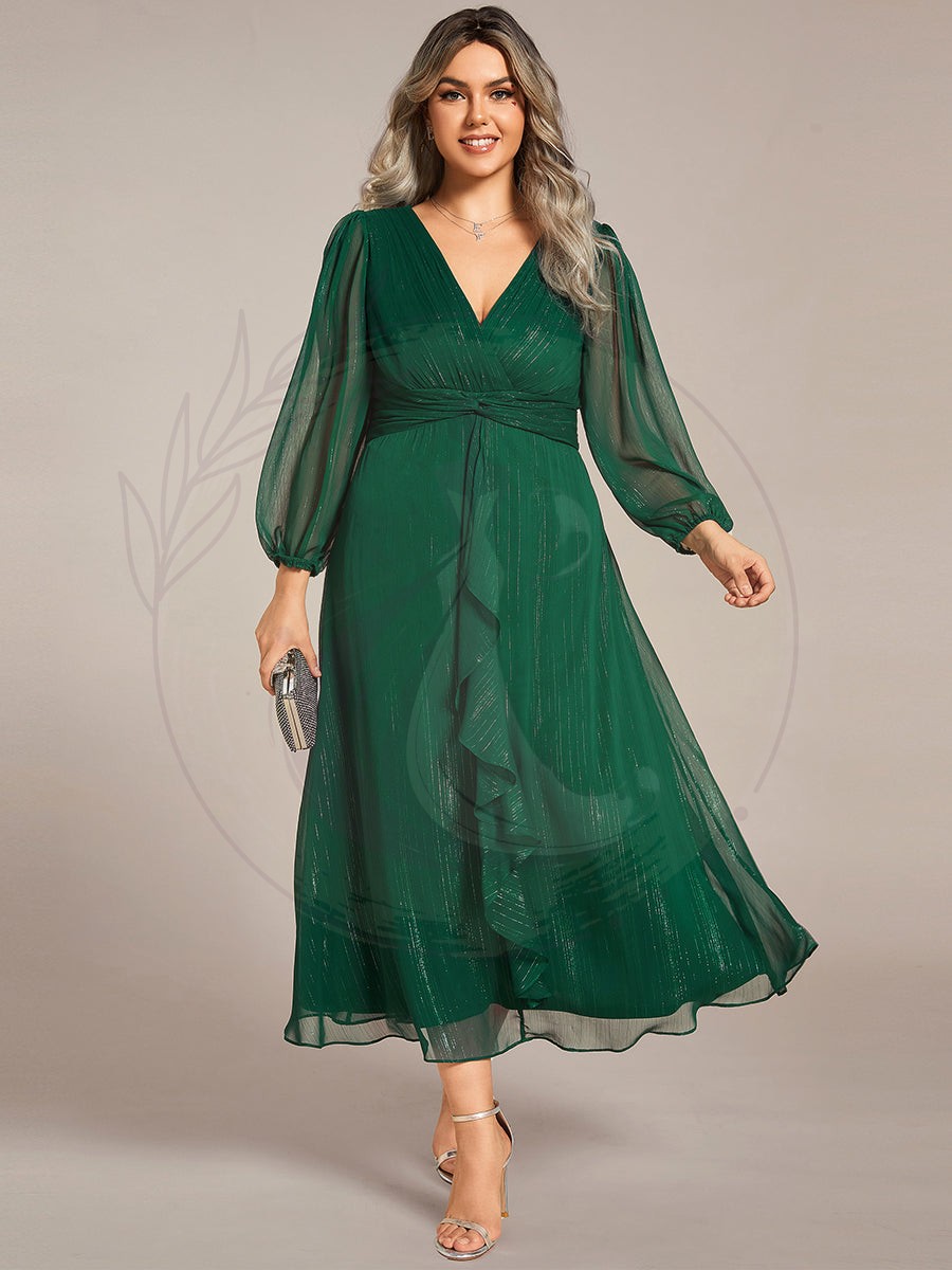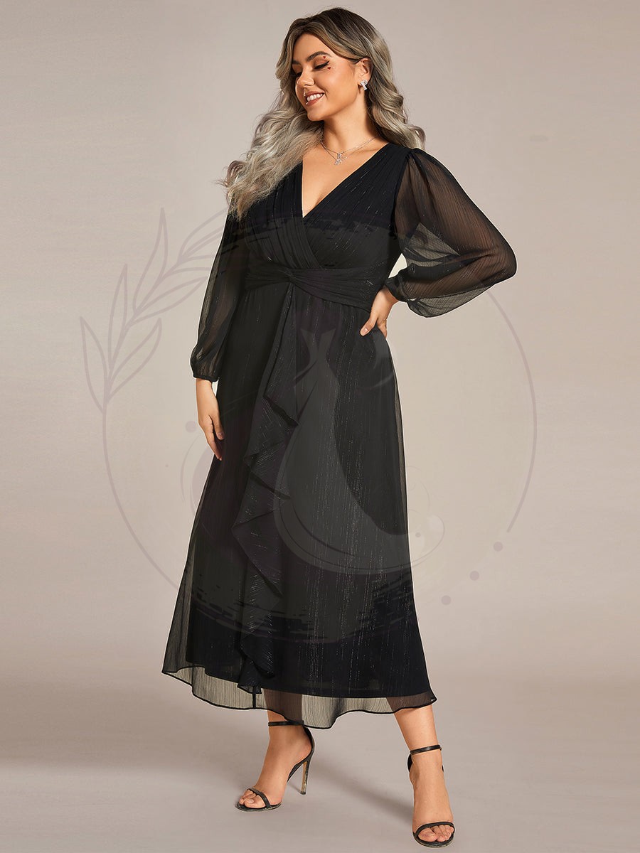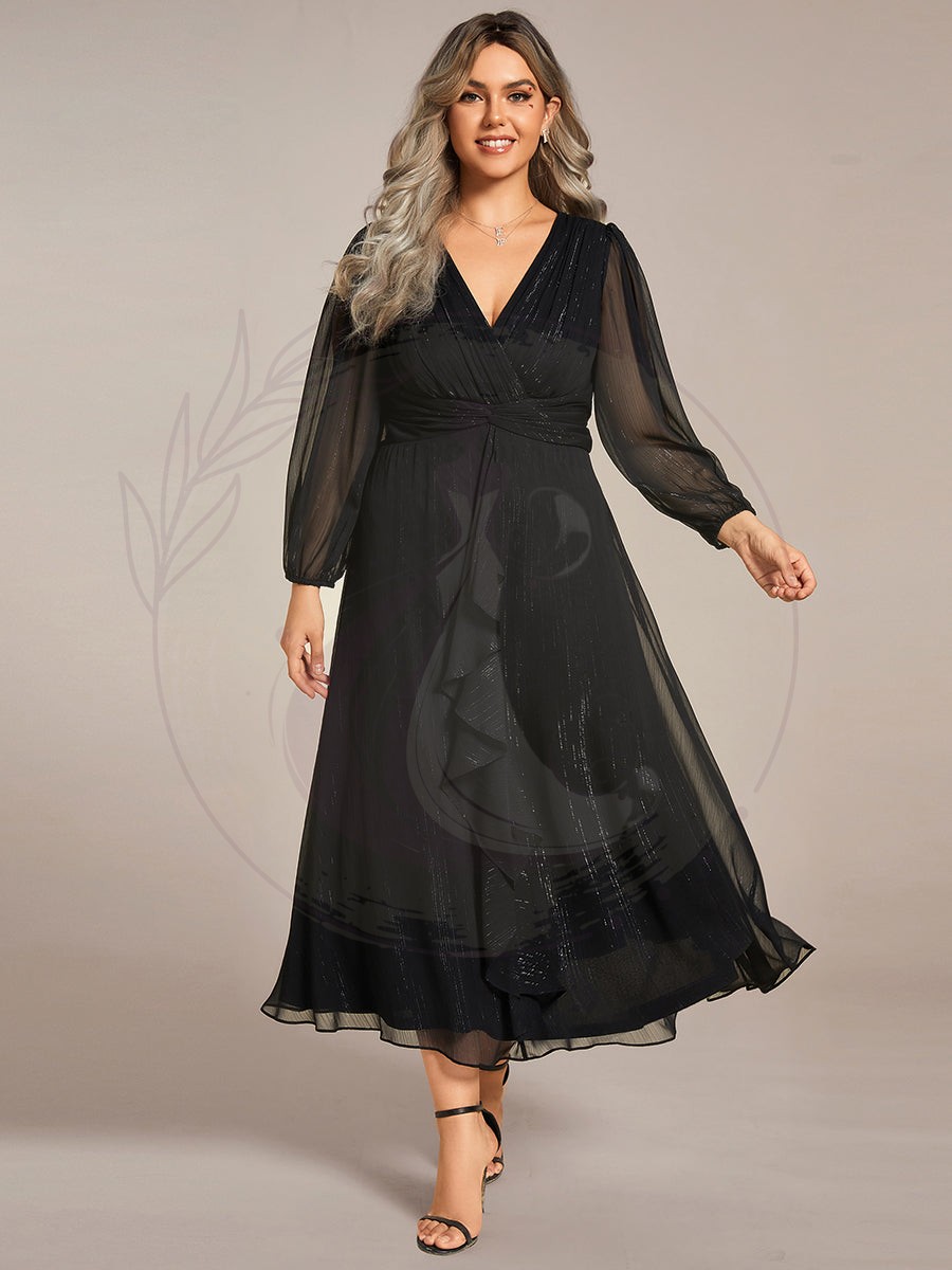 Grande taille Robe de soirée trapèze scintillante à manches longues et col en V en mousseline de soie avec n?ud torsadé