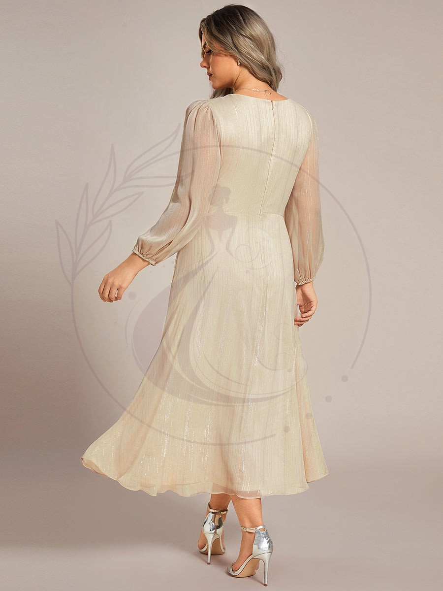 Embellezca su atuendo para eventos especiales con nuestro deslumbrante vestido de noche con corte A, manga larga y escote en V con un elegante lazo retorcido en chiffon. Confeccionado con una delicada tela de chiffon, este vestido cuenta con un favorecedor lazo retorcido en la cintura que realza su figura y aporta un toque de distinción. Las mangas largas suman sofisticación, y el escote en V proporciona un aire seductor. Su caída en línea A es favorecedora para cualquier tipo de cuerpo. Ideal para eventos formales o citas importantes, este vestido le hará sobresalir gracias a su encantador tejido de chiffon que brilla y capta la luz de manera espectacular. Brille bajo los focos y desborde confianza con este impresionante vestido de noche.