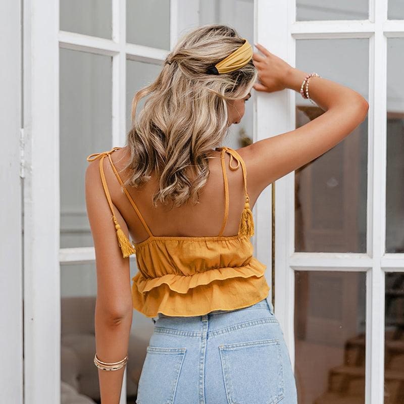 Venez voir ce petit vêtement de plage bohème que vous allez chérir durant les mois d’été. Avec son rabat au niveau de la poitrine, ce sommet de crop jaune à col V est orné de fronces et de pompons sur les bretelles. Complétez votre look estival avec un pantalon court en jeans bleu clair ou foncé.