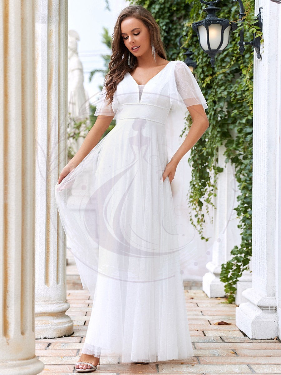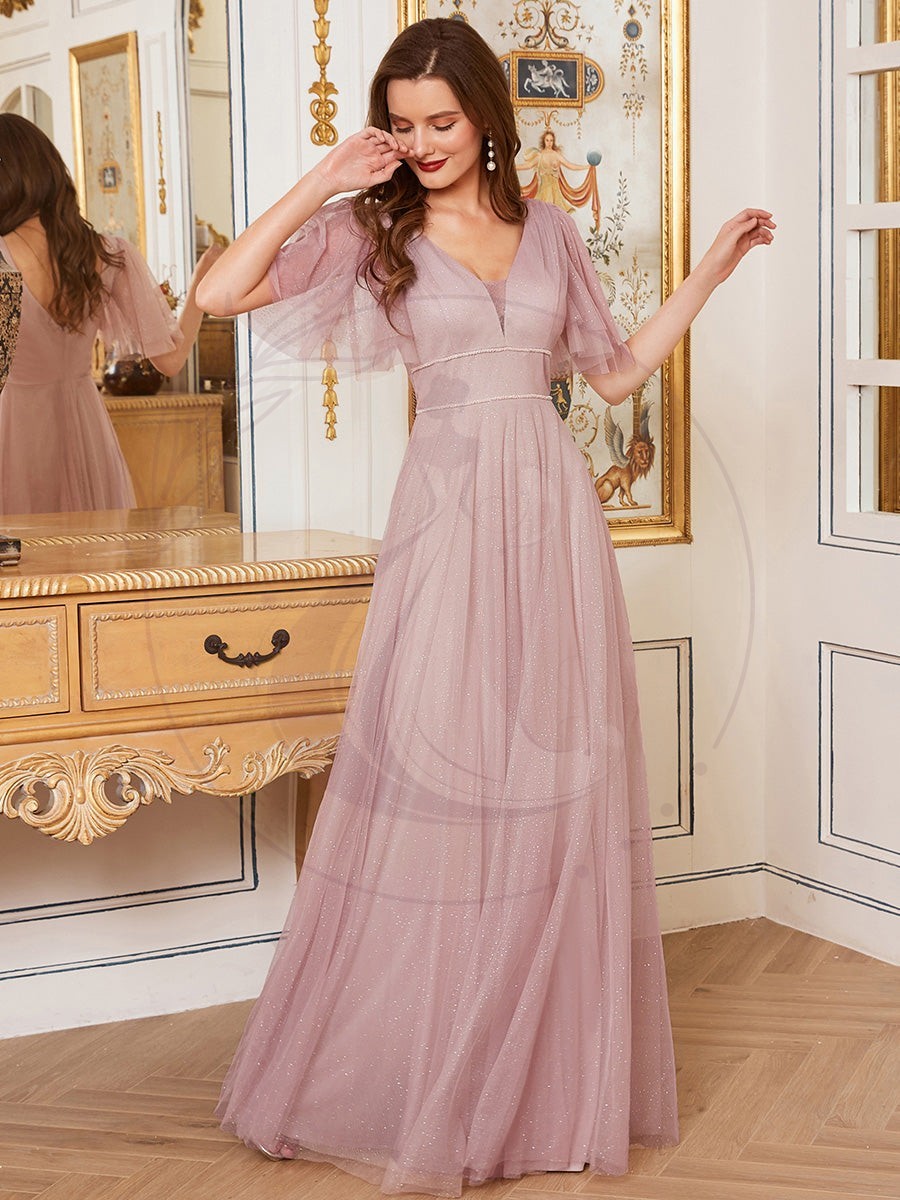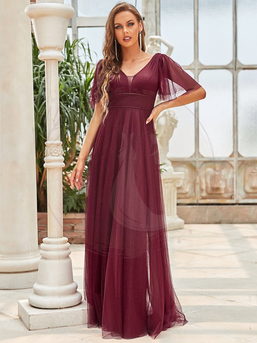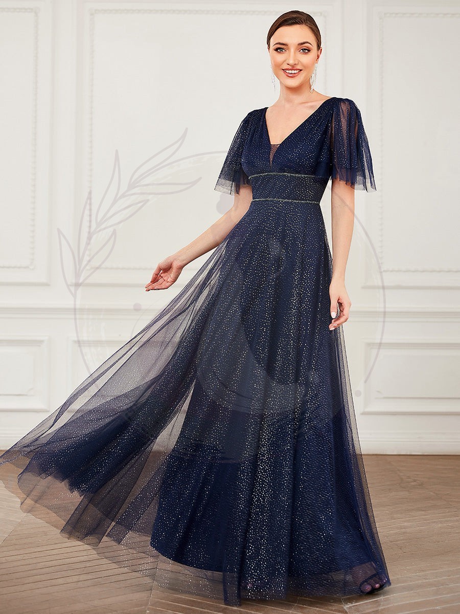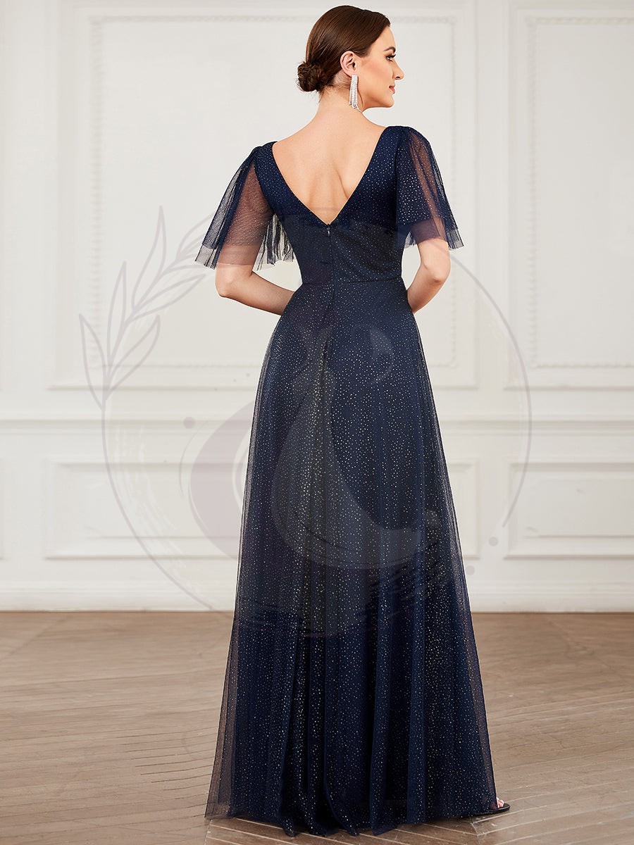 Jolie robe de soirée longue en tulle avec col en V profond