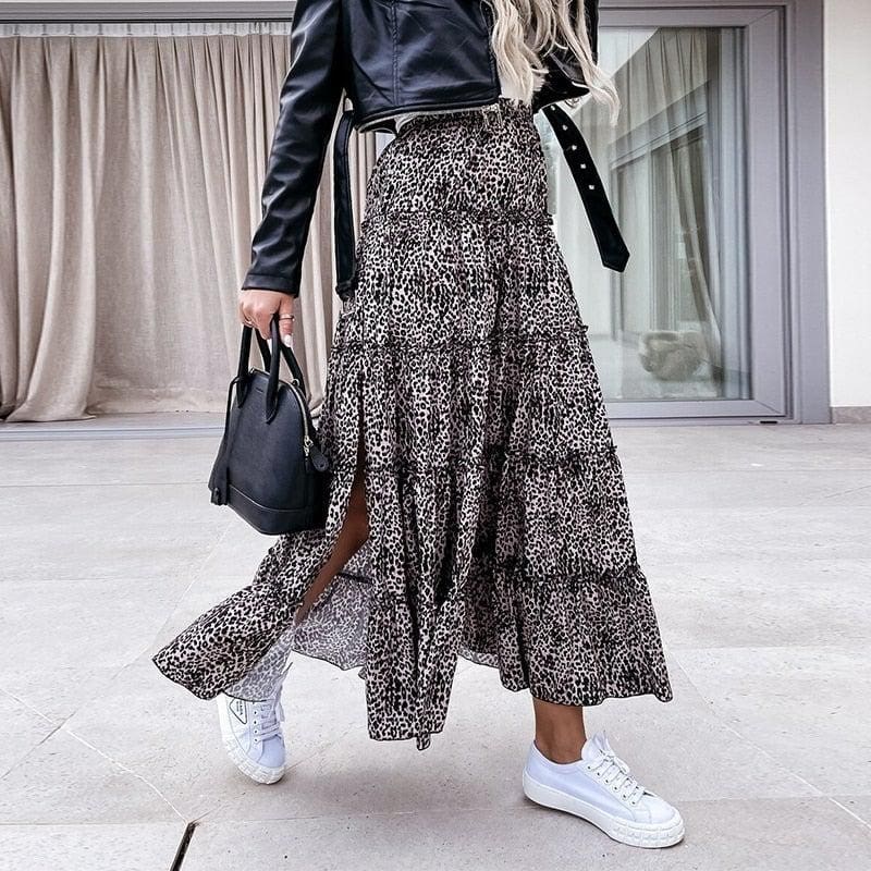 Jupe longue Bohème à Volants et Imprimé Léopard