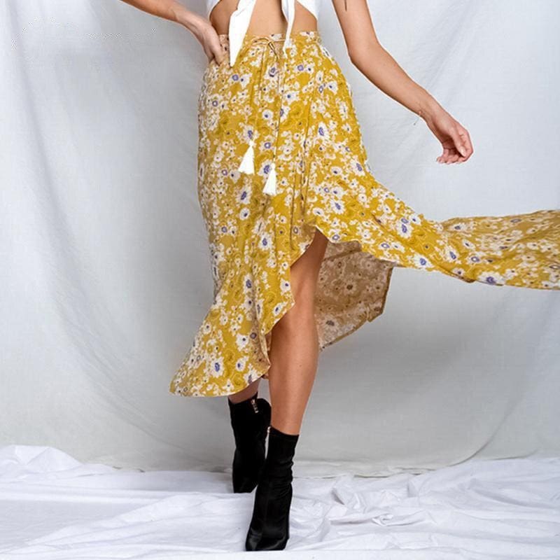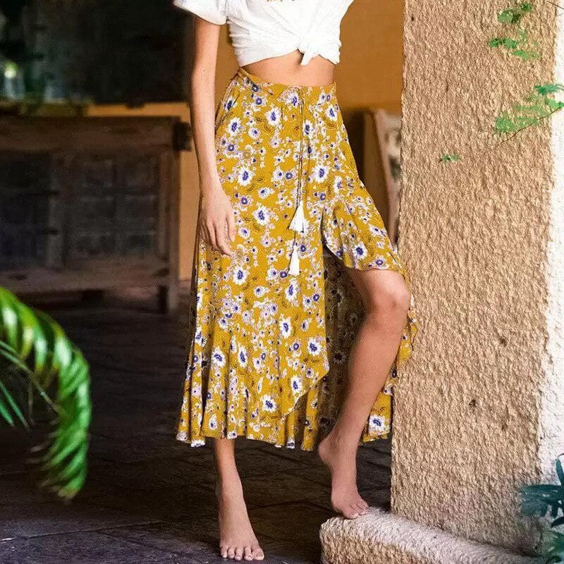 Jupe longue bohémienne jaune ornée de volants irréguliers