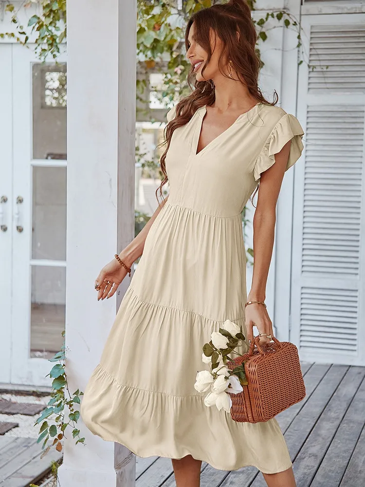 Notre élégante robe bohème beige, longue et légère, se distingue par son col en V flatteur, ses manches volantées très courtes et évasées. Elle est une pièce versatile et pratique pour votre garde-robe de printemps et d’été, adaptée à diverses occasions telles que cocktails, soirées ou après-midis décontractés. Sa coupe trapèze et sa longueur mi-mollet en font une tenue polyvalente.