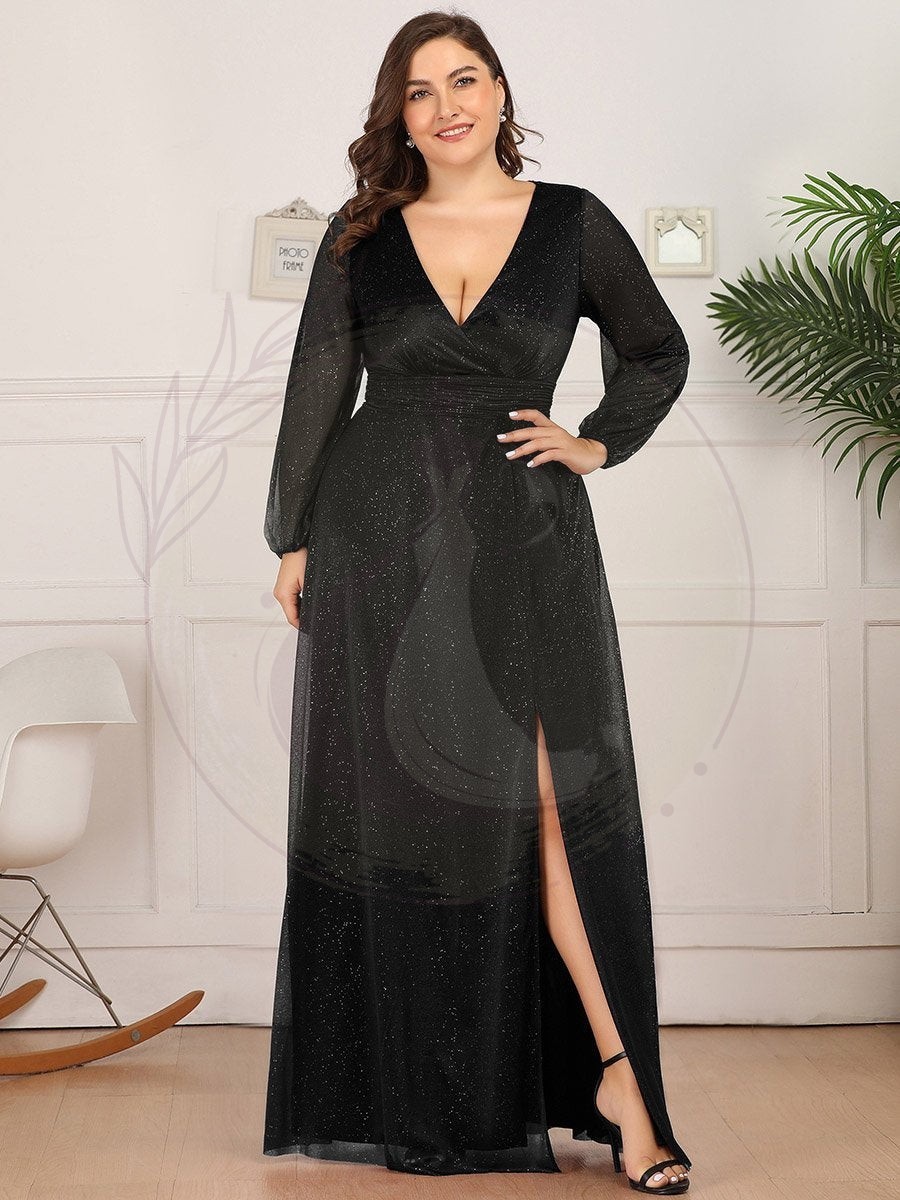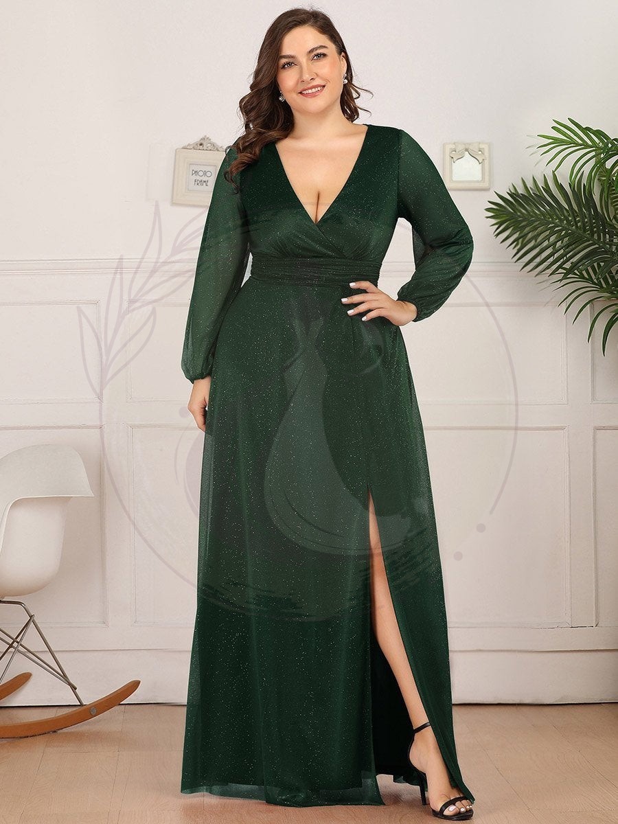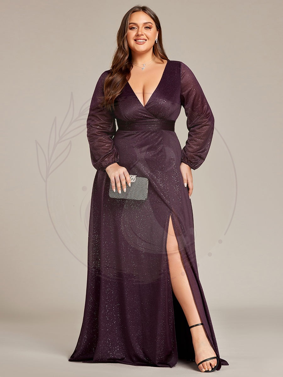 Avec son élégant décolleté plongeant en V, ses manches longues volumineuses et son élégante fente latérale au niveau de la jambe, cette magnifique robe grande taille pour soirées et événements brille par sa sensualité et son raffinement. La ceinture soigneusement ajustée souligne avantageusement la taille, assurant une forme des plus séduisantes. Idéale pour les occasions telles que les soirées de gala, les cérémonies, les cocktails, les bals de promo et les célébrations nuptiales !