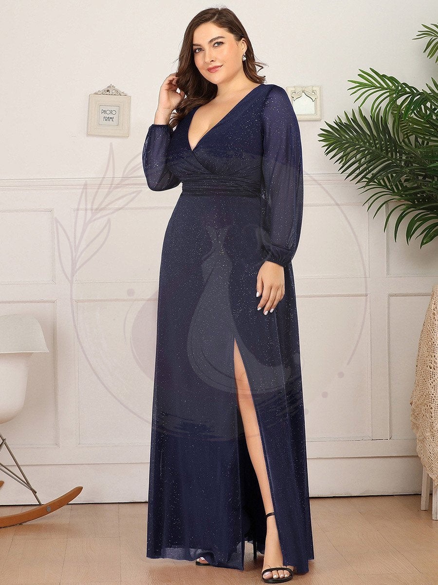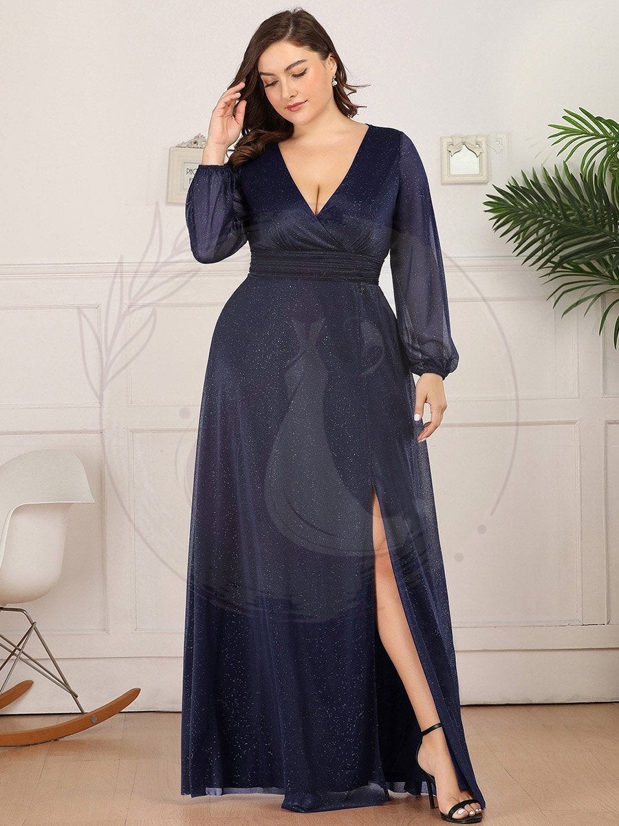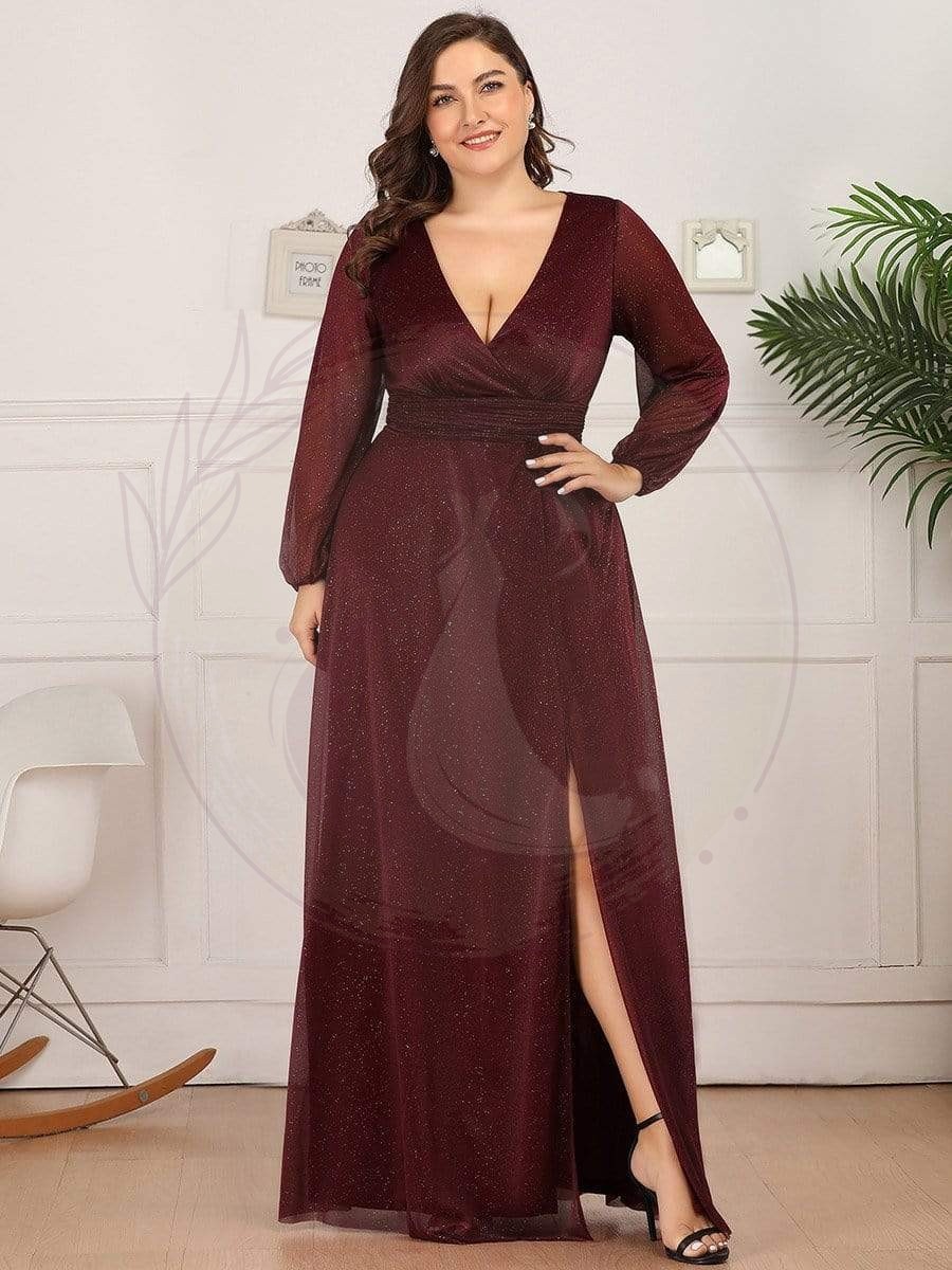 Avec son élégant décolleté plongeant en V, ses manches longues volumineuses et son élégante fente latérale au niveau de la jambe, cette magnifique robe grande taille pour soirées et événements brille par sa sensualité et son raffinement. La ceinture soigneusement ajustée souligne avantageusement la taille, assurant une forme des plus séduisantes. Idéale pour les occasions telles que les soirées de gala, les cérémonies, les cocktails, les bals de promo et les célébrations nuptiales !