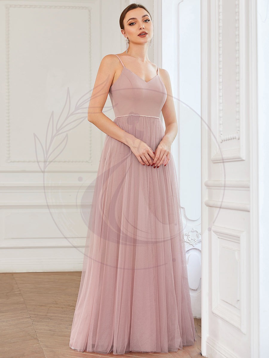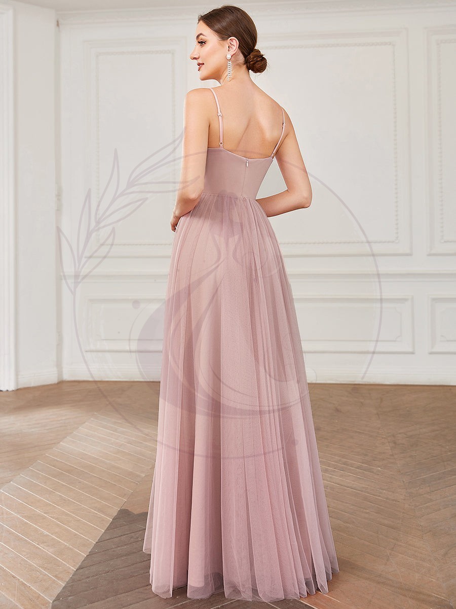 Robe de demoiselle d’honneur A-ligne en tulle avec bretelles minces