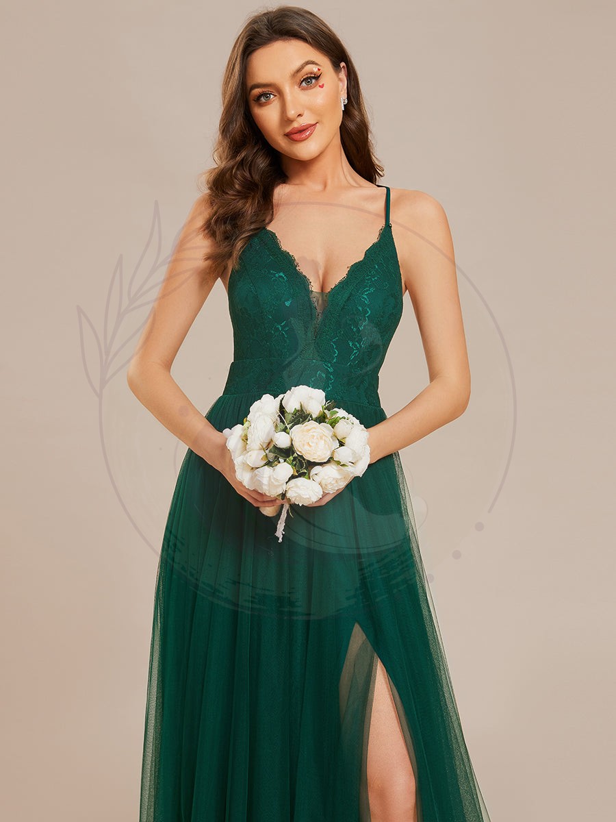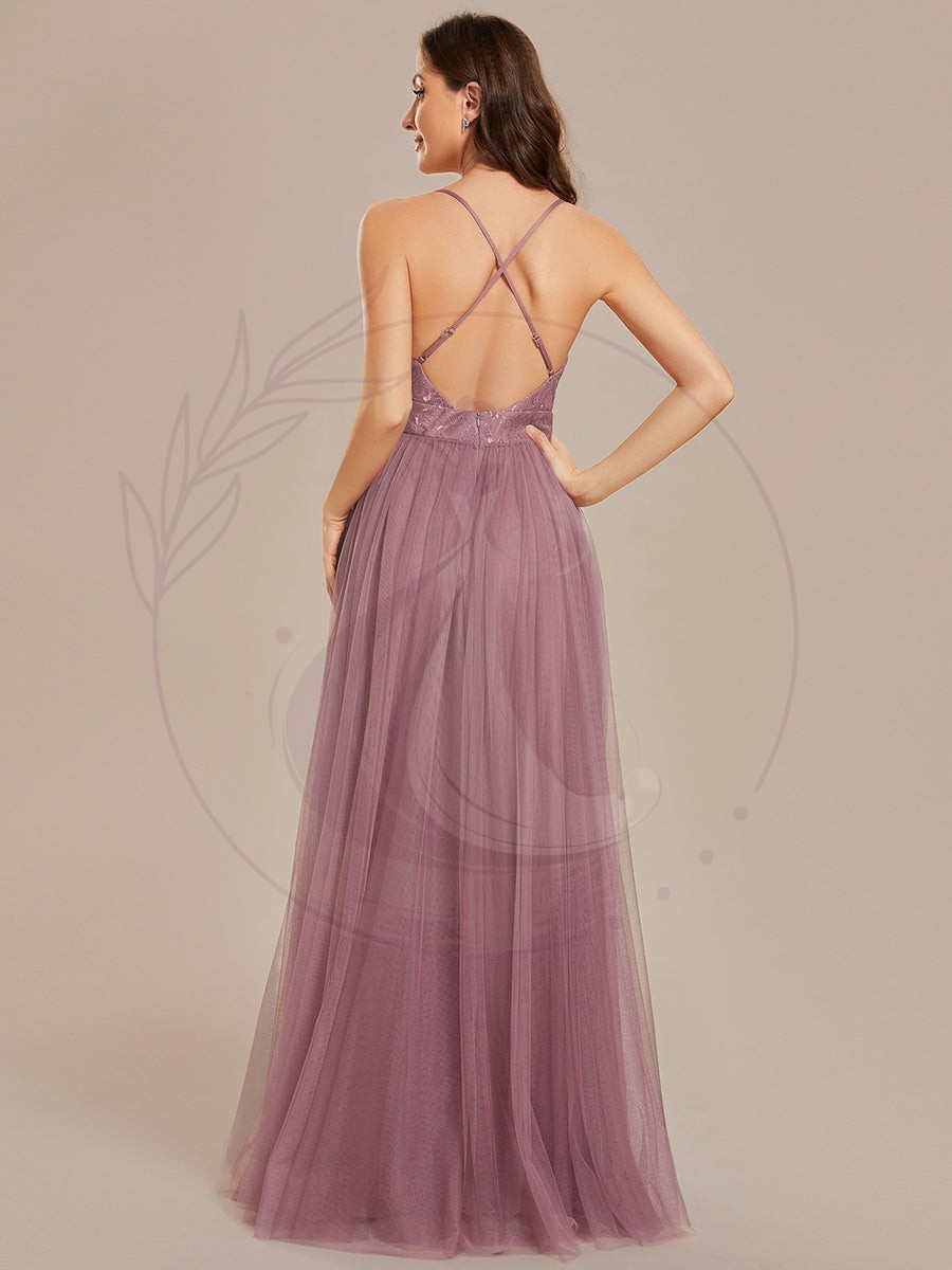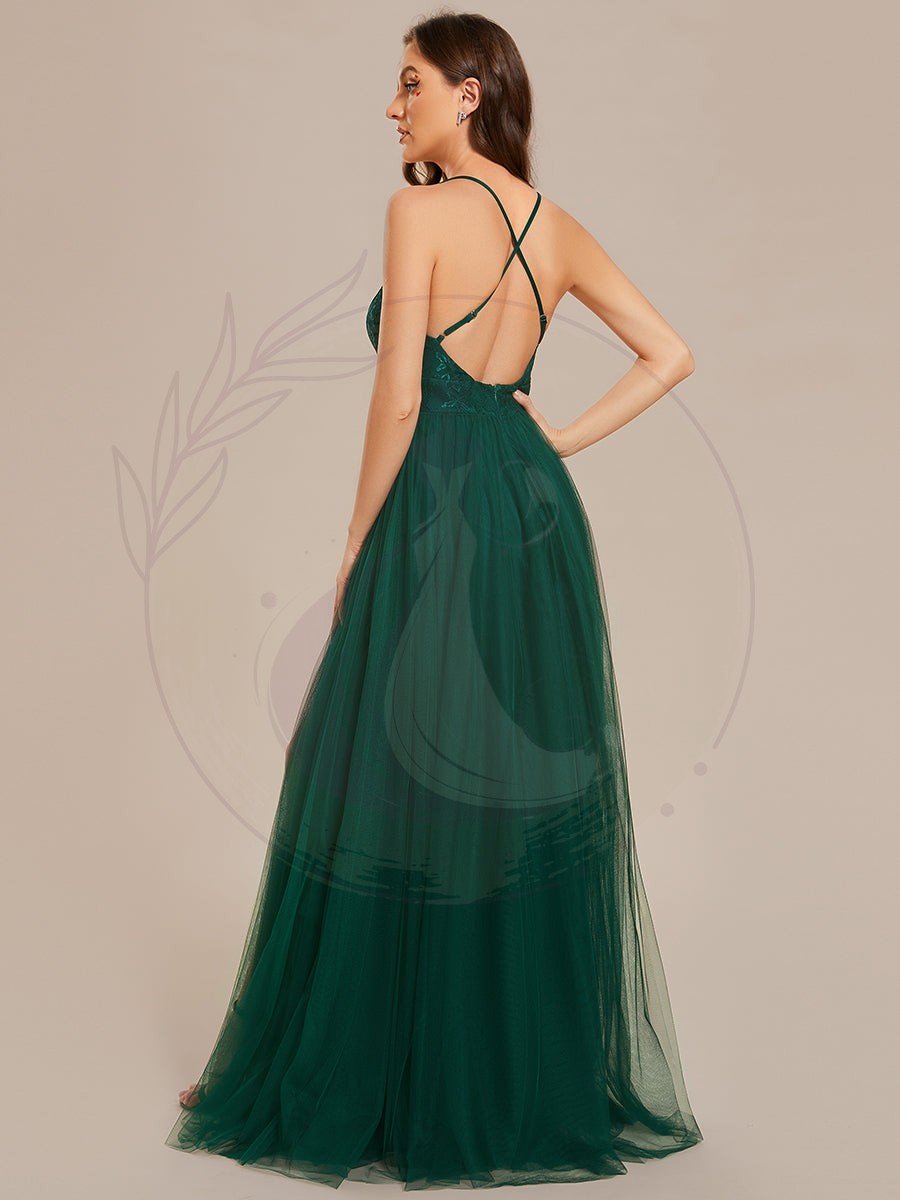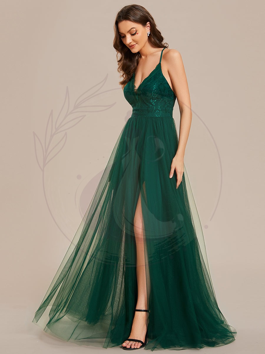 Sublimez chaque moment d’un mariage avec une robe de demoiselle d’honneur captivante, confectionnée en tulle délicat, ornée de motifs en dentelle exquis et dotée de fines bretelles se rejoignant en un élégant dos nu entrecroisé. Habillée d’une élégance intemporelle et d’une coupe évasée qui flatte la silhouette, cette robe de créateur est l’incarnation du chic pour des demoiselles d’honneur qui se veulent raffinées et tendance. Son dos nu apporte une touche contemporaine saisissante, et la jupe fendue en tulle sublime la démarche, conférant une allure envoutante. Tout à fait appropriée pour un mariage champêtre, une cérémonie les pieds dans le sable ou un événement mondain, elle permettra à toutes les demoiselles d’honneur de se sentir comme des divinités éclatantes de beauté.