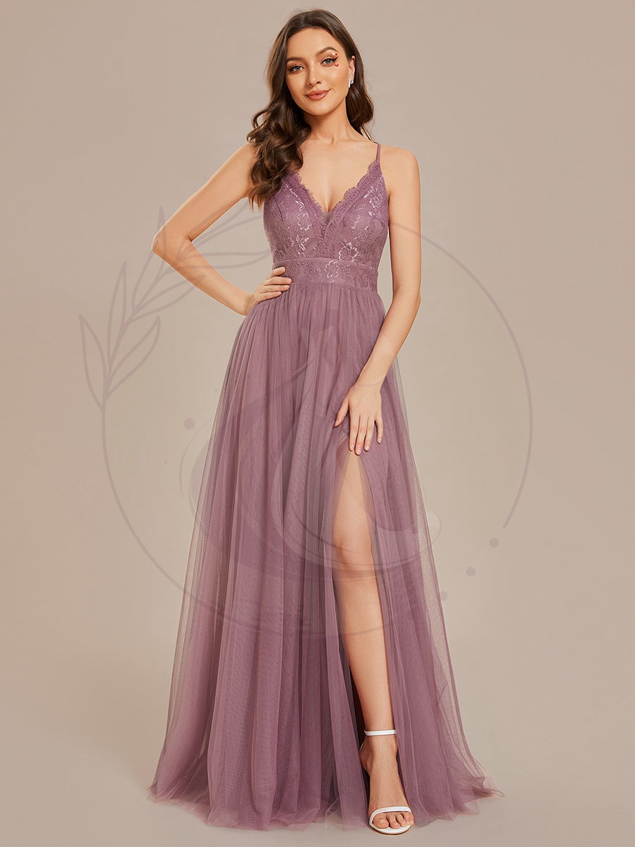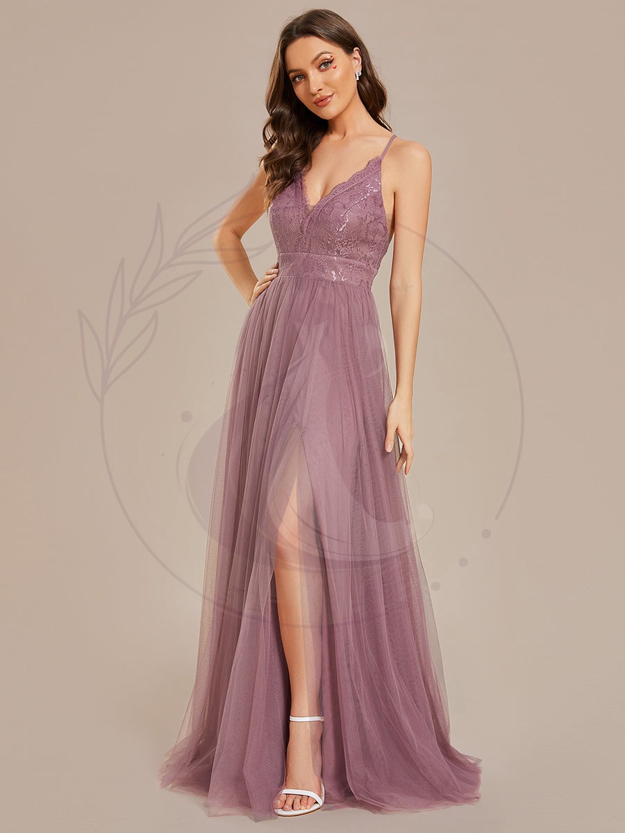 Robe de demoiselle d’honneur en tulle à bretelles spaghetti et dos croisé avec haut en dentelle et fente haute