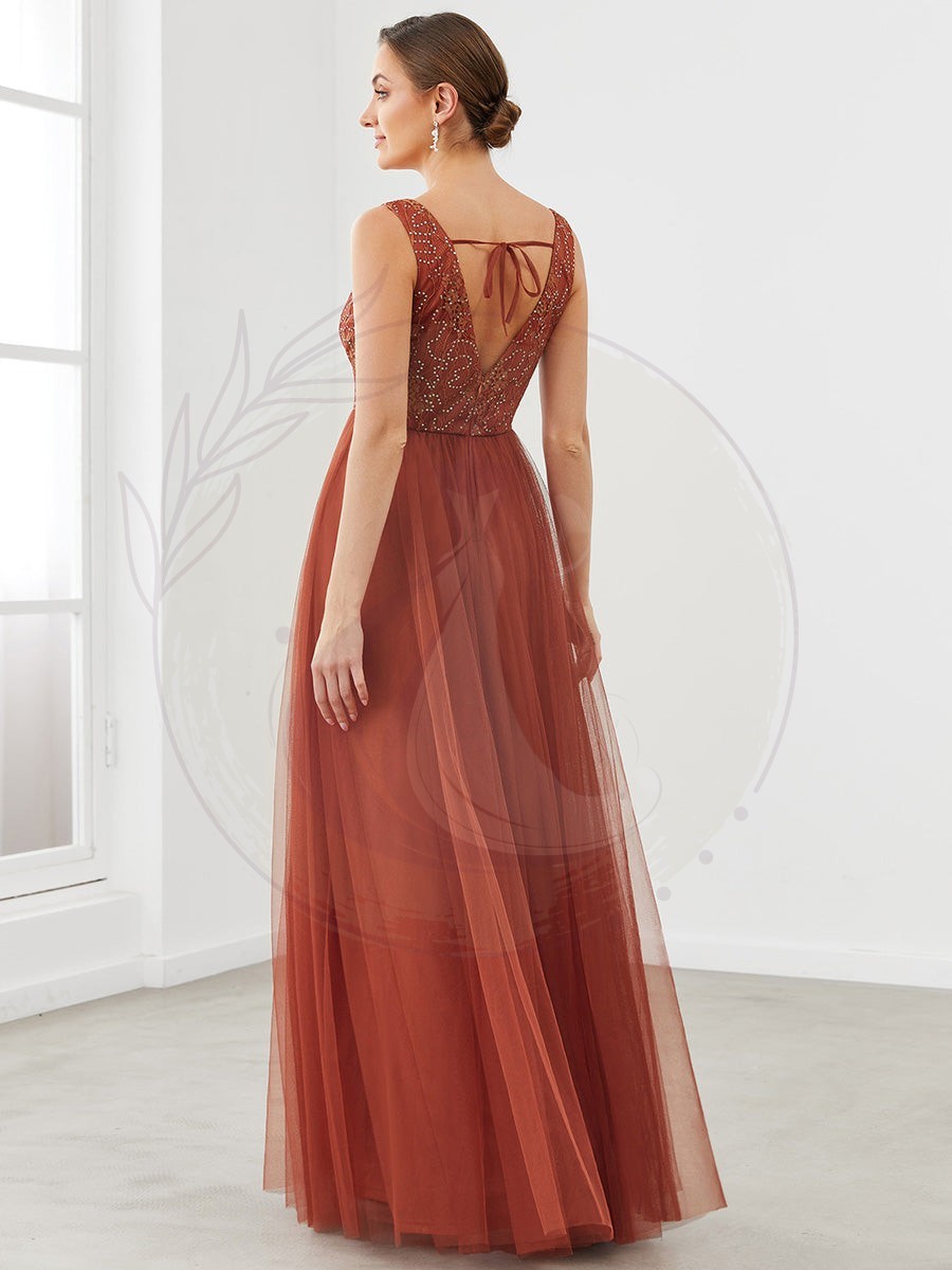 Robe de demoiselle d’honneur en tulle à encolure en V et en dentelle sans manches