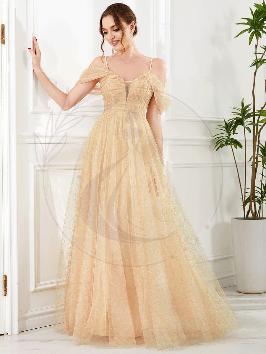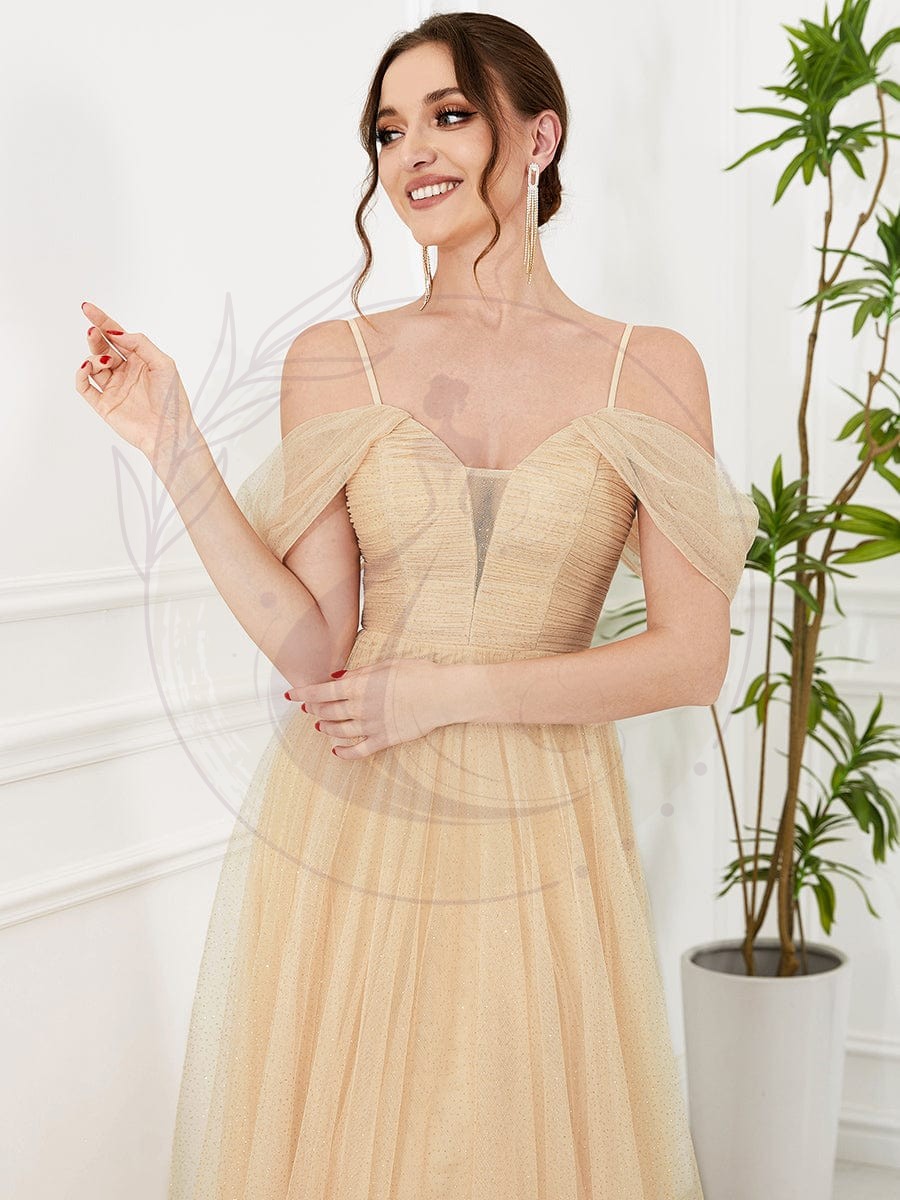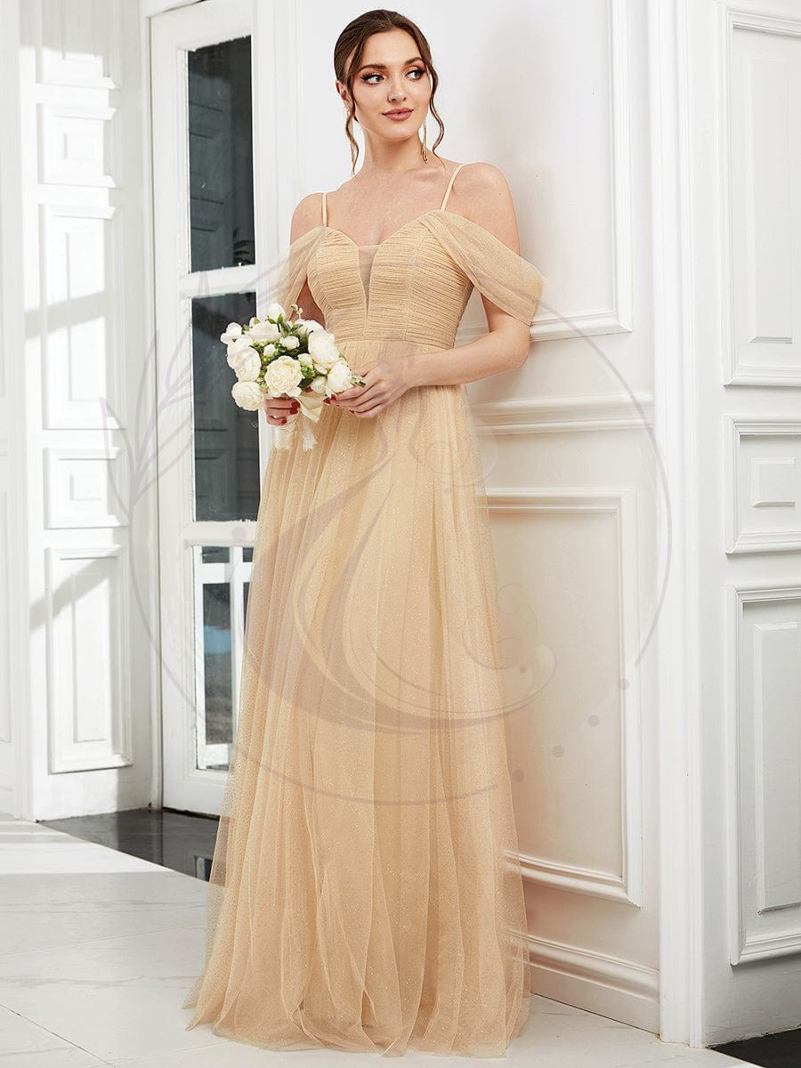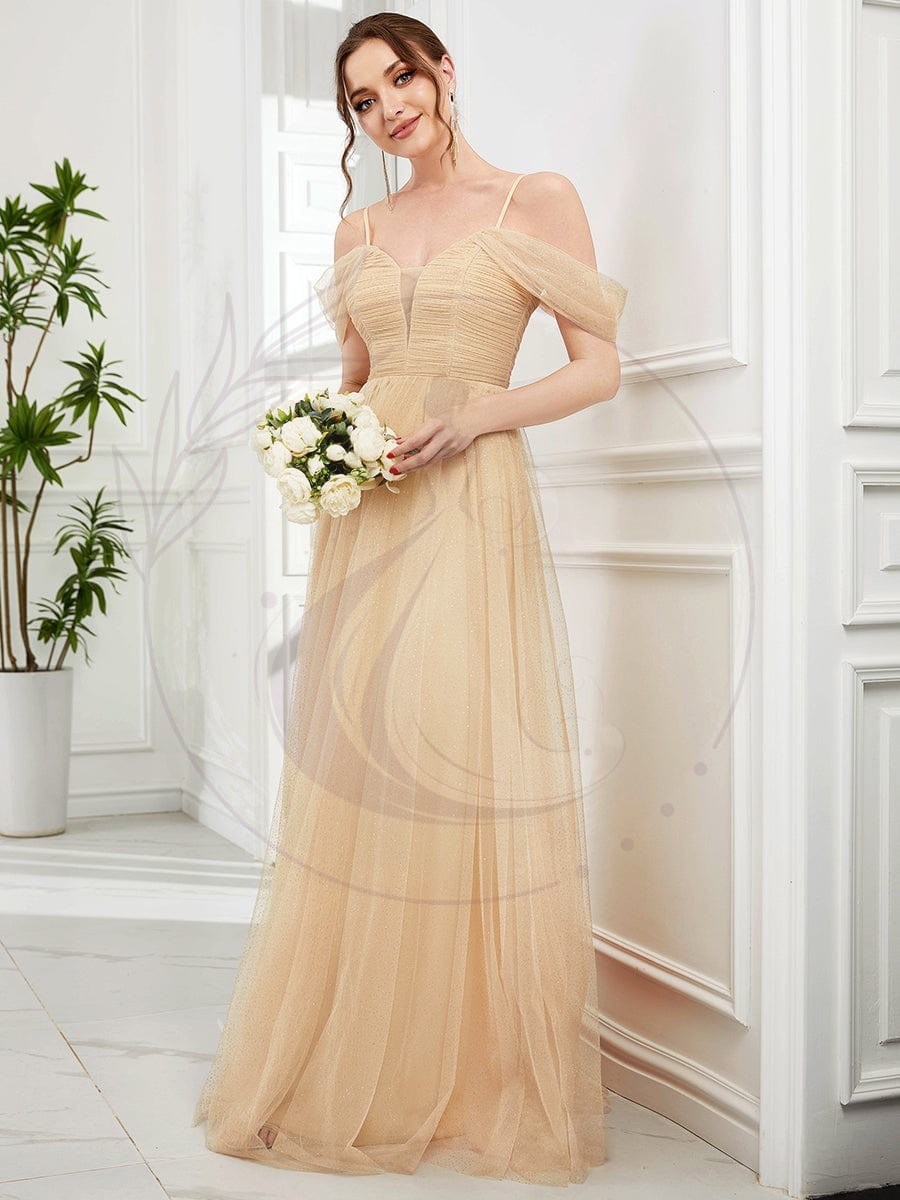 Robe de demoiselle d’honneur en tulle à épaules dénudées et bretelles fines