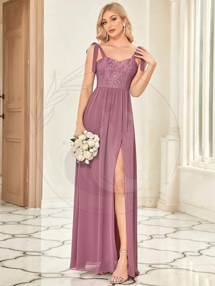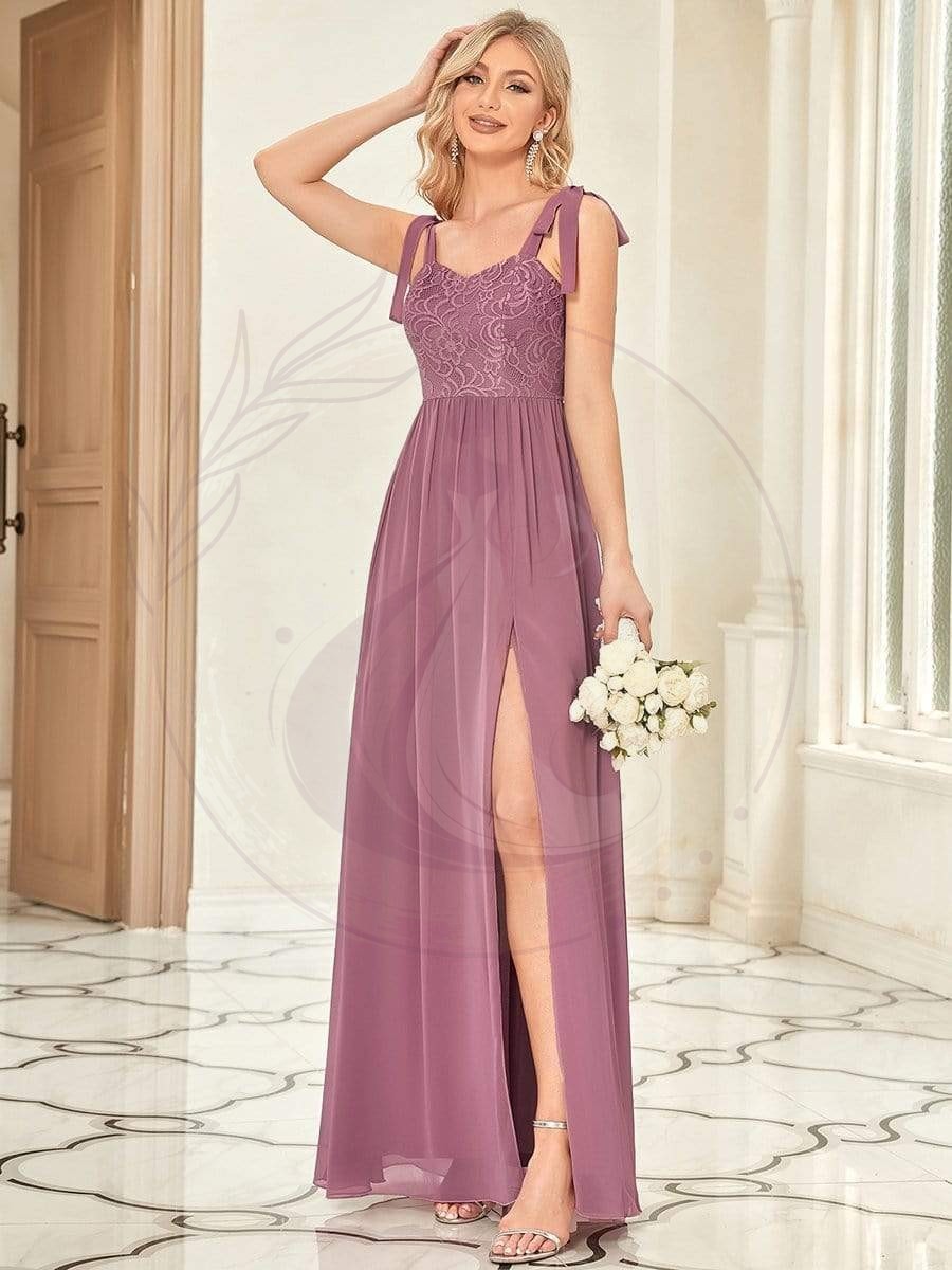 Robe de demoiselle d’honneur fendue sur les cuisses en dentelle à nouer