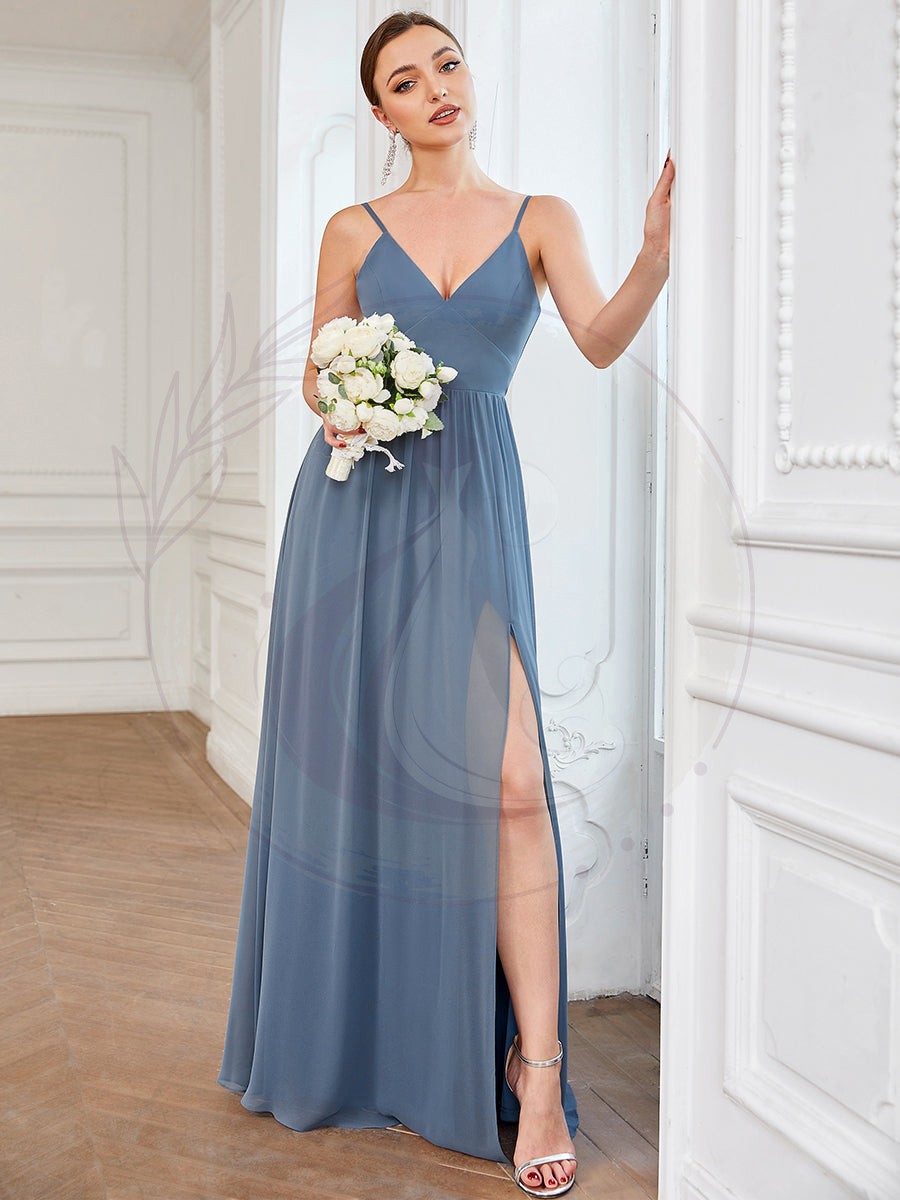 Capturez l’admiration de votre mariée avec cette élégante robe de demoiselle d’honneur empreinte de féminité. Sa conception se distingue par de fines bretelles ajustables et un décolleté plongeant en forme de V. Une jupe longue et plissée se déploie jusqu’au sol, couronnée d’une couche aérienne transparente et agrémentée d’une séduisante ouverture sur le côté.