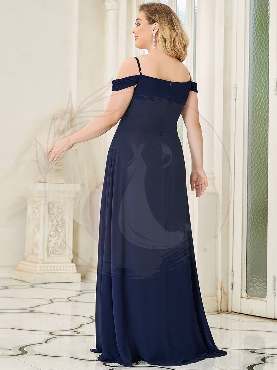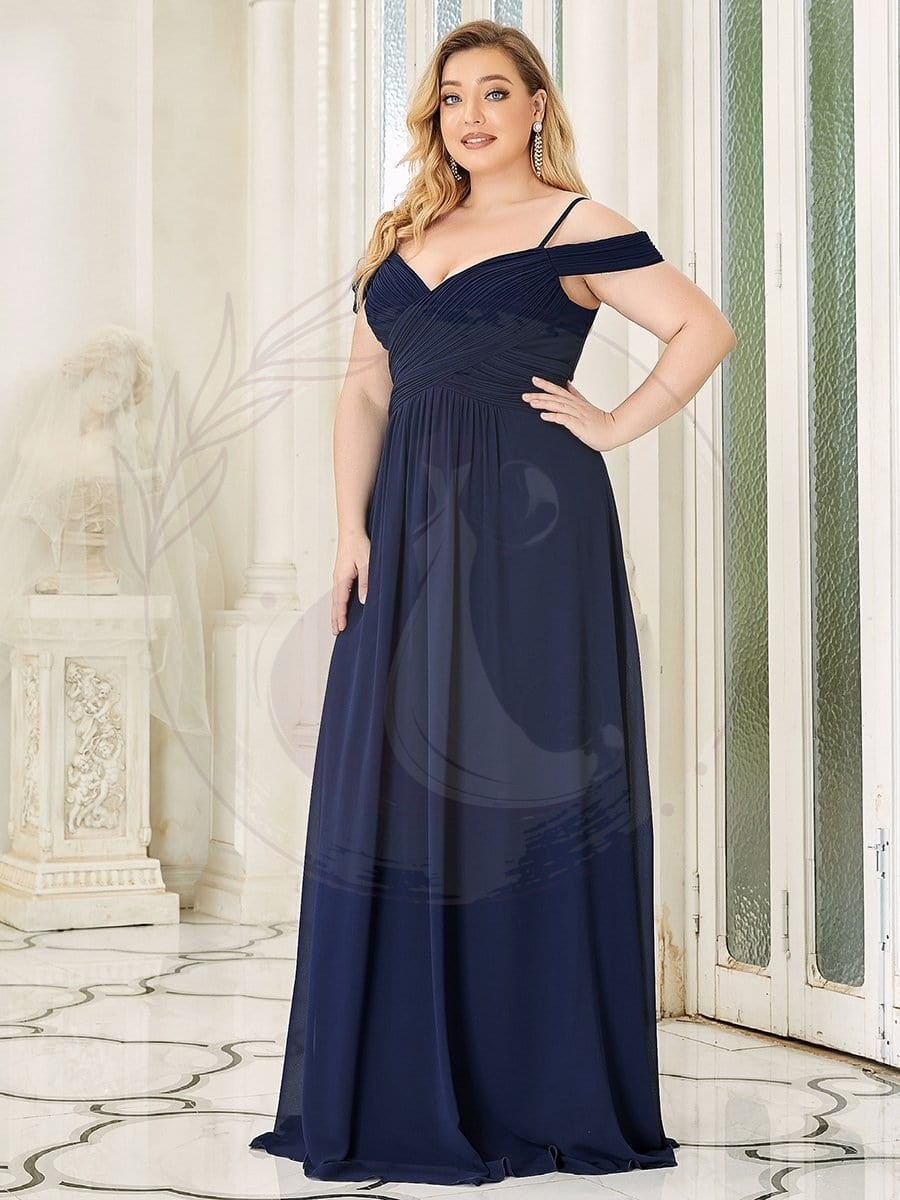 Apportez un éclat de sophistication à la cérémonie nuptiale avec cette sublime robe de demoiselle d’honneur spécialement conçue pour les silhouettes généreuses. Imaginée pour sublimer toutes les morphologies, elle affiche un corsage orné de découpes aux épaules soulignant la finesse du port de tête et des plis raffinés qui parcourent le buste. La jupe fluidement évasée jusqu’à terre se pare de plis délicats et s’accompagne d’un voile diaphane en superposition, pour une démarche tout en grâce.