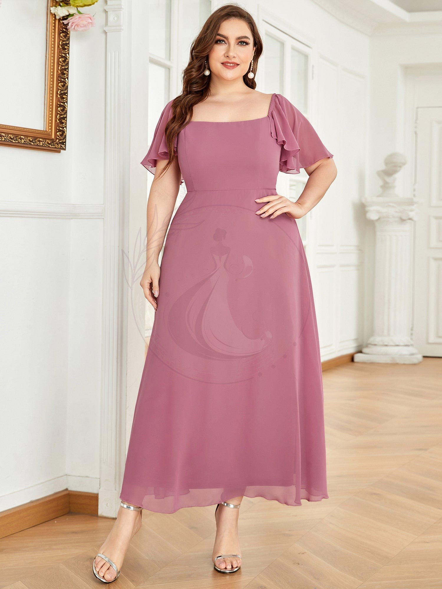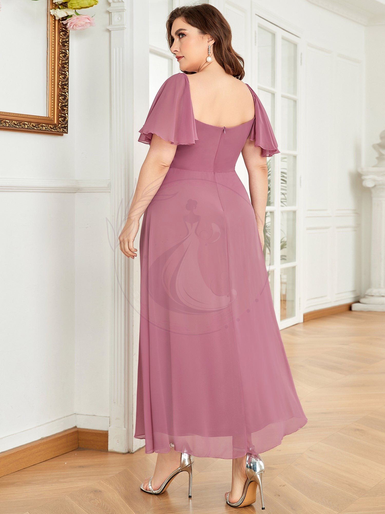 Arborez une silhouette raffinée avec cette magnifique tenue de soirée pour accompagnatrice. Son design séduit par un haut raffiné à épaules découvertes, agrémenté de manches flottantes en voile et d’un décolleté élégant. L’allure est complétée par une jupe évasée tombant à la cheville, idéale pour mettre en valeur des escarpins choisis avec soin!