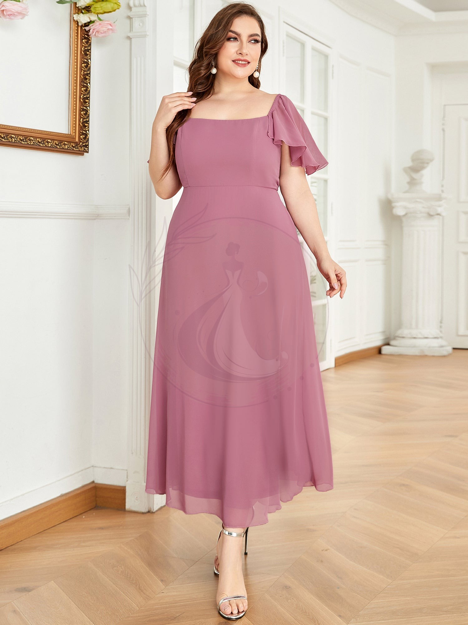 Robe de Demoiselle d’Honneur à Manches Volantées et épaules Dénudées
