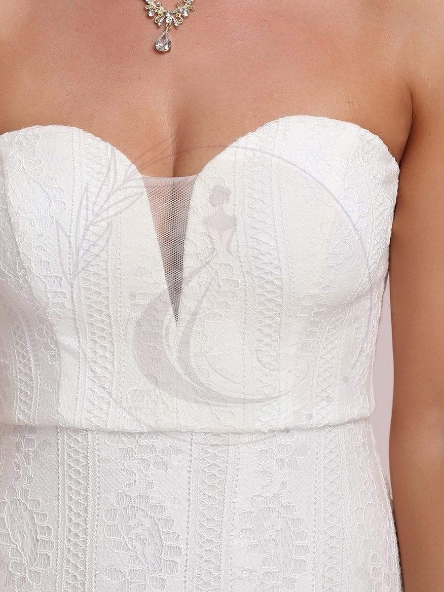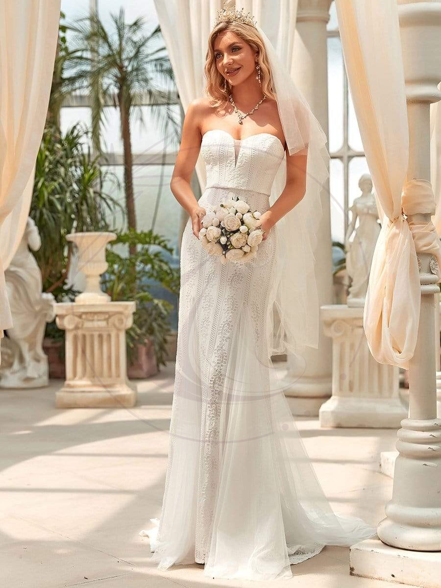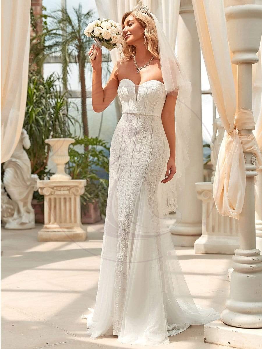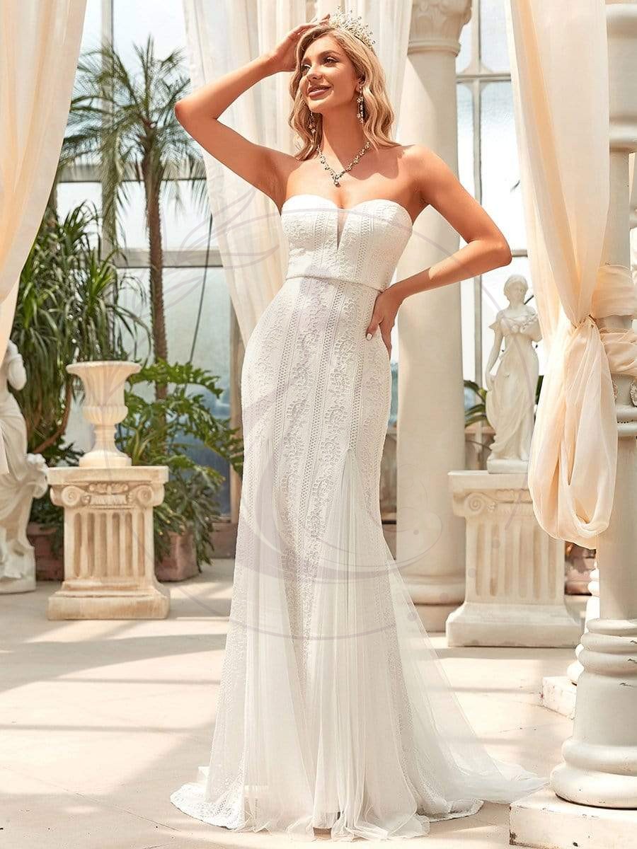 Faites sensation le jour de votre mariage avec cette sublime robe de mariée qui captivera tous les regards. Son design séduisant présente un corsage bandeau rehaussé d’un élégant décolleté forme cœur, sublimé par une insertion transparente ornant le centre. Le corps de la robe est agrémenté d’une broderie de dentelle raffinée qui se prolonge gracieusement jusqu’à la traîne.