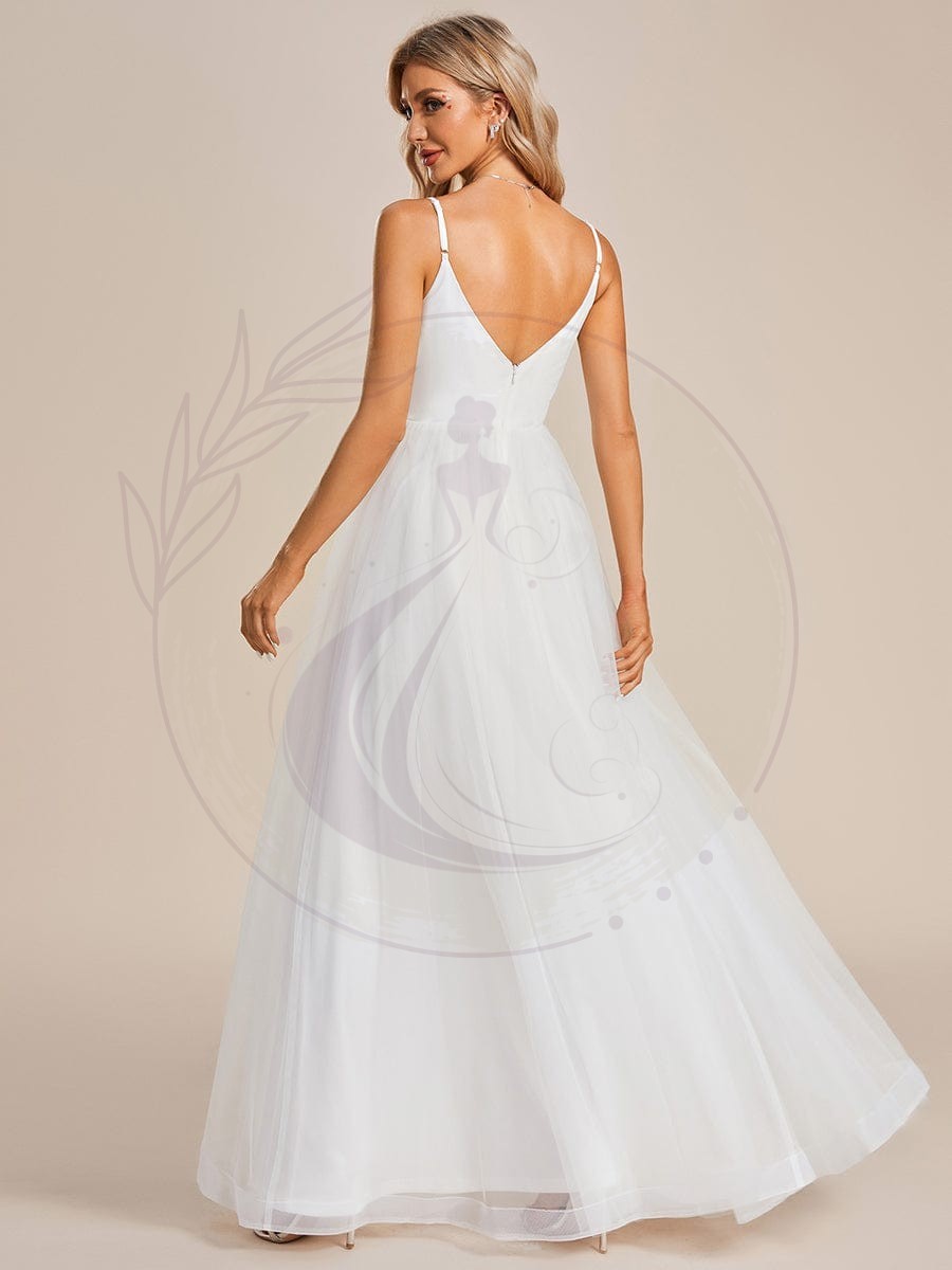 Découvrez la quintessence de l’élégance avec notre sublime Robe de Mariée Épurée à Bretelles Spaghetti et Décolleté en V ornée d’Appliques délicates en Tulle en forme de A. Rassemblez grâce à son allure gracieuse et son design A-ligne, cette tenue transforme chaque mariée en vision de raffinement. Le décolleté en V associé aux fines bretelles met en valeur la beauté naturelle du buste et des épaules, assurant une allure distinguée pour une célébration nuptiale champêtre ou un mariage élégant au bord de la mer. En enfilant cette robe, sentez-vous comme la protagoniste d’un conte de fées, rayonnante et magnifique alors que vous avancez vers l’autel.