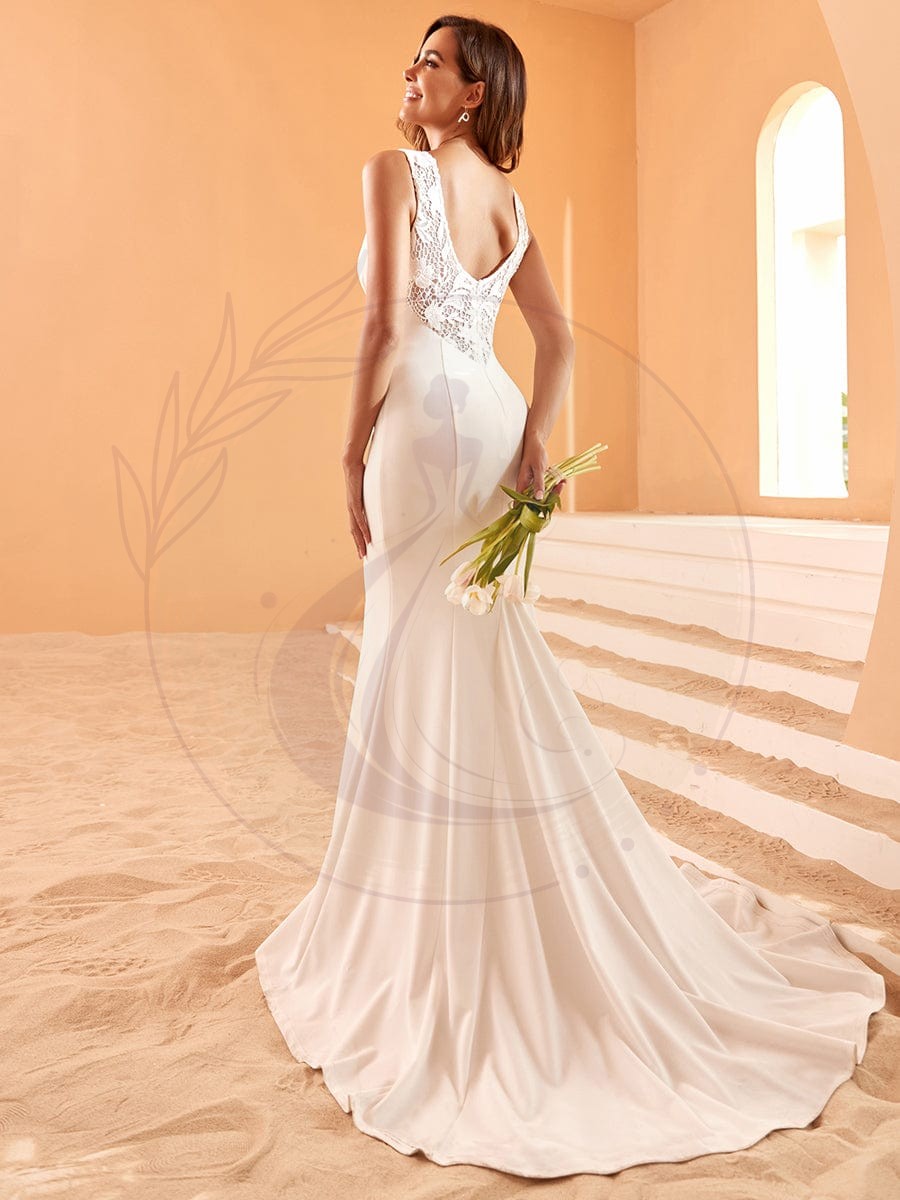 Incarnation du raffinement, la Robe Nuptiale Sirène avec Broderies et Dos Nu ajoute une touche d’éclat à votre cérémonie de mariage. Sa broderie délicate et son décolleté en V plongeant vous transforment en une véritable vision de grâce le jour de votre union.
