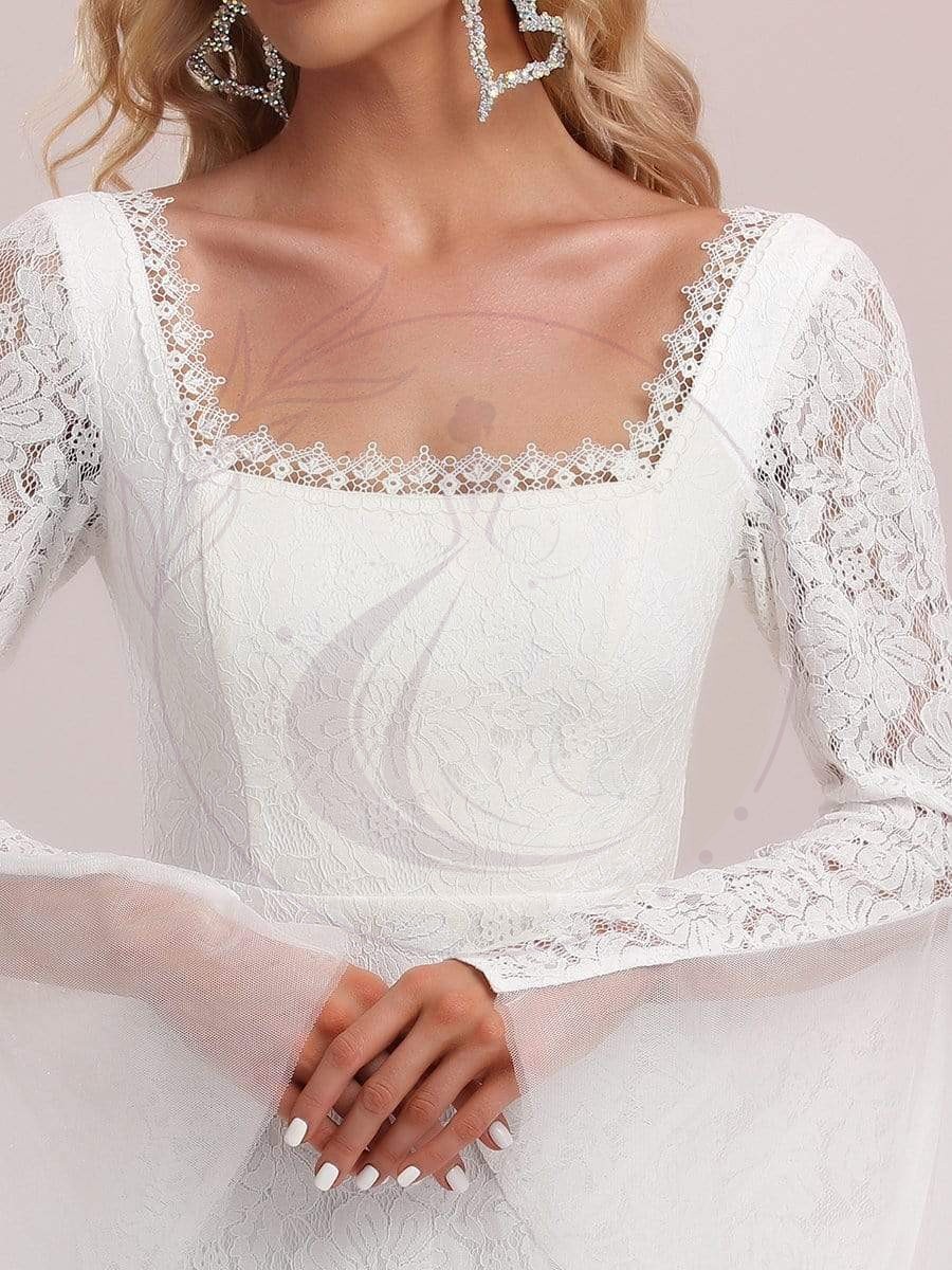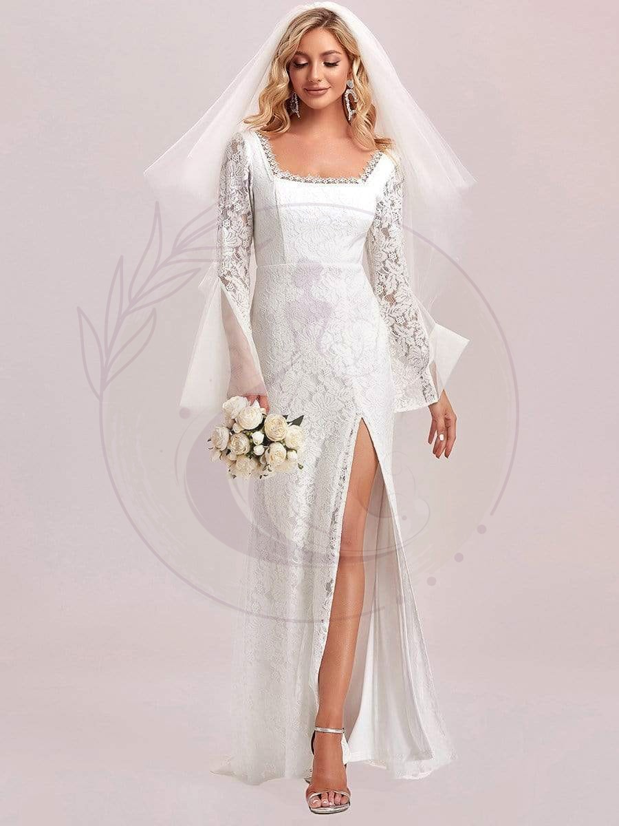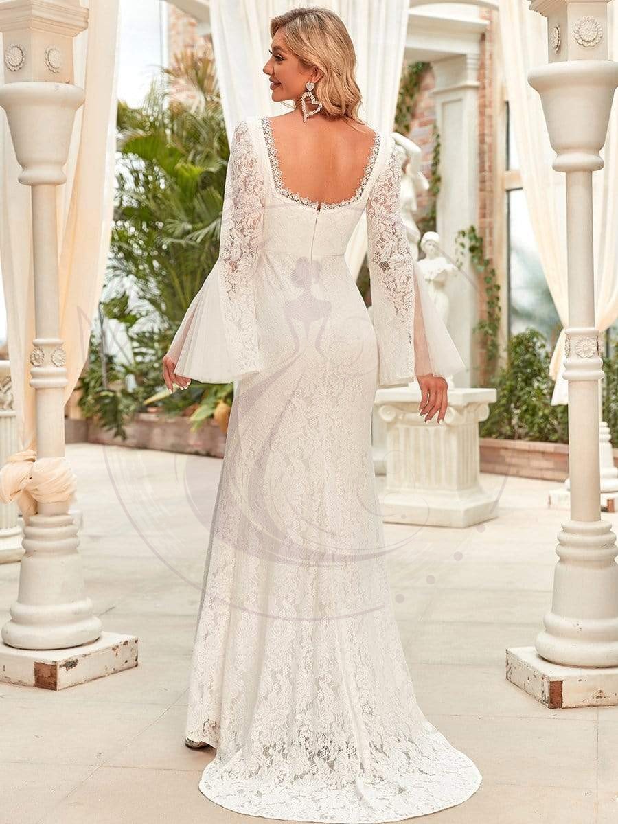 Osez le charme intemporel avec cette élégante robe de mariée, caractérisée par ses manches longues en fine dentelle, terminées par des poignets évasés transparents, et par une encolure carrée rehaussée d’une jolie frise ajourée. Descente vers une jupe ample se terminant par une séduisante fente latérale qui dévoile subtilement la jambe.