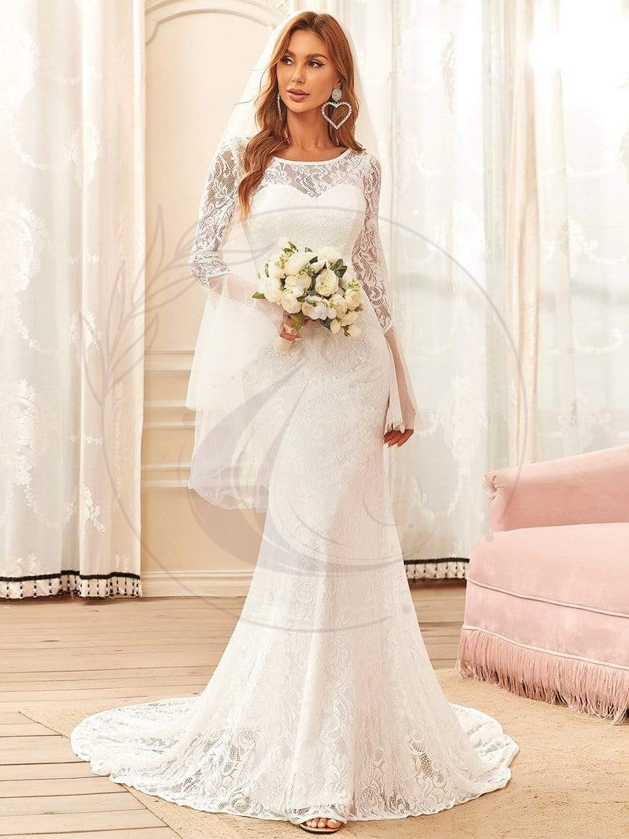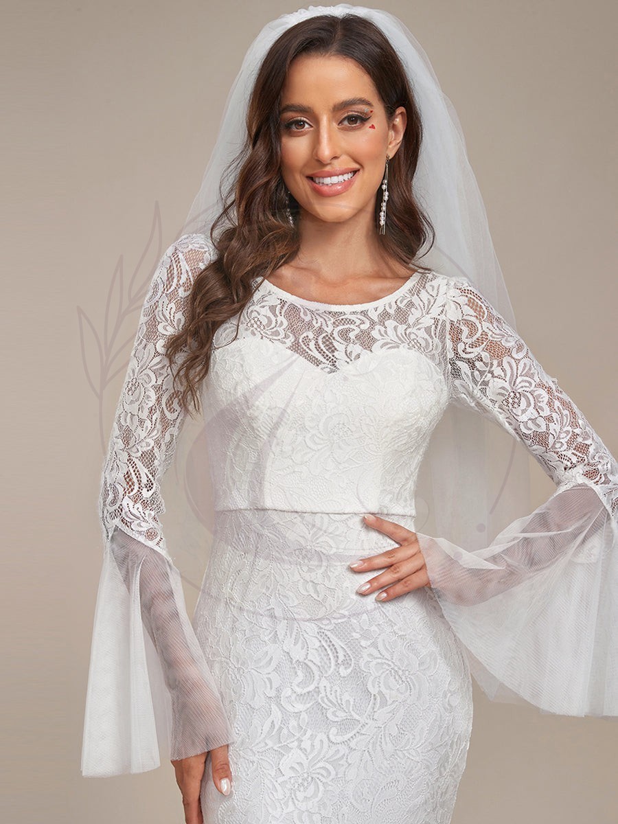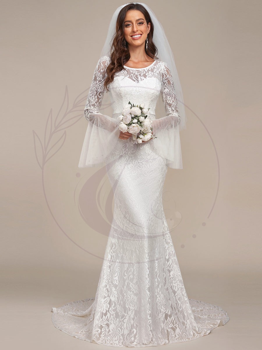 Devenez l’incarnation du raffinement avec notre prestigieuse robe de mariée, parfaite pour votre grand jour. Sa confection en dentelle ornée de motifs floraux se mêle à des manches longues agrémentées de poignets cloche en transparence et un dos échancré. Son design bien pensé dessine votre silhouette tout en débouchant sur une jupe évasée majestueuse, la quintessence même de la grâce. Cette tenue nuptiale est conçue pour sublimer chaque future mariée.