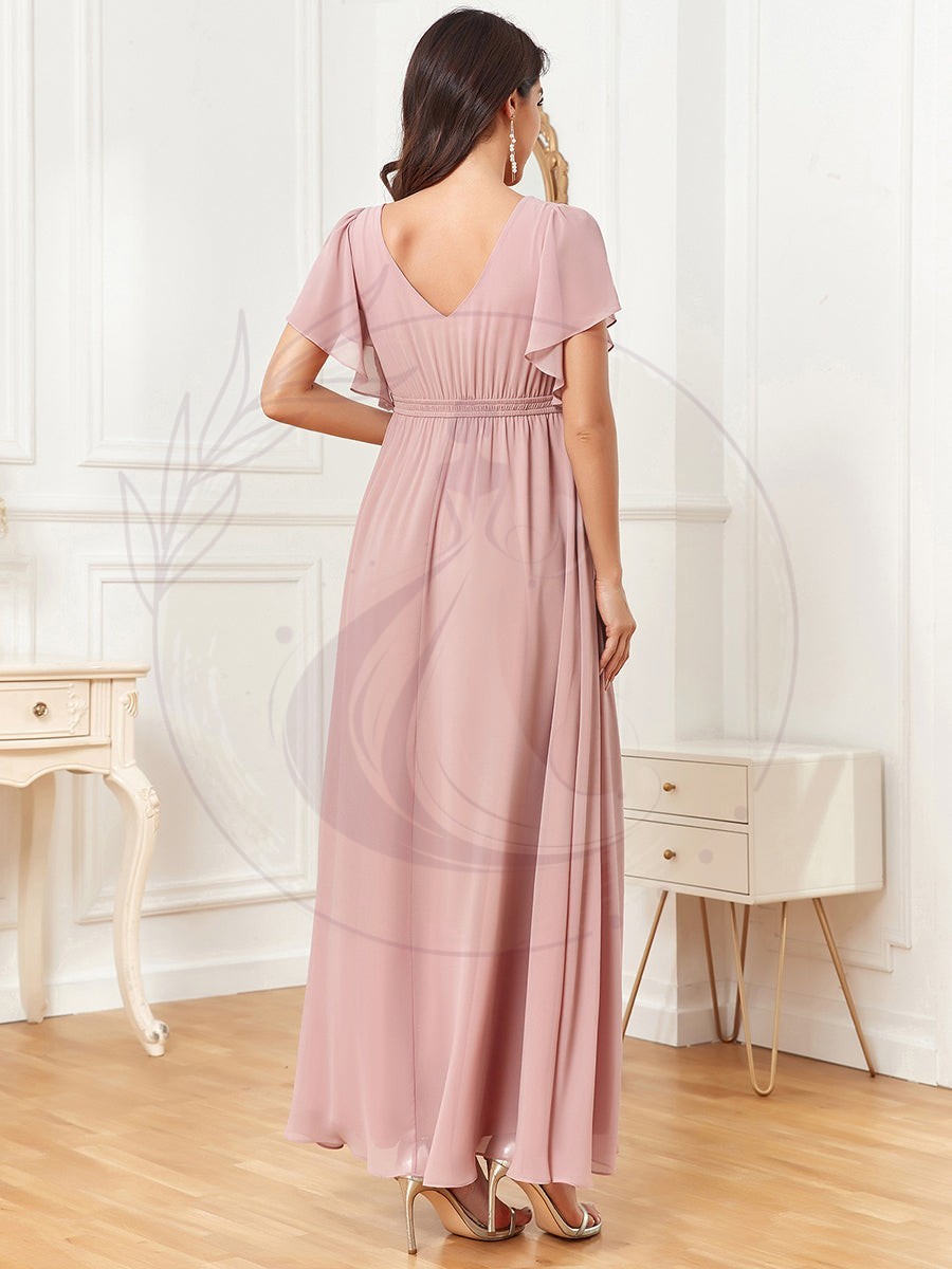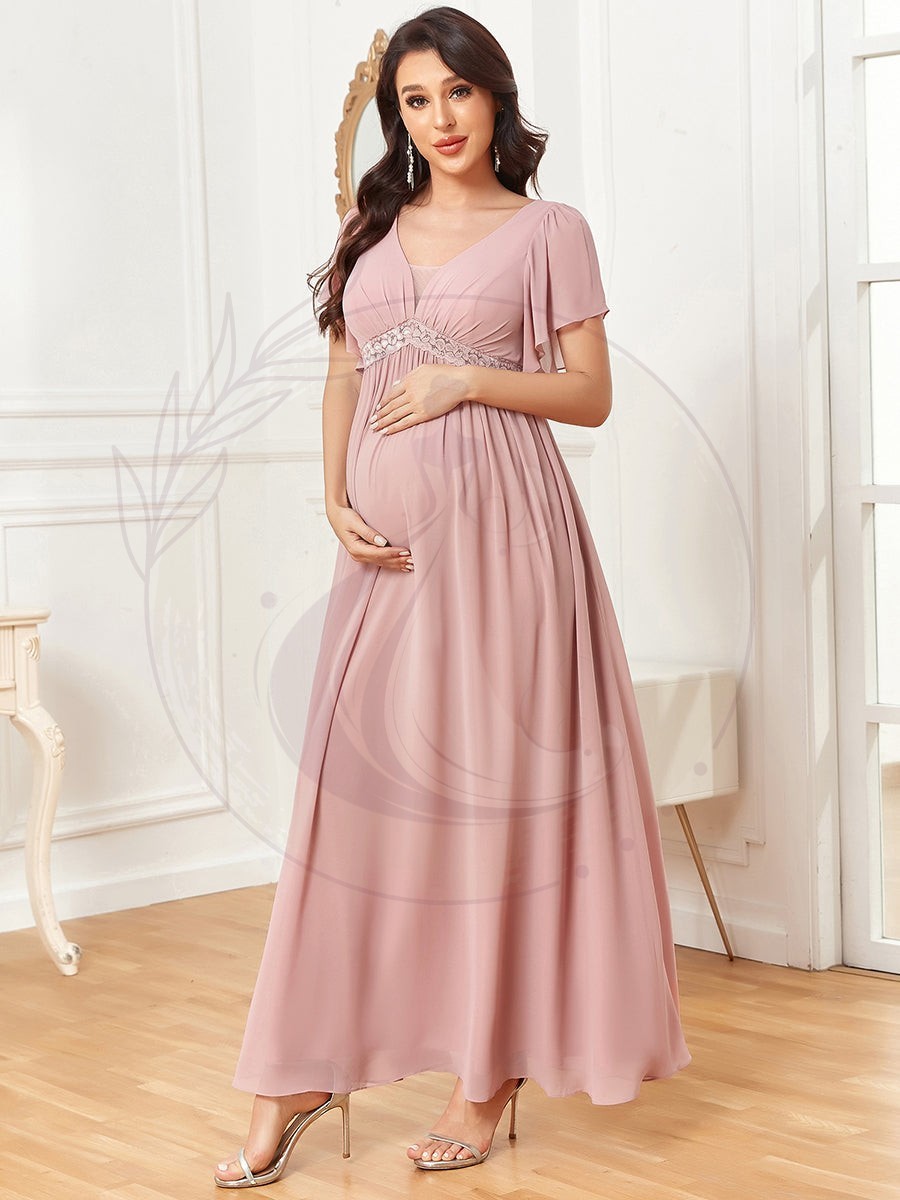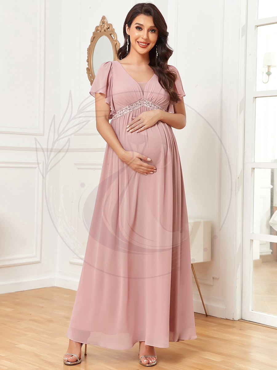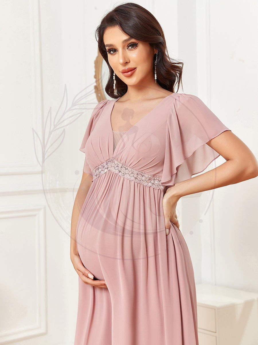 Adoptez l’élégance avec cette tenue prémammaire, parfaitement adaptée aux rondeurs prénatales. Elle arbore un ravissant haut à taille empire en dentelle, se prolongeant par une chute gracieuse jusqu’à ras du sol et dotée de manches bouffantes à volants pour une touche de légèreté. Le décolleté en V ajoute une note raffinée à cette robe de grossesse chic, idéale pour des occasions formelles ou décontractées, réalisée en fine mousseline. Agrémentez votre parure de ballerines, sandales ou escarpins à votre convenance.