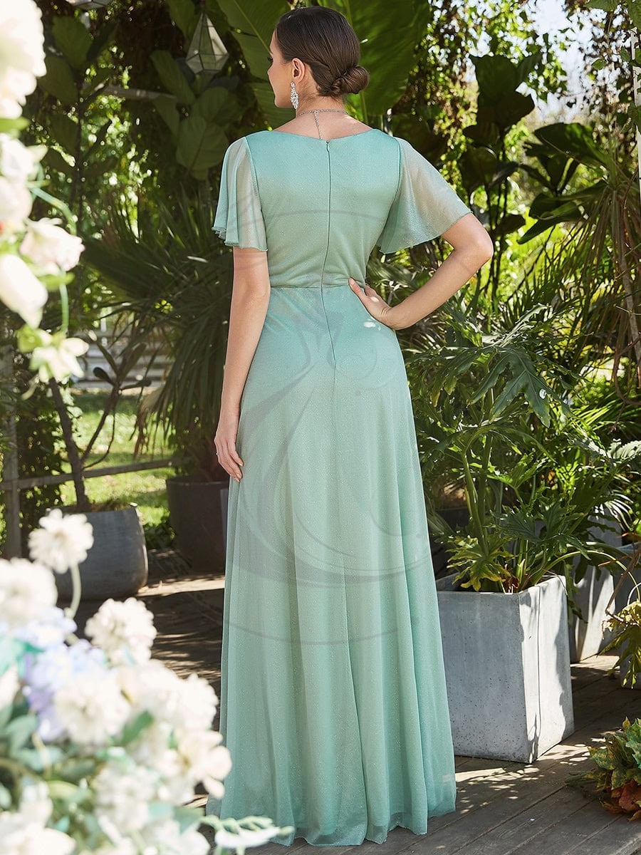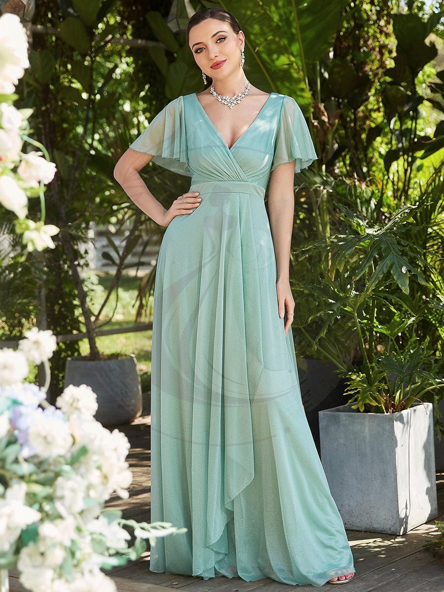Robe de soirée A-ligne scintillante à encolure en V froncée à volants