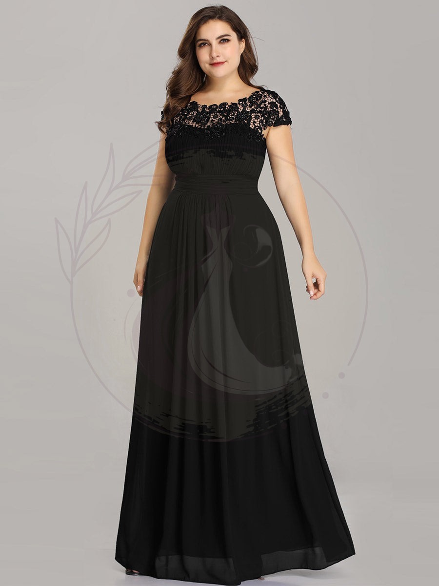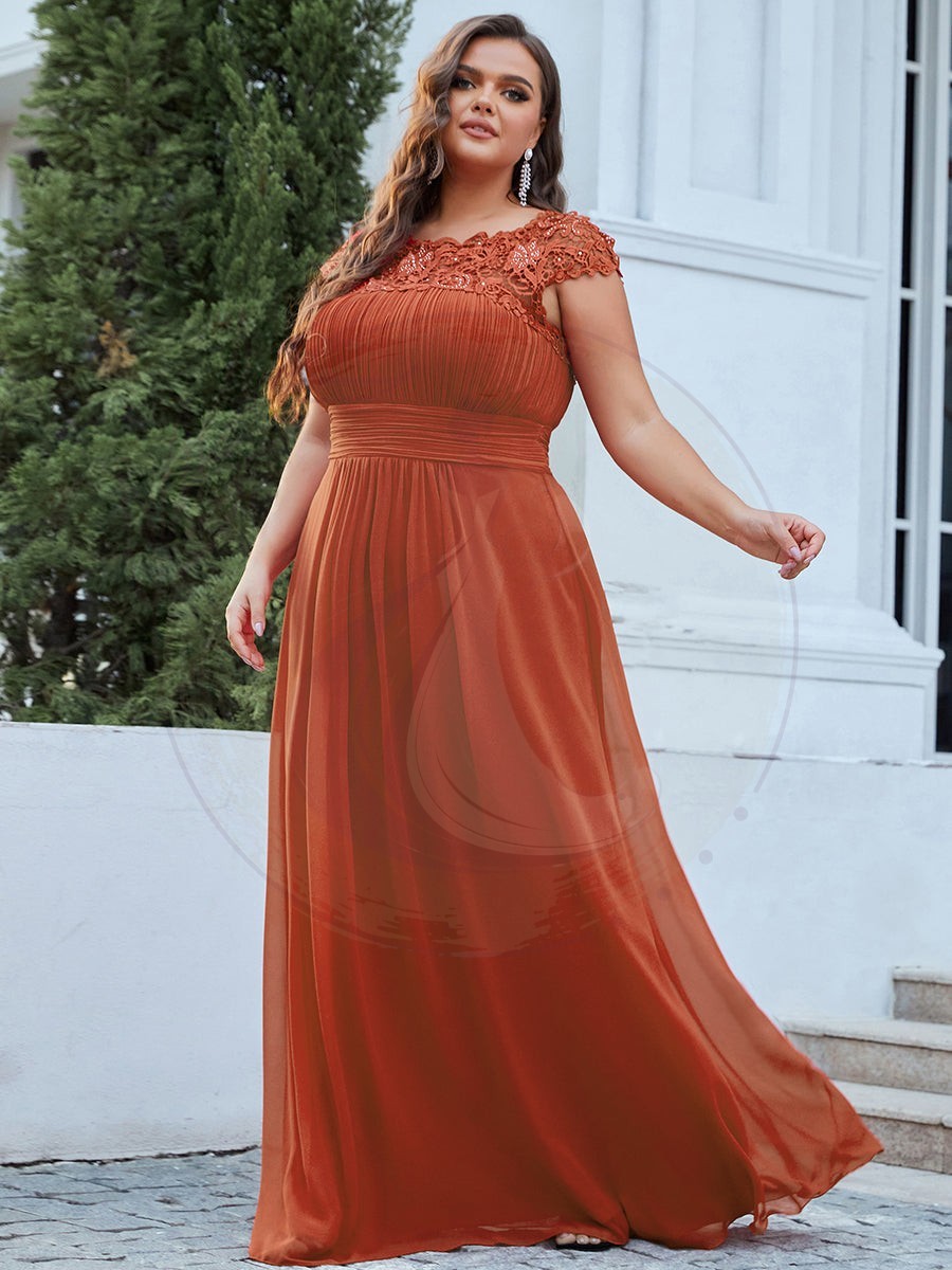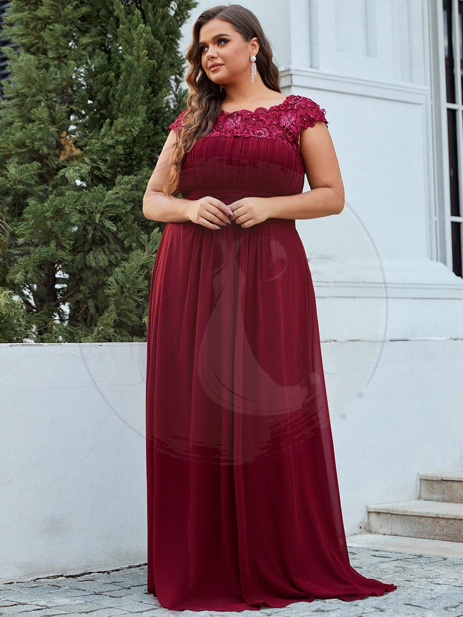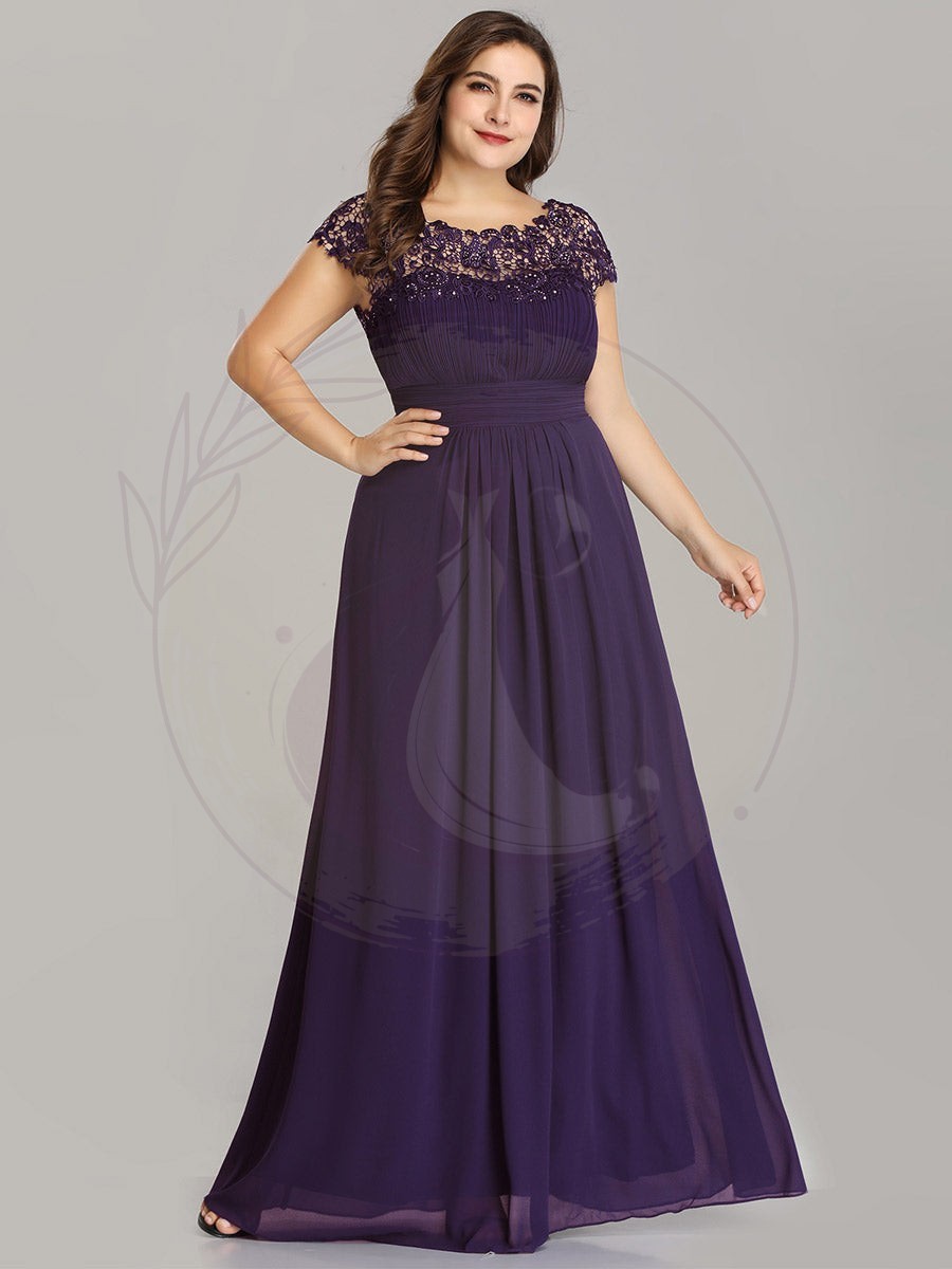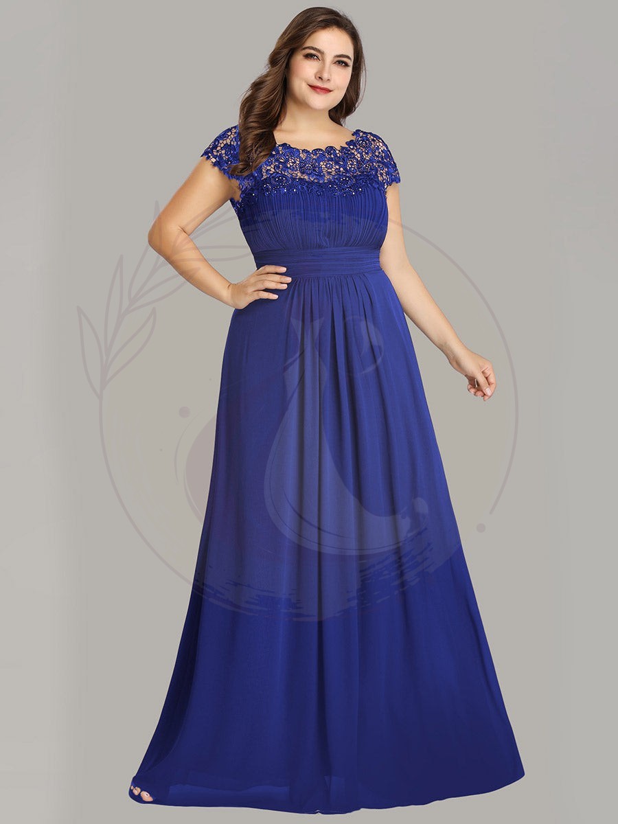 Ravissante robe de gala grande taille en chiffon avec détails de dentelle sur les manches courtes. L’encolure est sublimée par de la dentelle raffinée et de jolis strass, alors que les plis au niveau de la poitrine et de la ceinture dessinent une silhouette élégante. Cette robe longue pour femmes rondes convient à toutes les festivités.