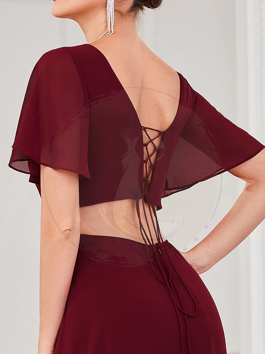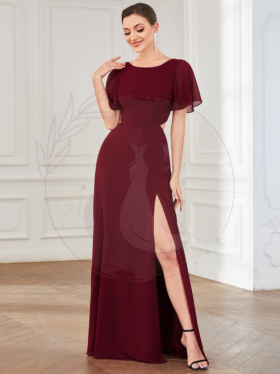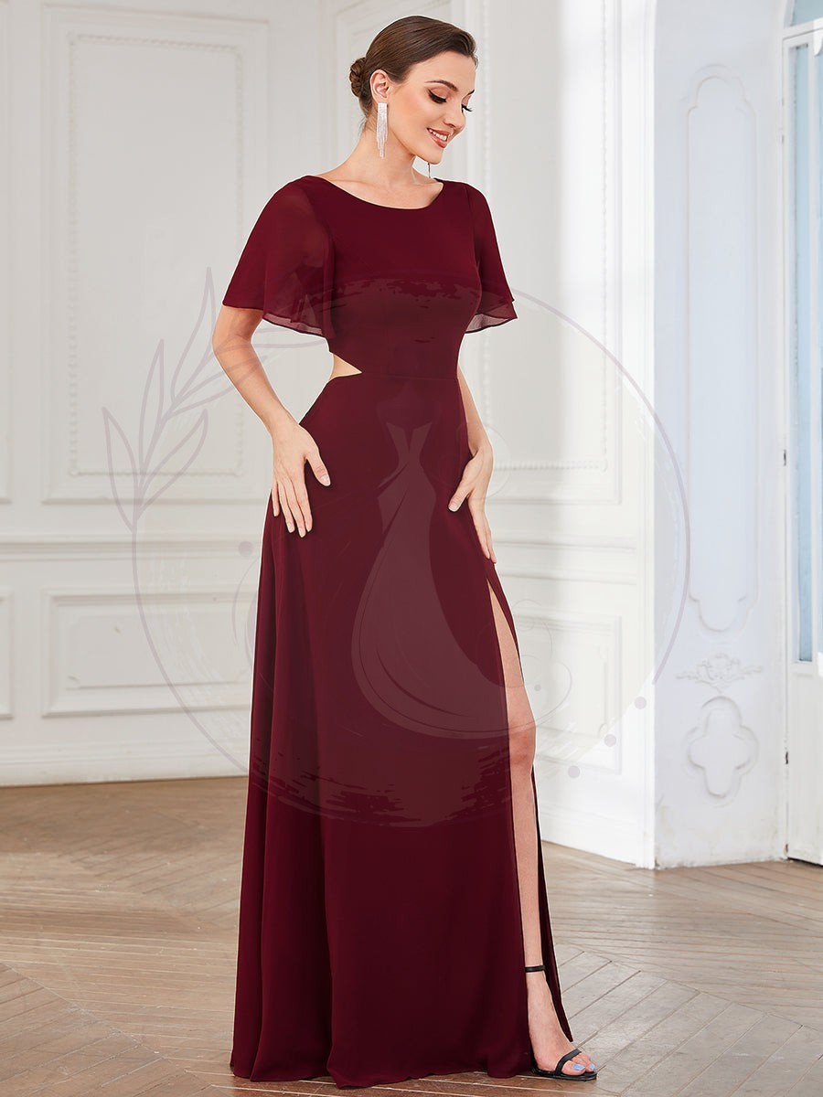 Ravivez l’éclat de votre allure avec cette élégante robe longue de soirée en chiffon de soie, définie par son encolure ronde et ses manches courtes aériennes. Le design ajoute une note d’extravagance avec sa fente avant audacieuse et son tombé fluide jusqu’au sol. Ses découpes latérales et son dos spectaculaire à laçage de type cage offrent une touche de raffinement subtil, donnant l’apparence d’un deux-pièces avec un seul habit. Optez pour une élégance chic avec cette tenue de soirée à la fois bold et confortable.