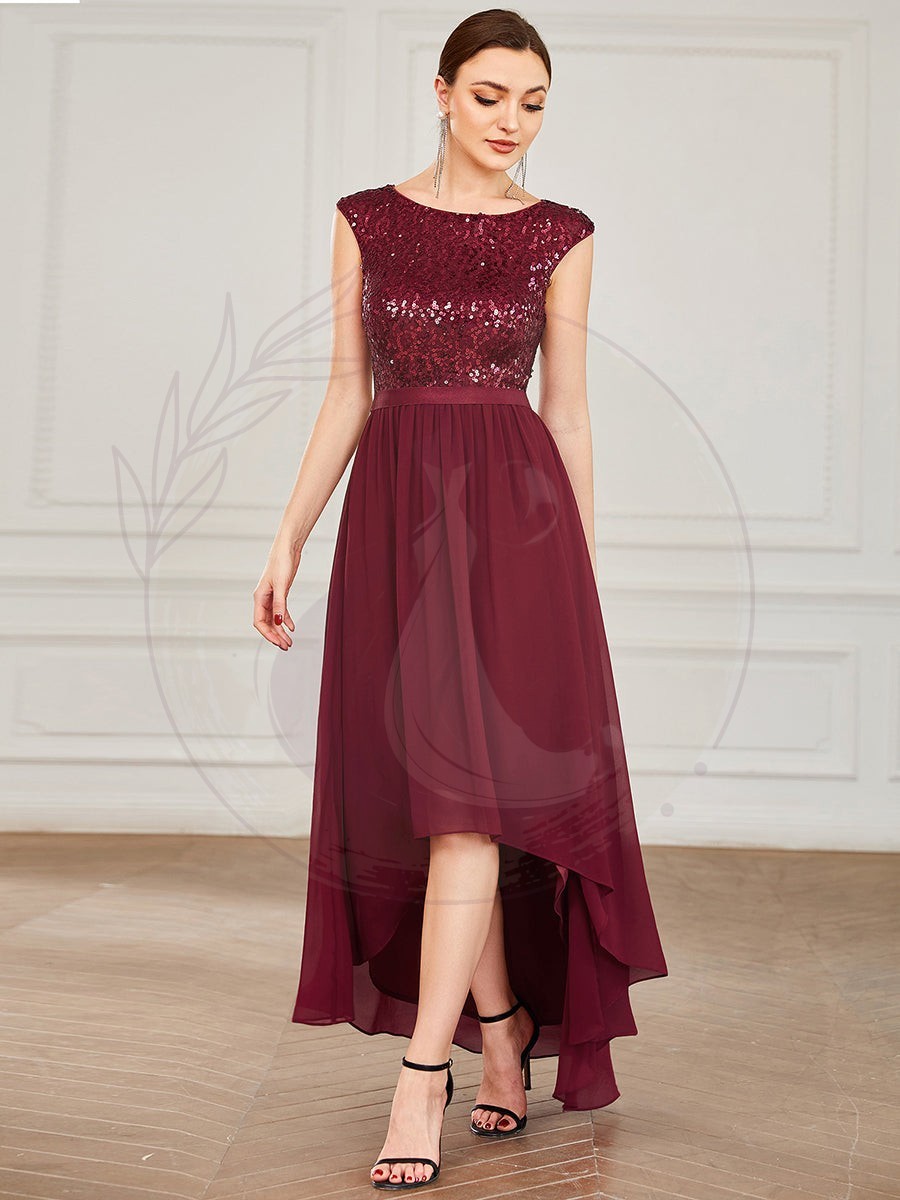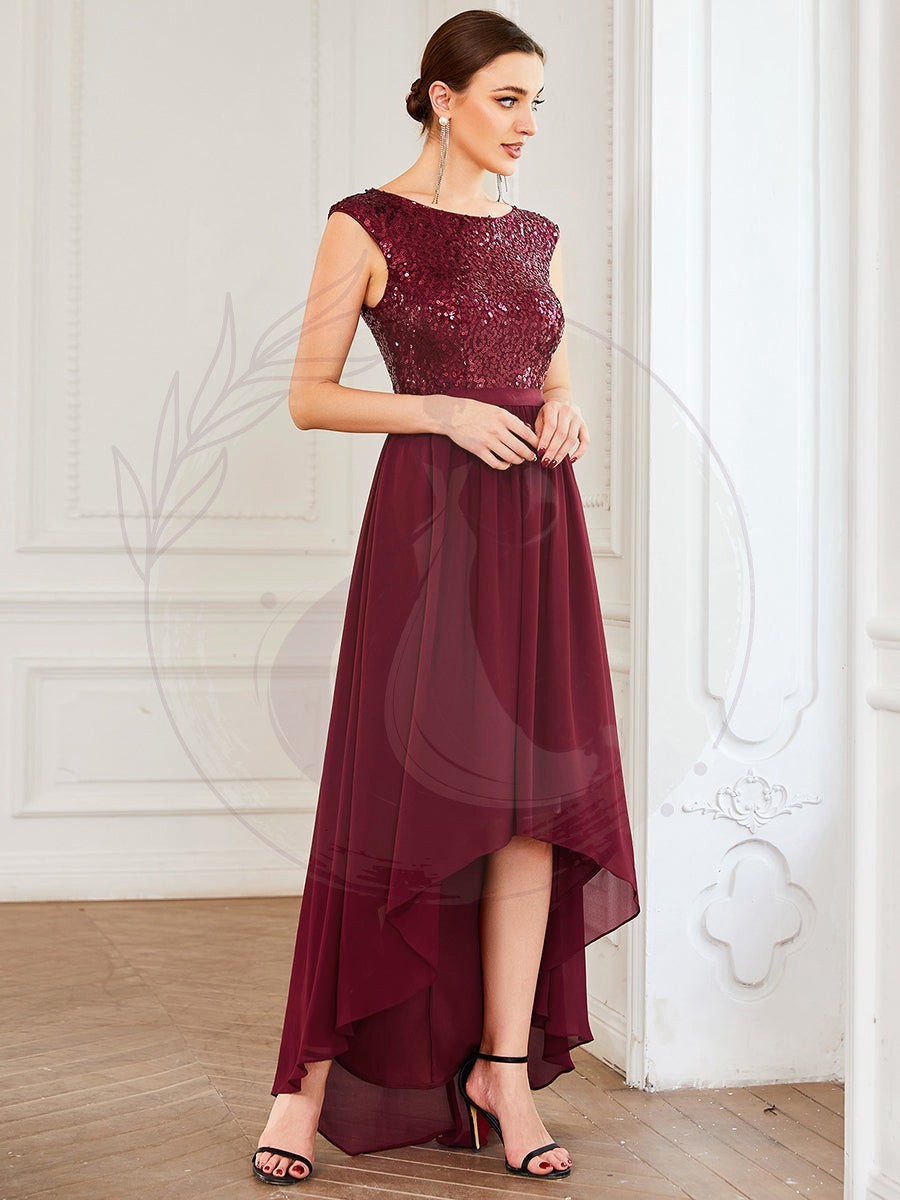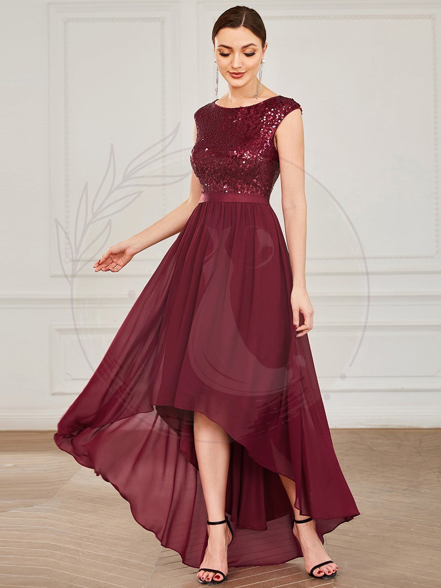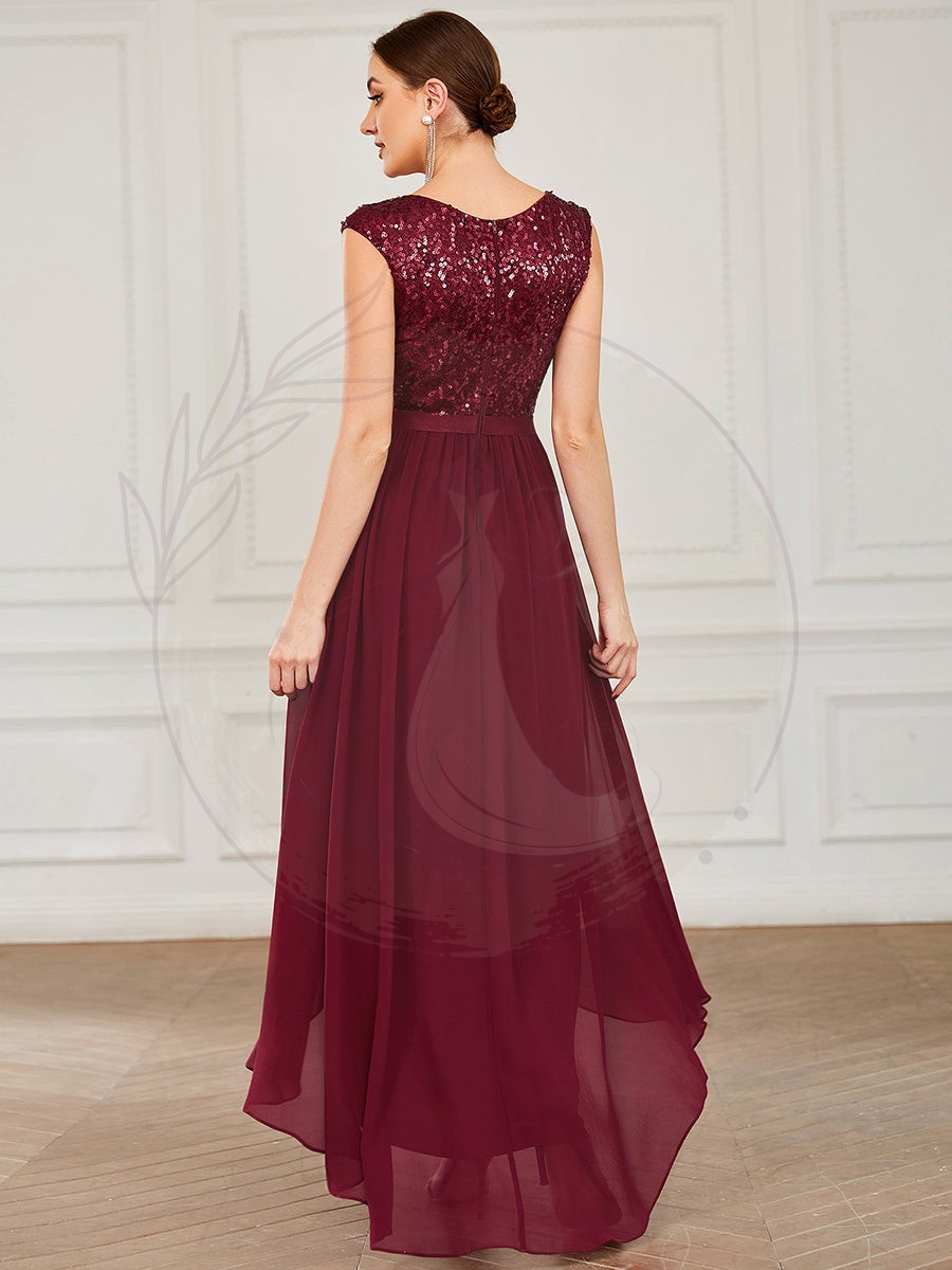 Robe de soirée en mousseline de soie à taille haute et basse avec ruban à sequins sans manches