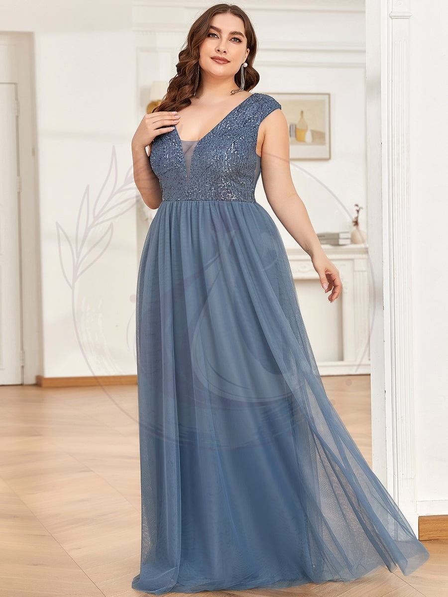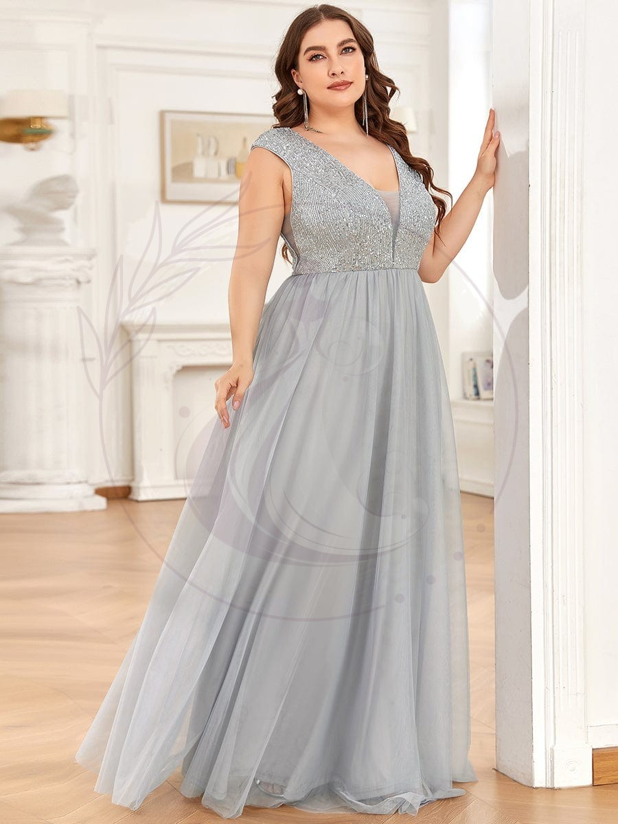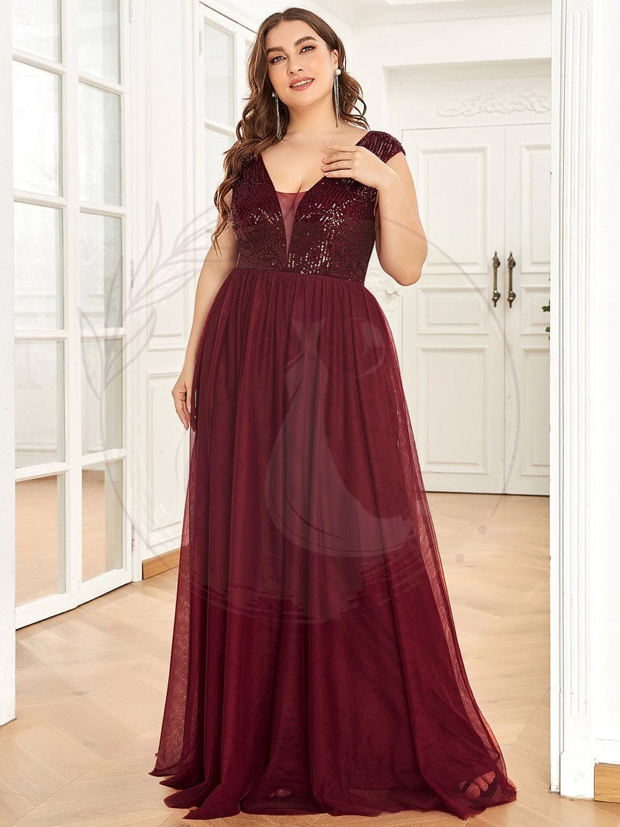Robe de soirée en tulle à encolure en V plongeante à sequins et illusion de grande taille