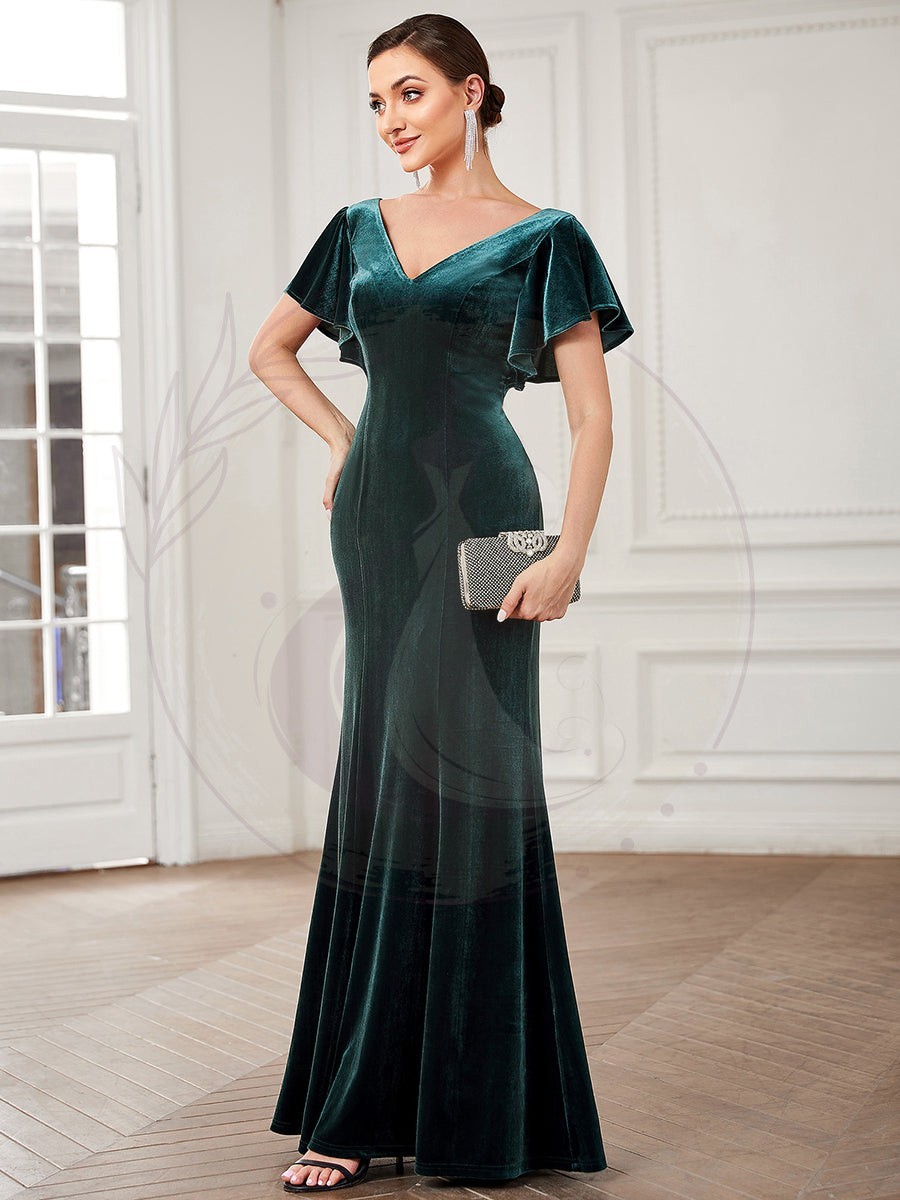Robe de soirée moulante en velours à manches volantées et col en V plongeant dans le dos