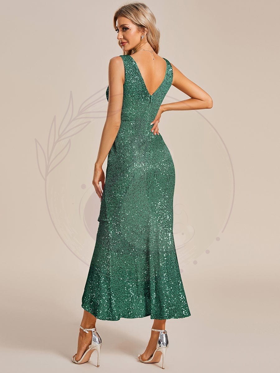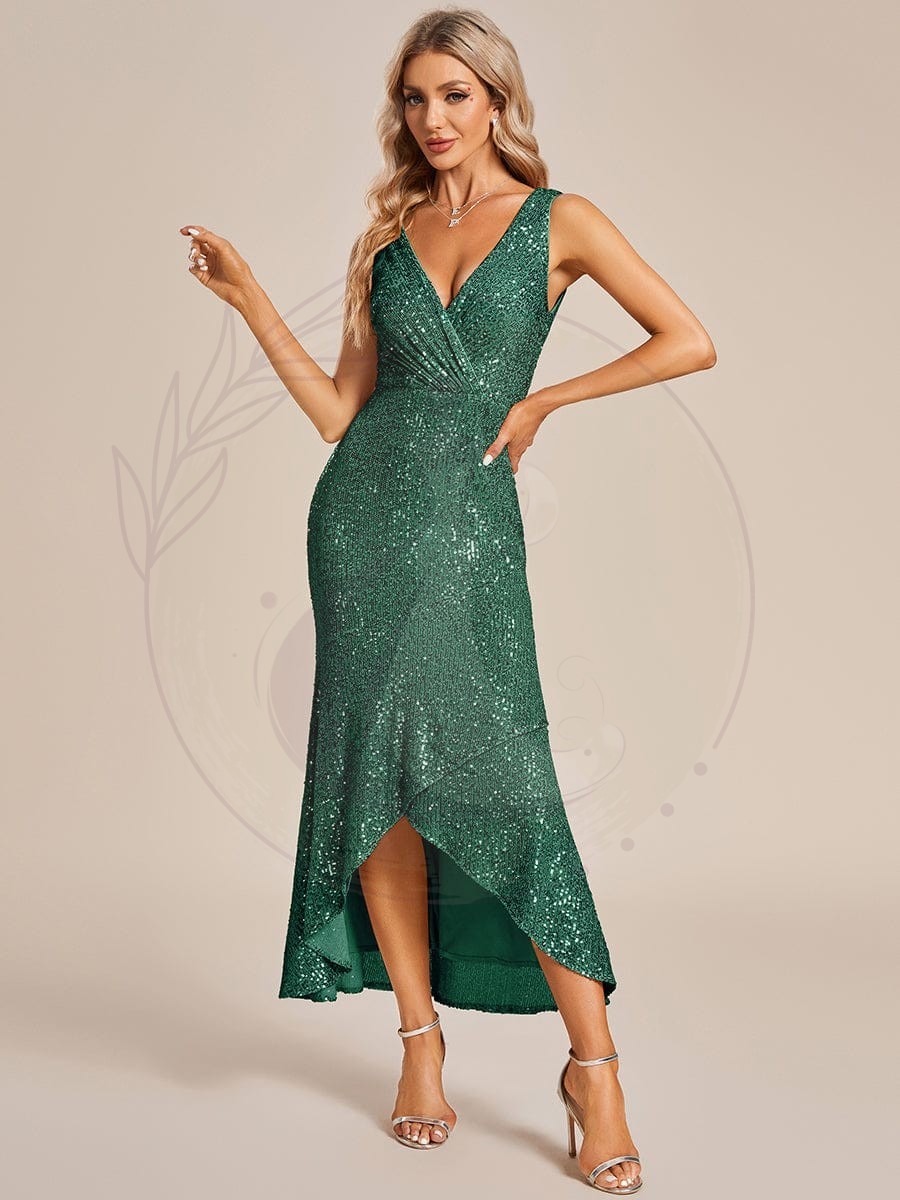 Robe de Soirée Paillettes Ourlet Asymétrique Col V Sans Manches