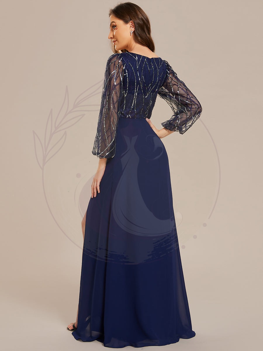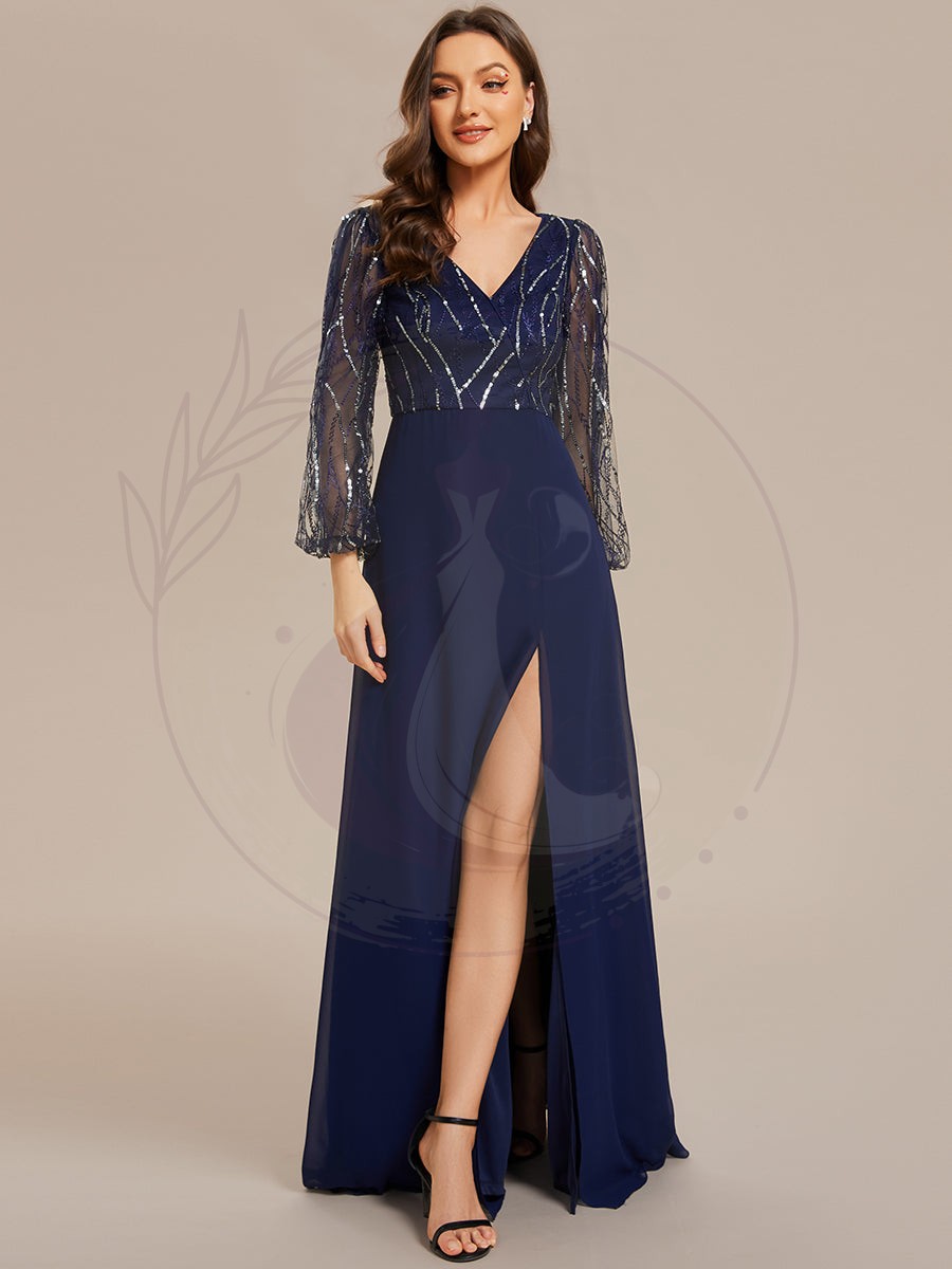 Robe de soirée trapèze en mousseline de soie transparente à paillettes manches longues fente haute