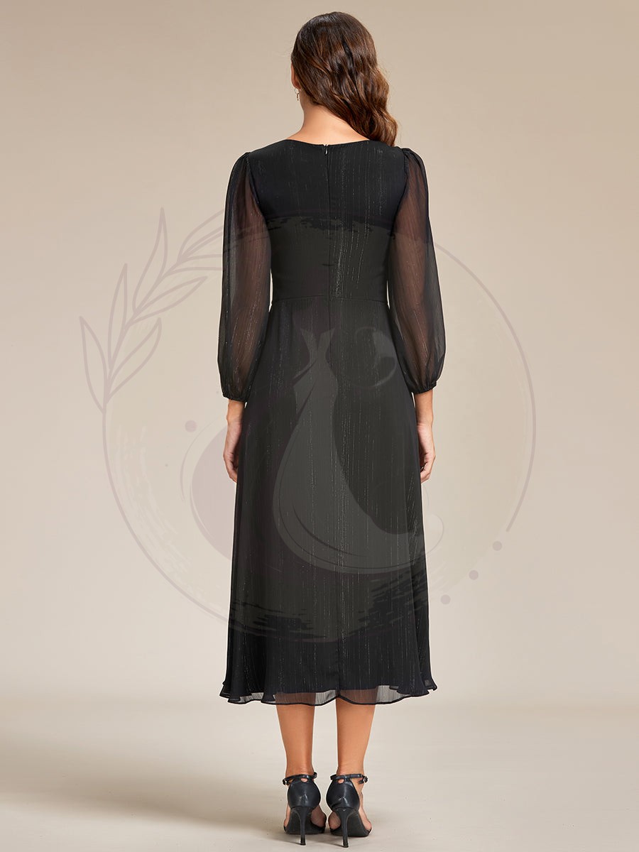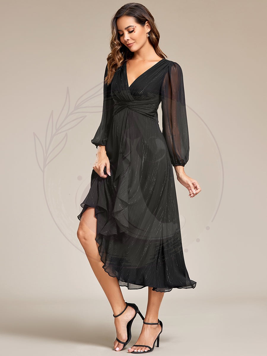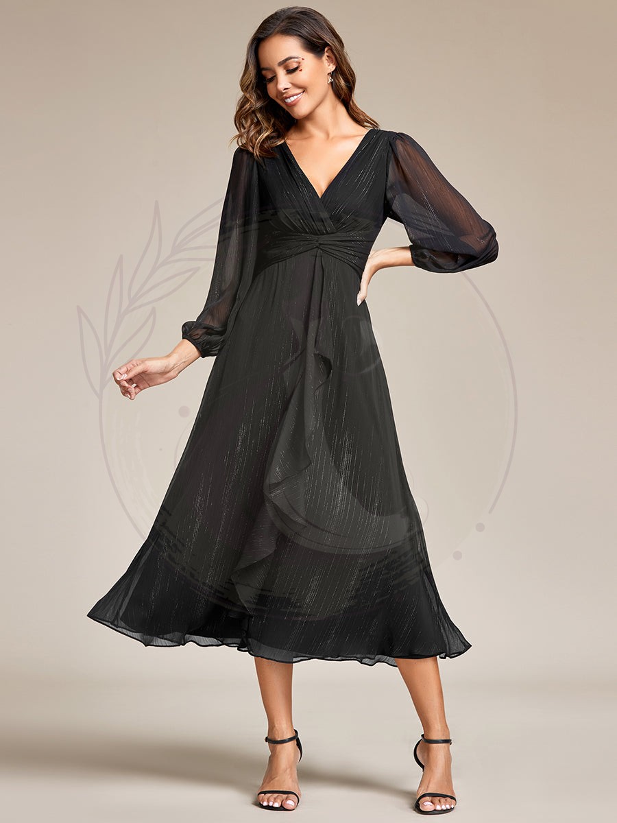 Robe de soirée trapèze scintillante à manches longues et col en V en mousseline de soie avec n?ud torsadé