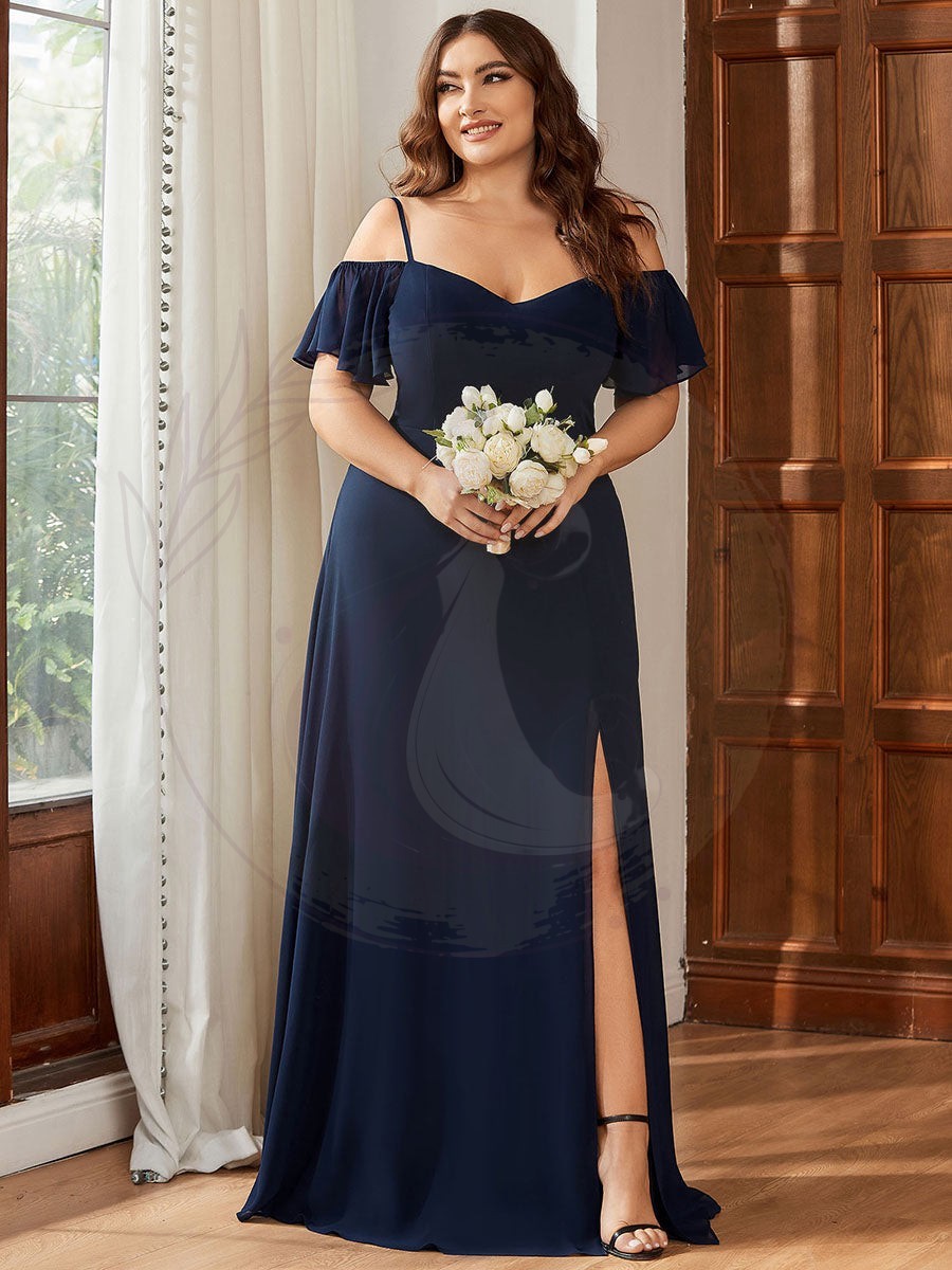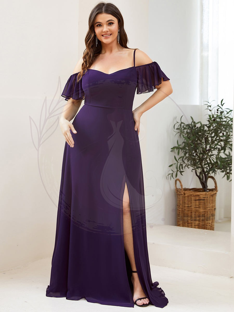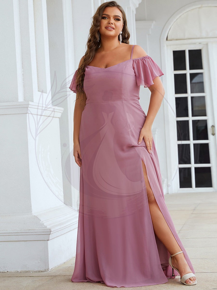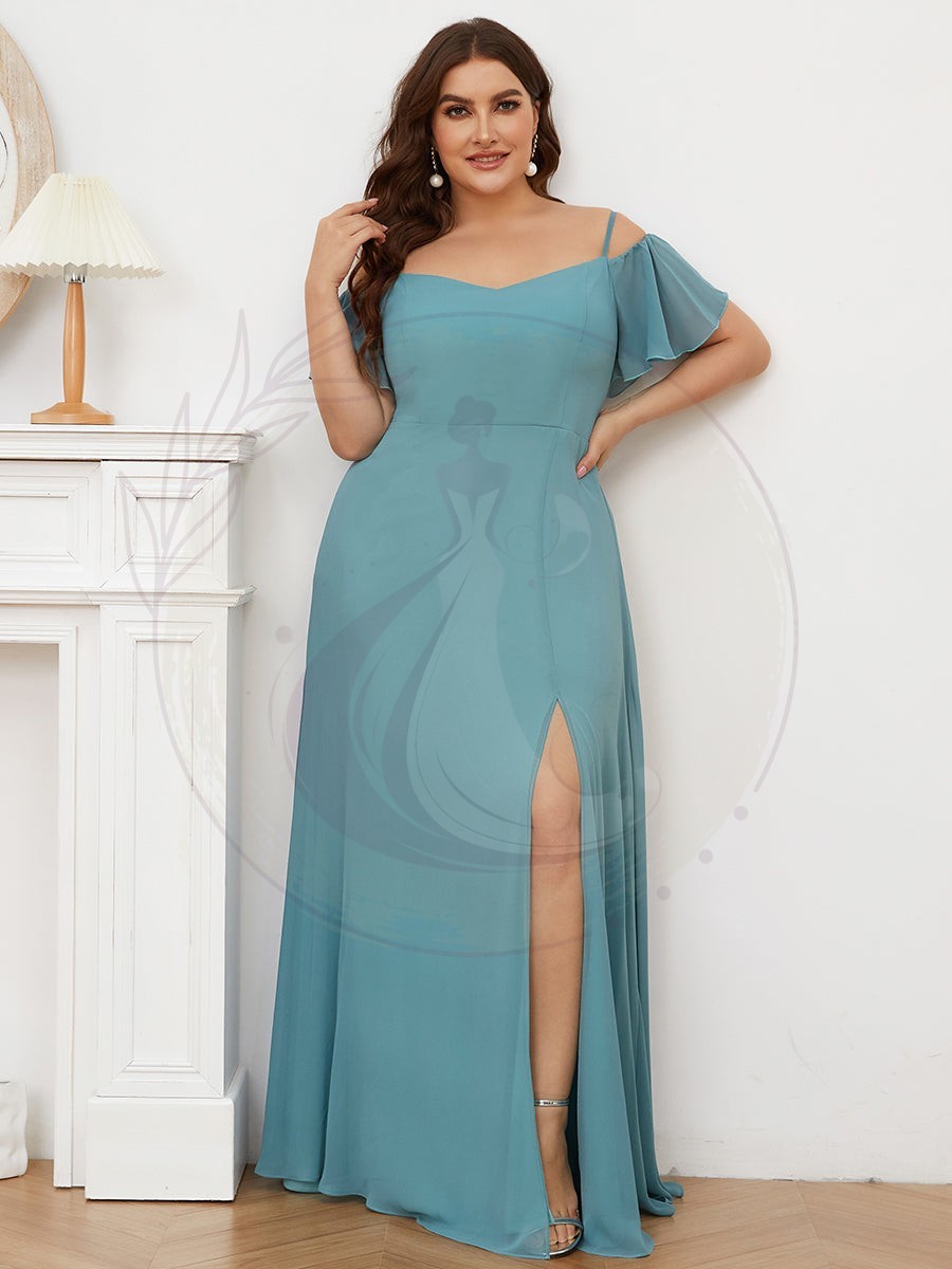 Révélez votre éclat avec cette magnifique robe de demoiselle d’honneur spécialement conçue pour les silhouettes plus généreuses. Sublimez votre allure grâce à son décolleté plongeant en V, ses manches courtes et évasées, ainsi que sa coupe trapèze élégante. Sa longueur ras du sol s’associe à une fente avant audacieuse qui dévoilera subtilement vos jambes. De fines bretelles et un captivant effet épaules dénudées complètent ce modèle séduisant.