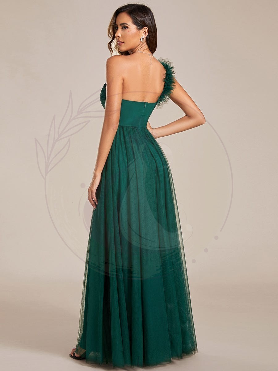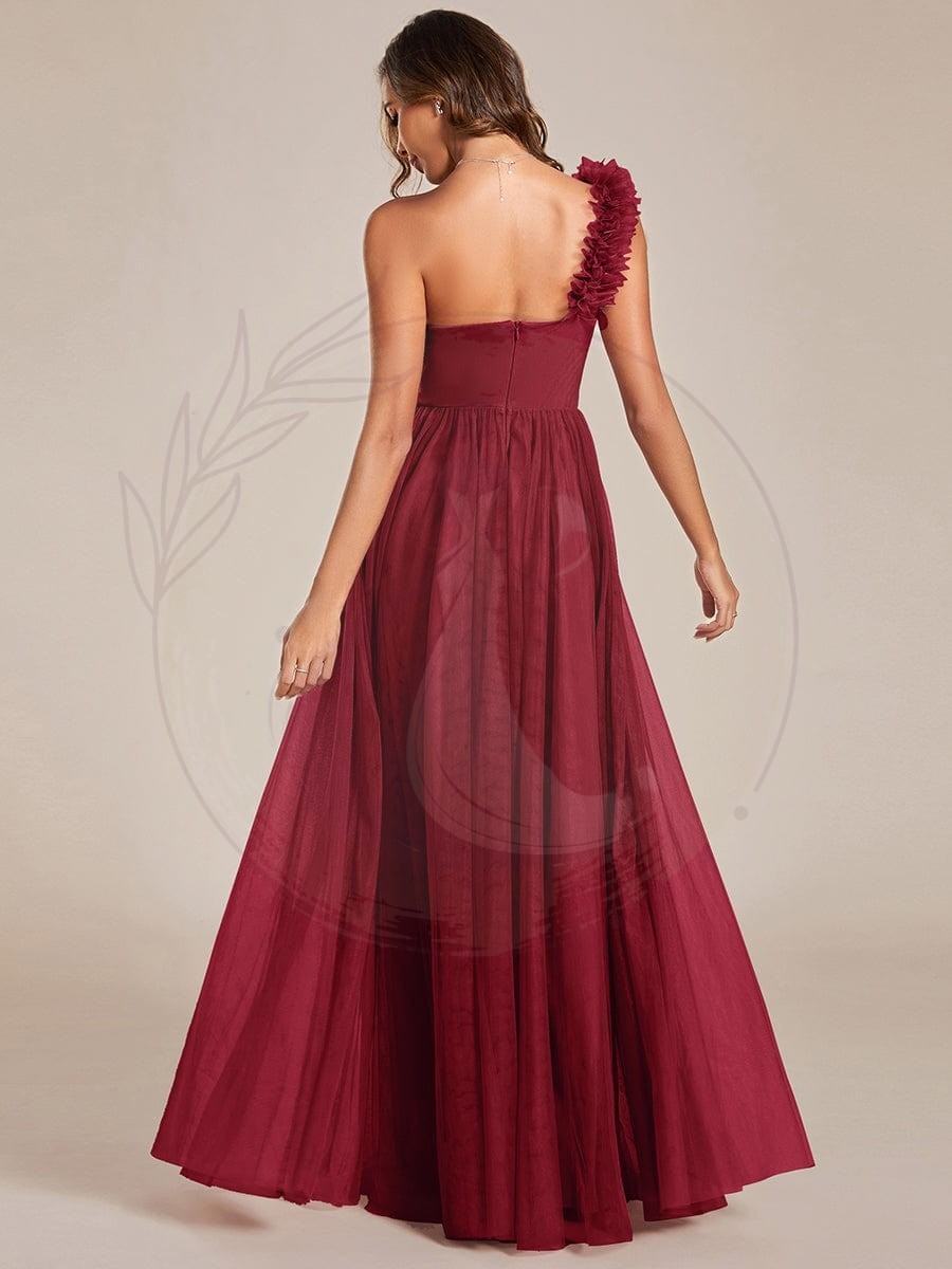 Robe demoiselle d’honneur à une épaule appliquée en tulle avec une fente haute