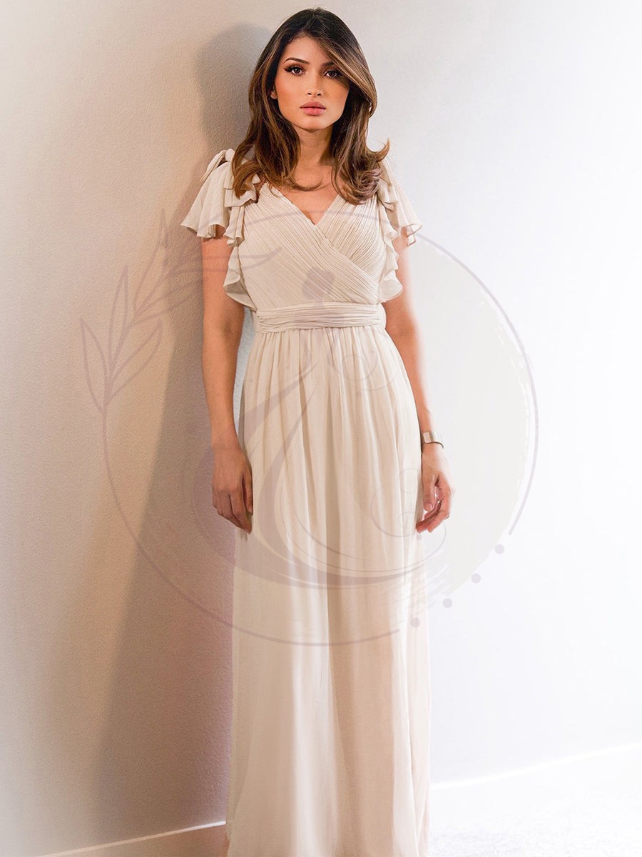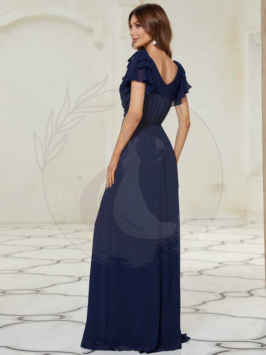 élégante robe de demoiselle d’honneur en mousseline longue avec des manches à volants et un décolleté en V profond. Des fronces délicates dans le buste et la taille créent une silhouette flatteuse. Elle est parfaite pour les mariages, la soirée, le cocktail, le bal, le gala, le baptême,la rentrée à l’école, la remise des diplômes et toute autre affaire formelle!